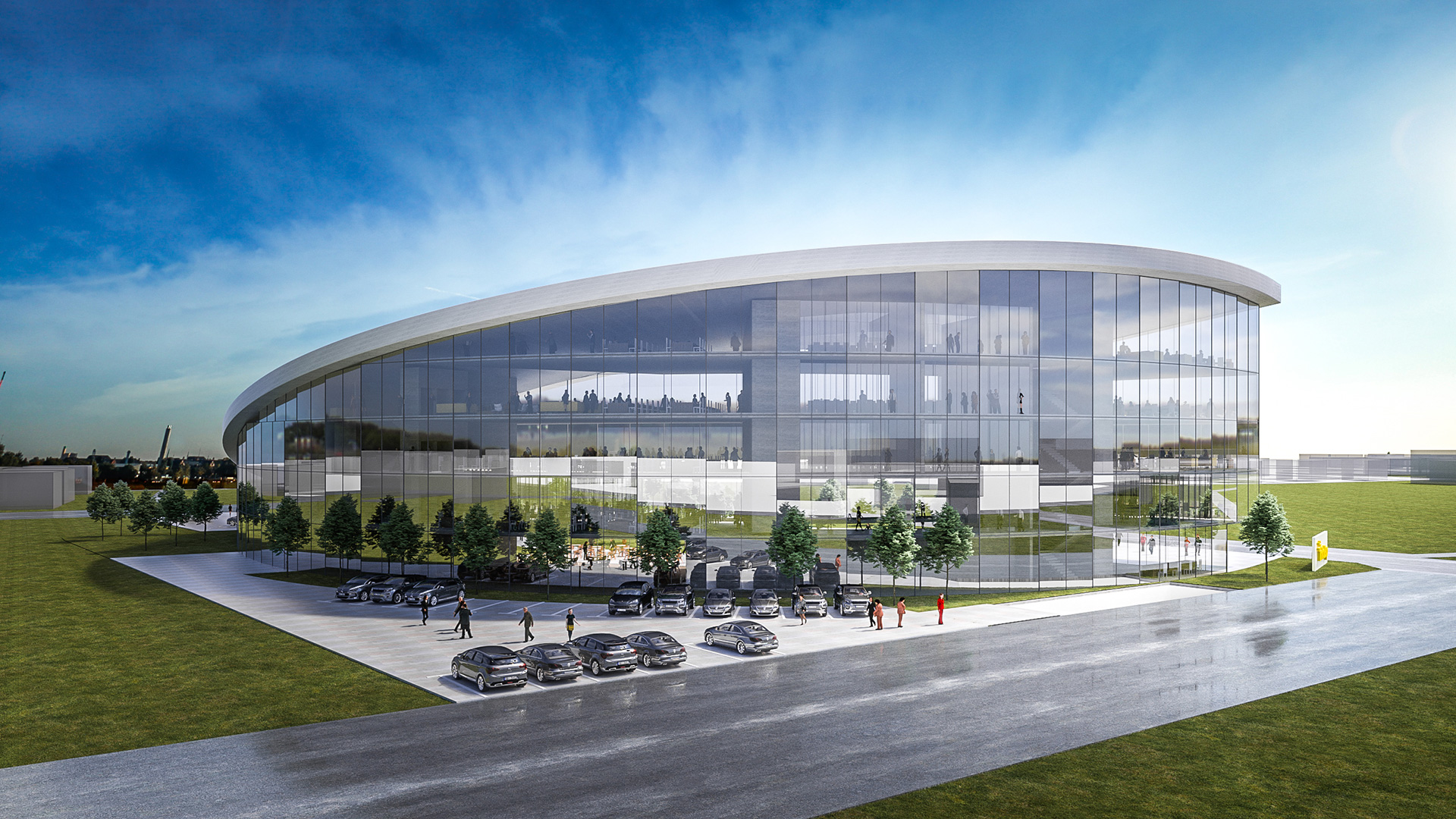 Projekt je oblikovan kao prepoznatljiv orijentir unutar šireg konteksta, ali bez agresivne dominacije nad okolišem. Arhitektura komunicira profesionalnost, tehnološku inovativnost i suvremeni poslovni identitet, dok istodobno zadržava mjerilo prilagođeno korisniku i javnom prostoru. Volumenska razrada i diferencijacija fasadnih zona jasno sugeriraju funkcionalnu organizaciju unutar kompleksa, naglašavajući ulazne i reprezentativne dijelove te uredske segmente objekta.