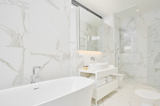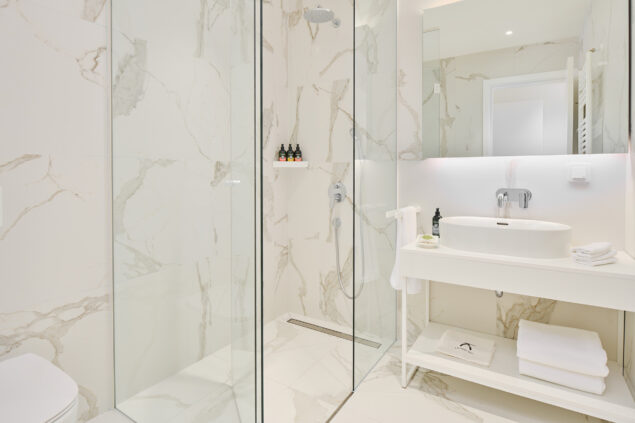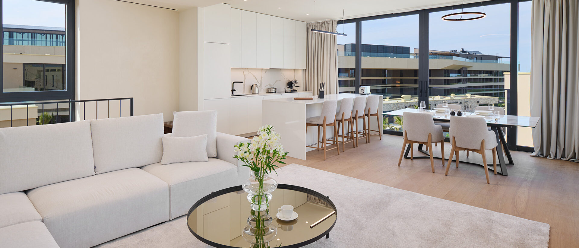 Privatne zone, uključujući lođe, spavaće sobe i sanitarne prostore, dizajnirane su u skladu s jasnom funkcionalnom hijerarhijom, osiguravajući osjećaj mira i odmaka od aktivnijih dijelova interijera. Racionalno postavljeni elementi namještaja i suptilna rasvjeta dodatno naglašavaju arhitektonsku jasnoću i doprinose trajnoj ugodi boravka.