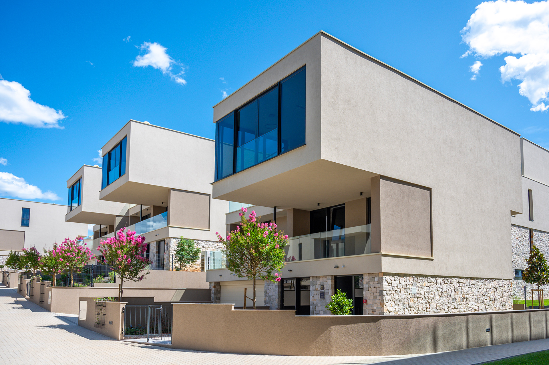 Raznolikost volumena i pažljivo modulirana fasada osiguravaju da se vile ne nameću pejzažu nego ga nadopunjuju – arhitektura postaje nenametljiv partner prirodi.