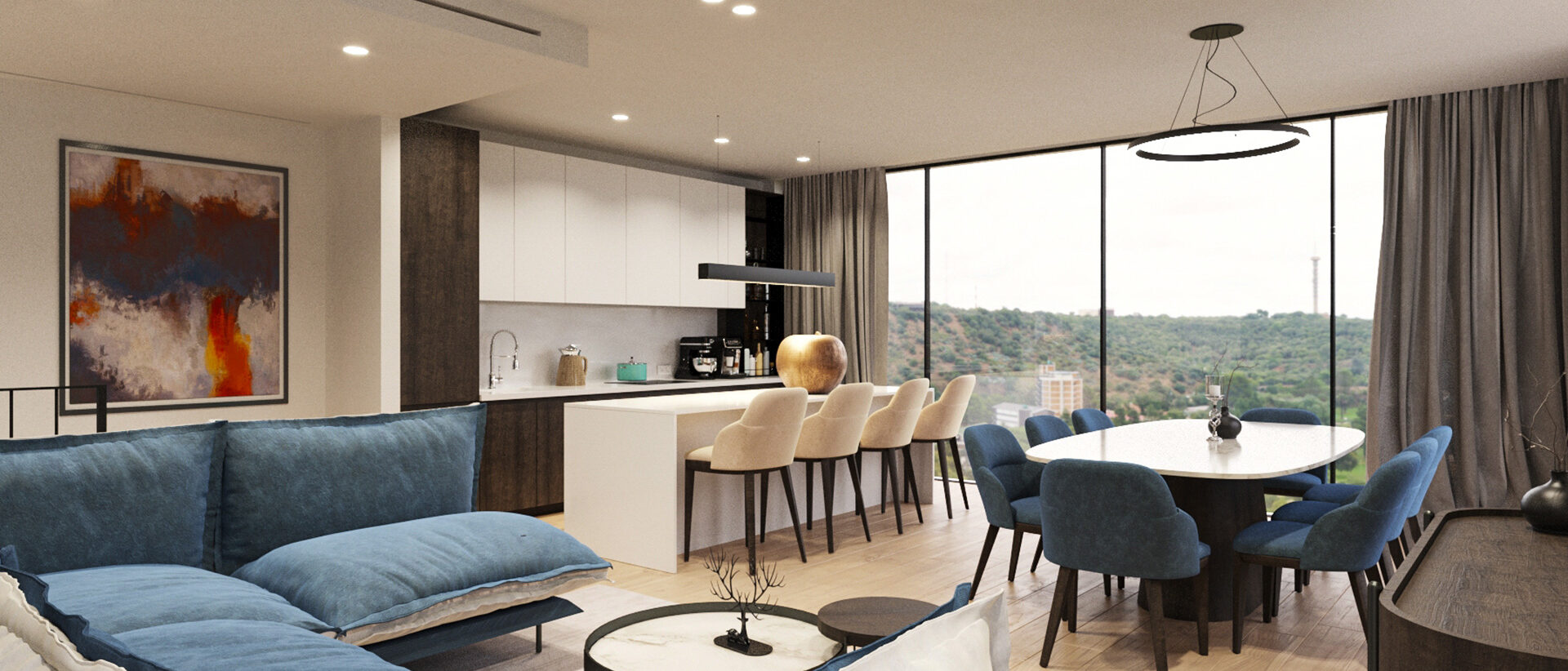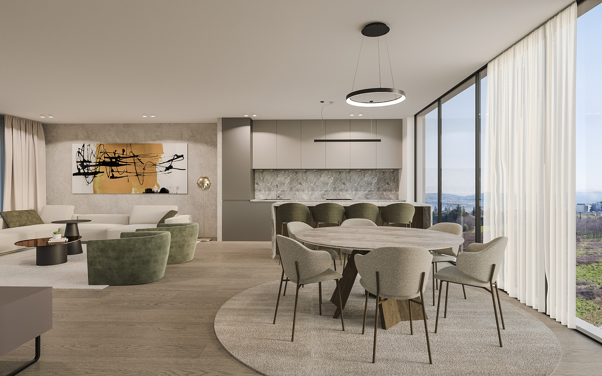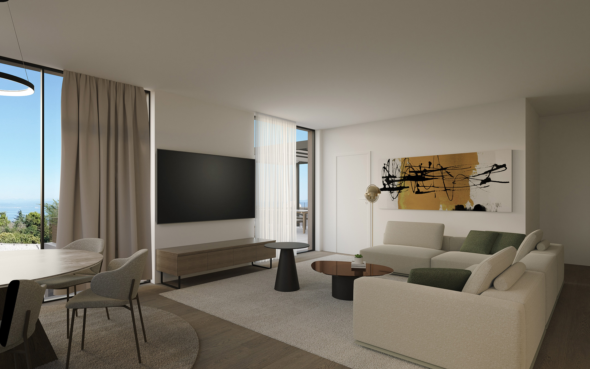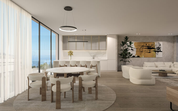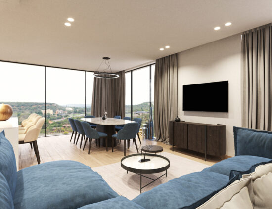 Dnevni prostori zamišljeni su kao otvorene, fluidne cjeline u kojima se kuhinja, blagovaonica i boravak stapaju u jedinstven ambijent. Velike staklene stijene omogućuju obilje prirodnog svjetla te snažnu vizualnu povezanost s terasama i okolišem. Interijer je oblikovan u neutralnoj paleti tonova – toplih bež i sivih nijansi – uz naglaske u tamnijem drvu, kamenu i metalnim detaljima. Namještaj je suvremenih, čistih linija, s naglaskom na udobnosti i taktilnosti materijala. Rasvjeta je slojevita: diskretna ugradbena rasvjeta kombinira se s dekorativnim visilicama i ambijentalnim LED trakama koje naglašavaju arhitektonske elemente.