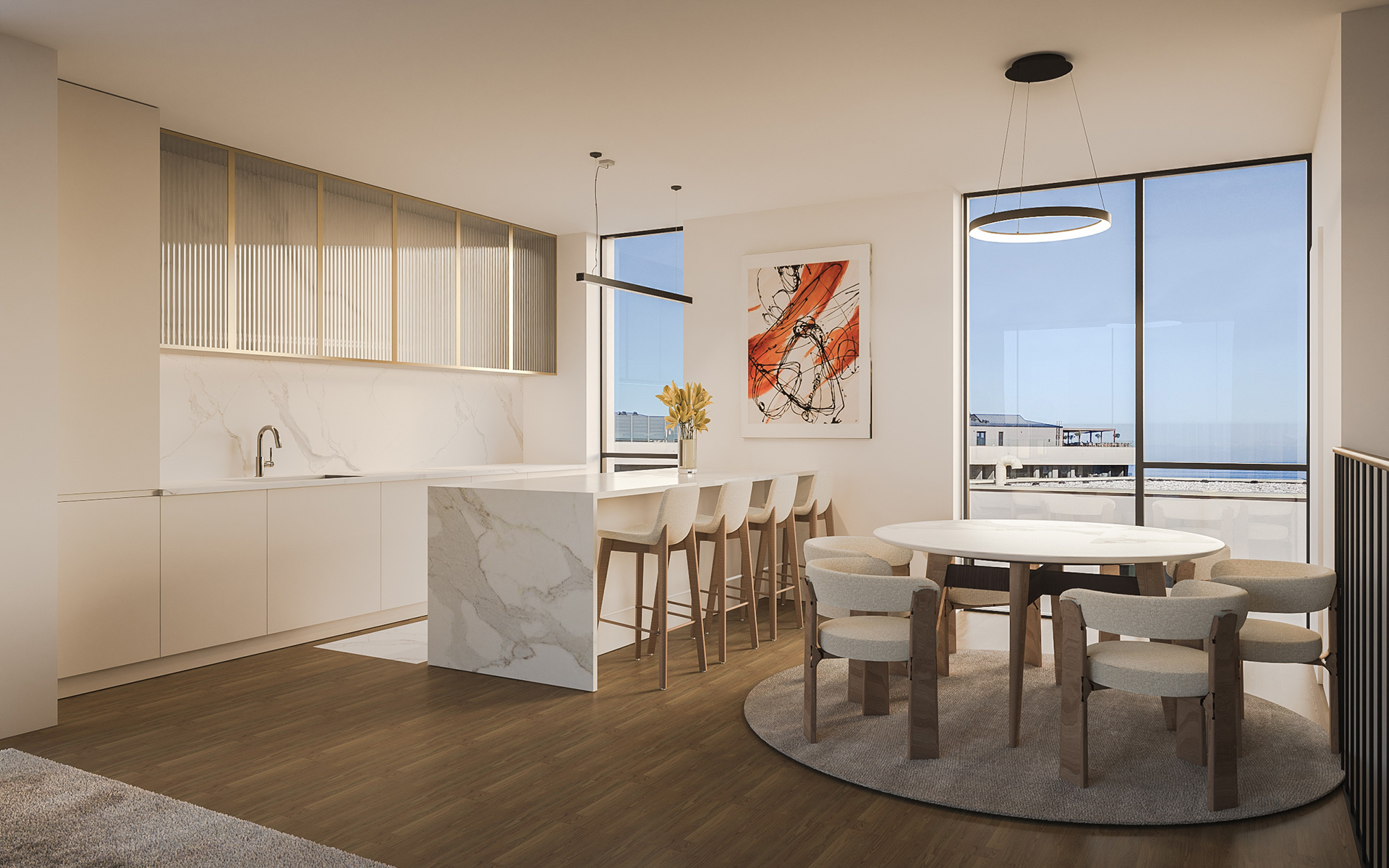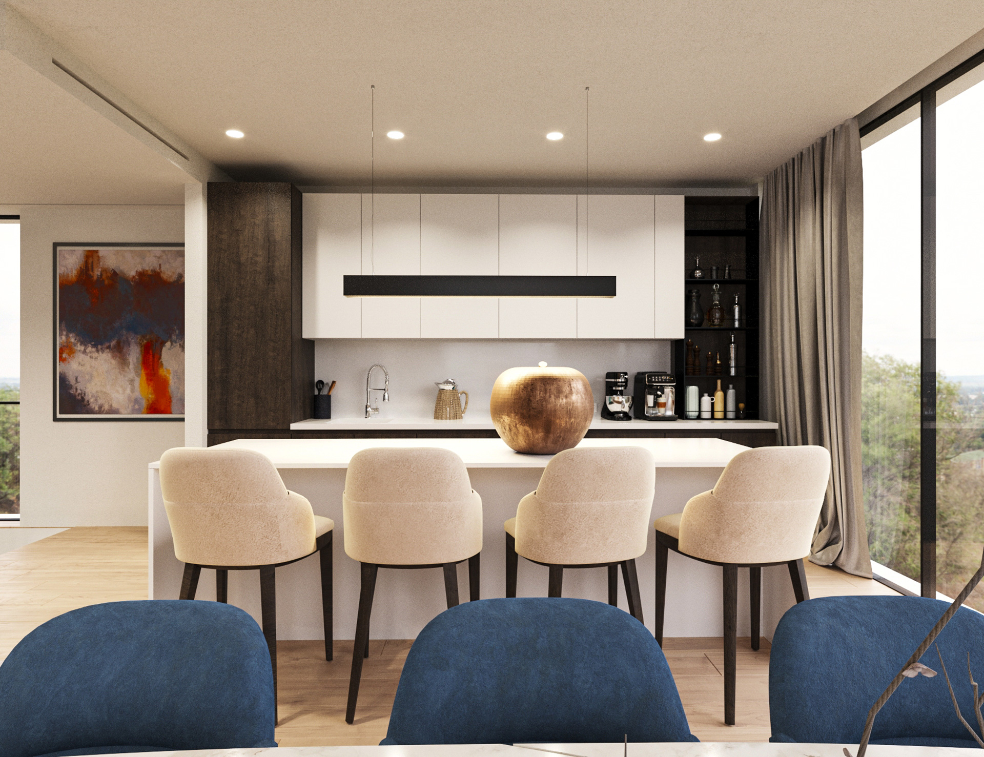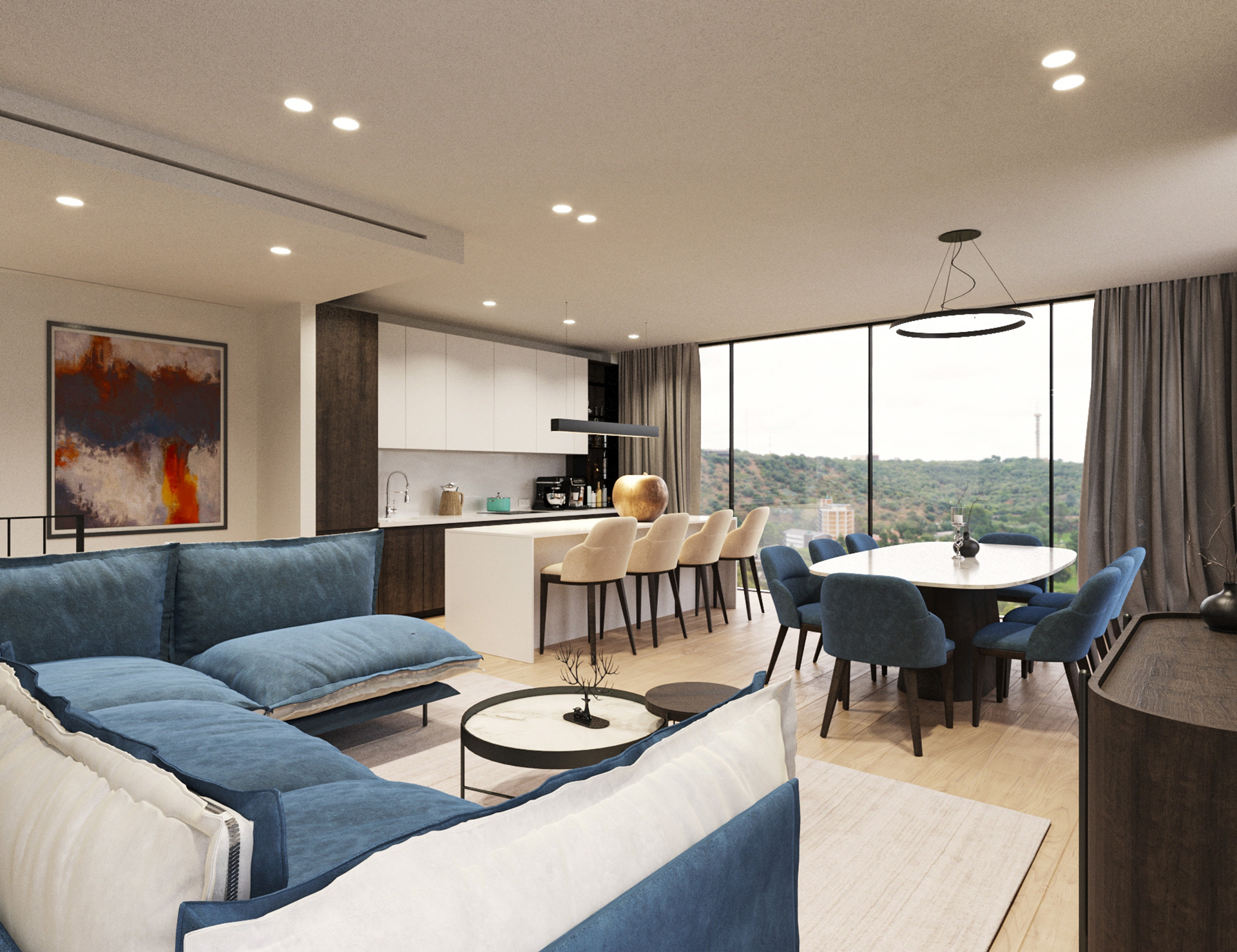 Dnevni prostori zamišljeni su kao otvorene, fluidne cjeline u kojima se kuhinja, blagovaonica i boravak stapaju u jedinstven ambijent. Velike staklene stijene omogućuju obilje prirodnog svjetla te snažnu vizualnu povezanost s terasama i okolišem. Interijer je oblikovan u neutralnoj paleti tonova – toplih bež i sivih nijansi – uz naglaske u tamnijem drvu, kamenu i metalnim detaljima. Namještaj je suvremenih, čistih linija, s naglaskom na udobnosti i taktilnosti materijala. Rasvjeta je slojevita: diskretna ugradbena rasvjeta kombinira se s dekorativnim visilicama i ambijentalnim LED trakama koje naglašavaju arhitektonske elemente.