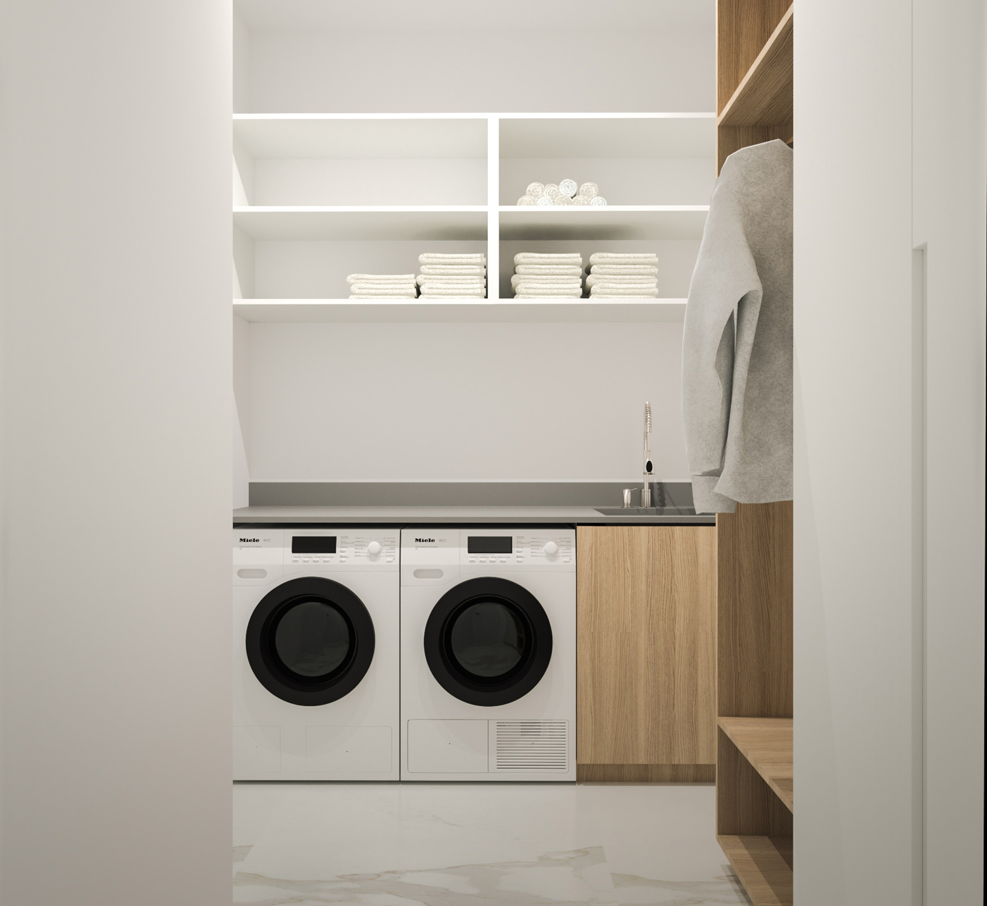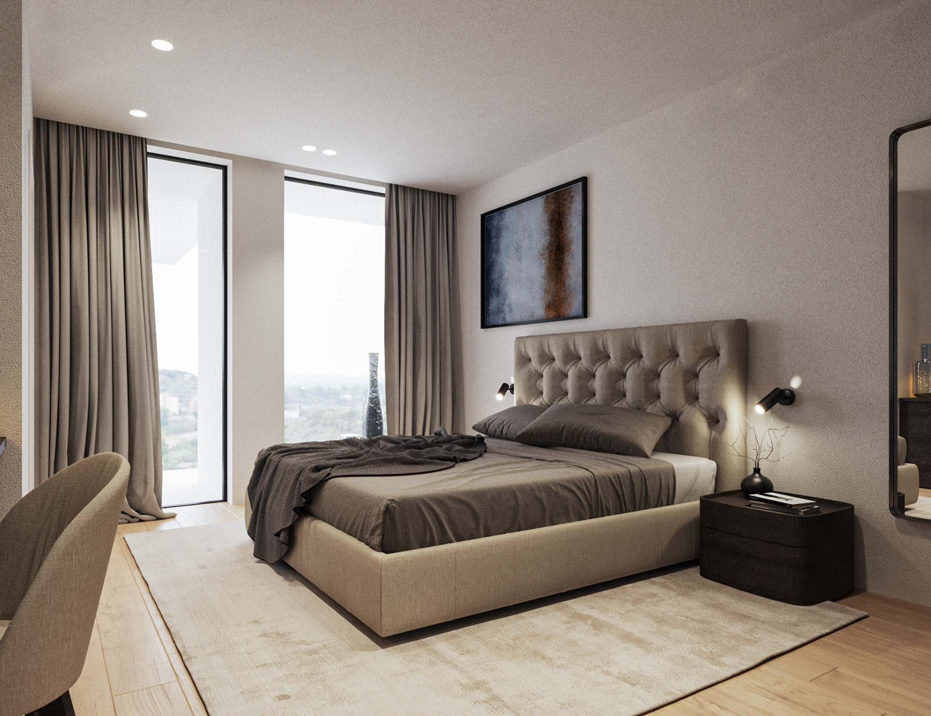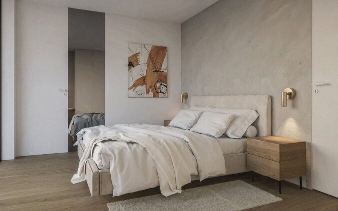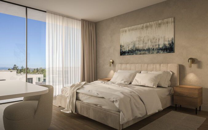 Spavaće sobe oblikovane su kao mirne, intimne cjeline s naglašenim osjećajem udobnosti i tišine. Uzglavlja obložena tekstilom ili drvenim panelima dodatno pojačavaju osjećaj topline, dok ugradbeni ormari i diskretna rasvjeta osiguravaju funkcionalnost bez vizualnog opterećenja prostora. Kupaonice prate istu estetiku – dominiraju velike keramičke plohe u svijetlim tonovima, walk–in tuševi i minimalistički sanitarni elementi. Kombinacija kamena, stakla i matiranih metalnih detalja stvara dojam profinjenog hotelskog standarda.