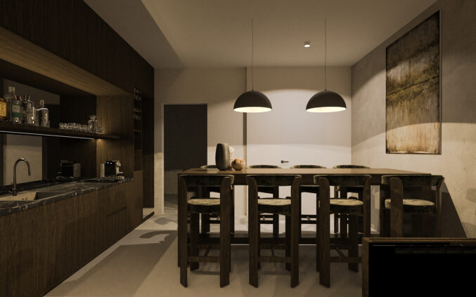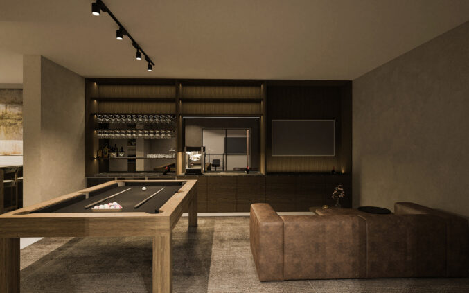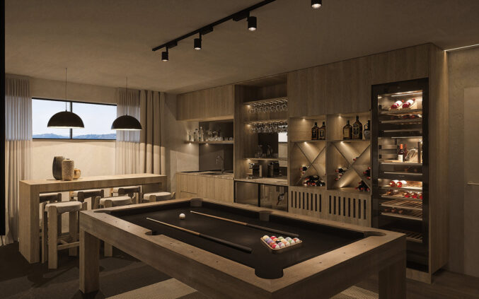 U pojedinim vilama planira se izvedba podrumske etaže s dodatnim sadržajima. Ovi prostori oblikovani su u tamnijoj, intimnijoj atmosferi, s naglaskom na kontrast između svjetla i sjene. Predviđeni sadržaji uključuju manju, funkcionalnu kuhinju i bar zonu, prostor za igru i druženje, privatnu teretanu te vešeraj i tehničke prostore. Materijali su ovdje nešto izraženiji – tamno drvo, strukturirane zidne obloge i diskretna indirektna rasvjeta stvaraju sofisticiran, gotovo lounge ugođaj. Ove etaže zamišljene su kao multifunkcionalne cjeline koje podižu razinu komfora i omogućuju dodatne scenarije korištenja prostora, od privatnih okupljanja do svakodnevne rekreacije.