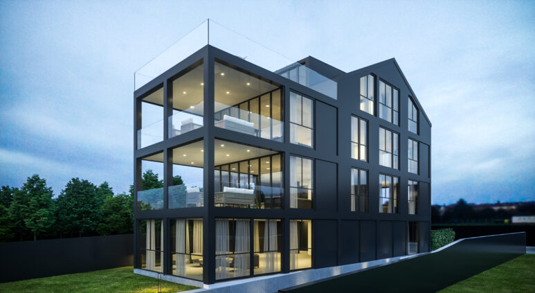 Zgrada 2: Nova stambena zgrada na parceli od 602 m² uključuje podrum i tri nadzemne etaže s uvučenim katom. Projekt predviđa tri zasebna stana s individualnim ulazima te garaže i pomoćnu građevinu za parkiranje. Prostrani vrtovi i staze oplemenjuju okolni prostor i naglašavaju suvremeni karakter zgrade.