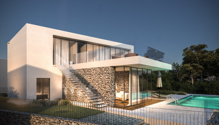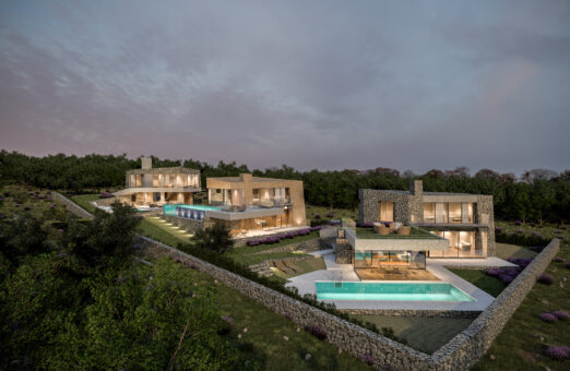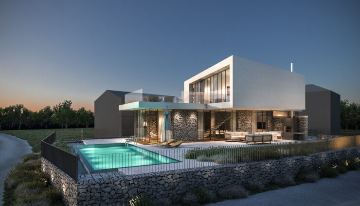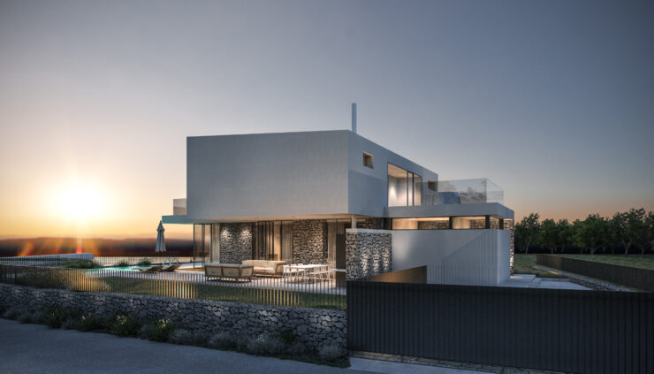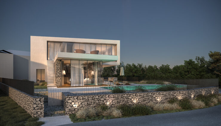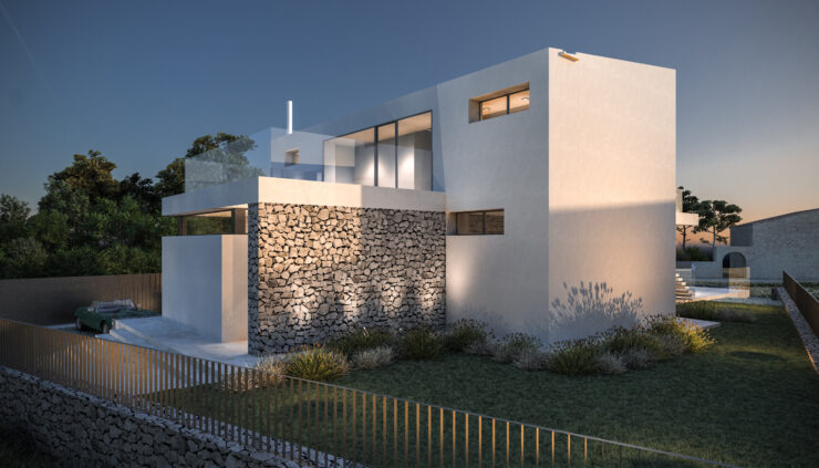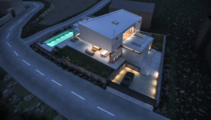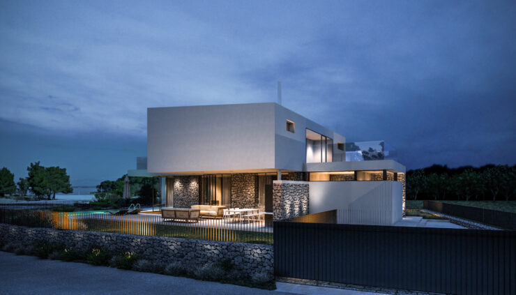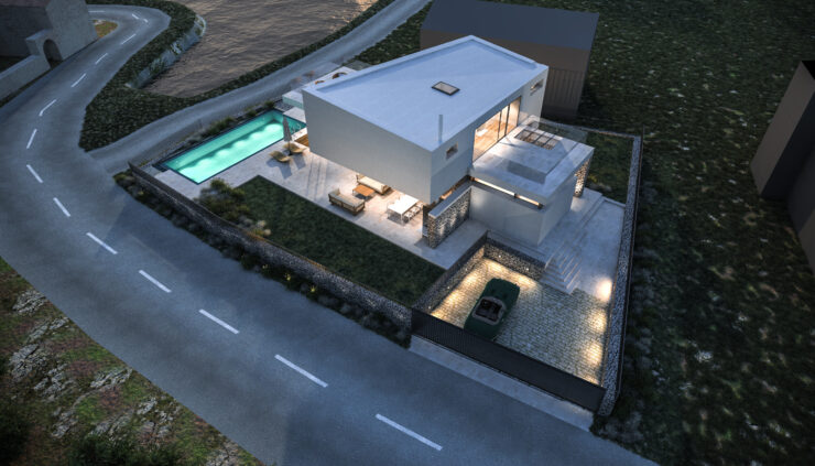 Smještena na blago nagnutoj parceli površine 800 m², vila iskorištava svoju povišenu poziciju s pogledom na obalu i okoliš. Tradicionalni suhozidi definiraju granice parcele i povezuju modernu arhitekturu s mediteranskim krajobrazom, stvarajući autentičnu i prirodnu atmosferu.