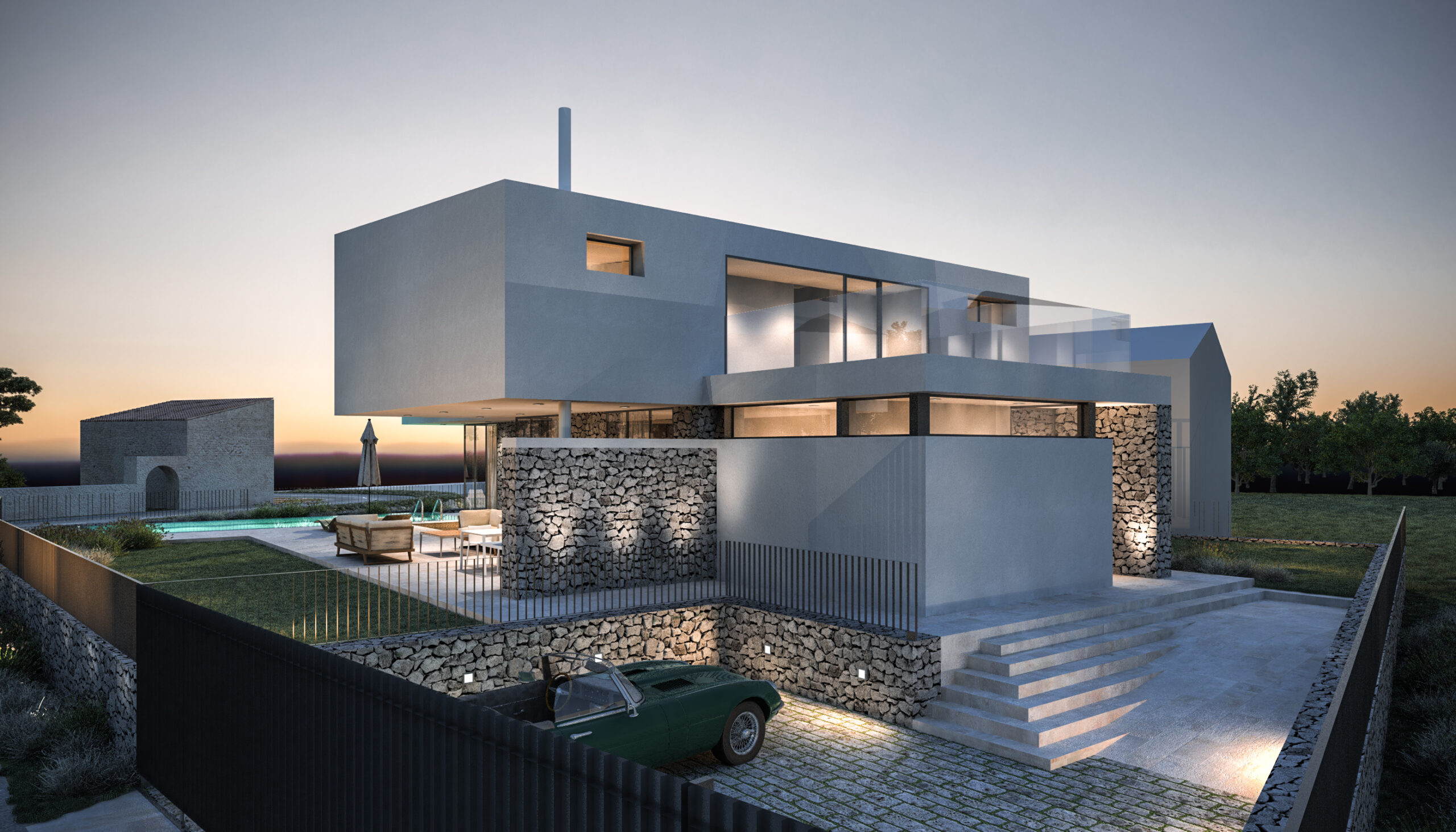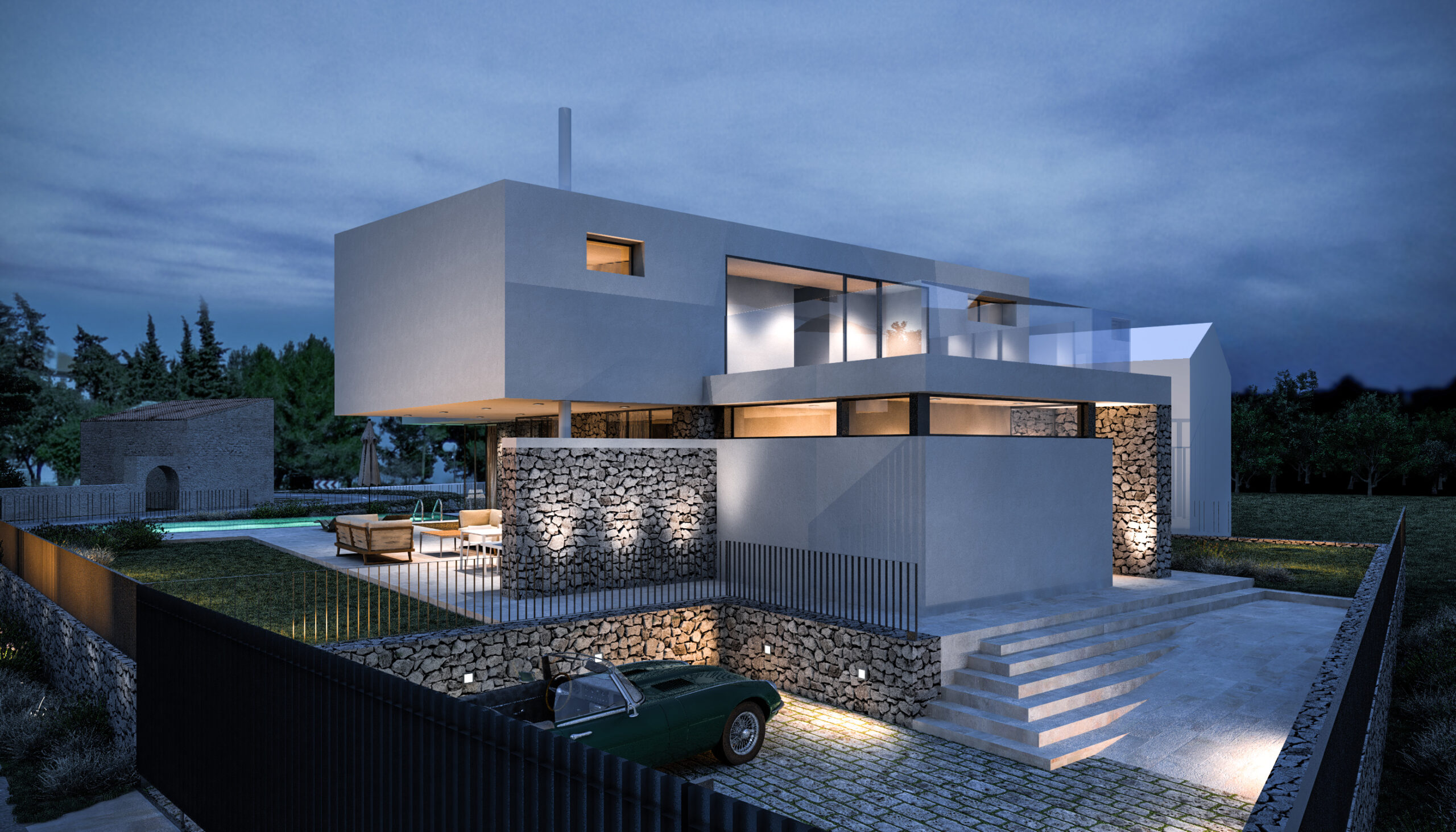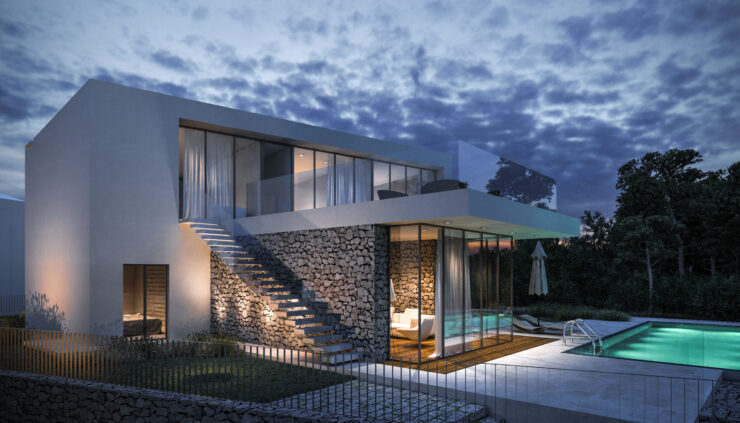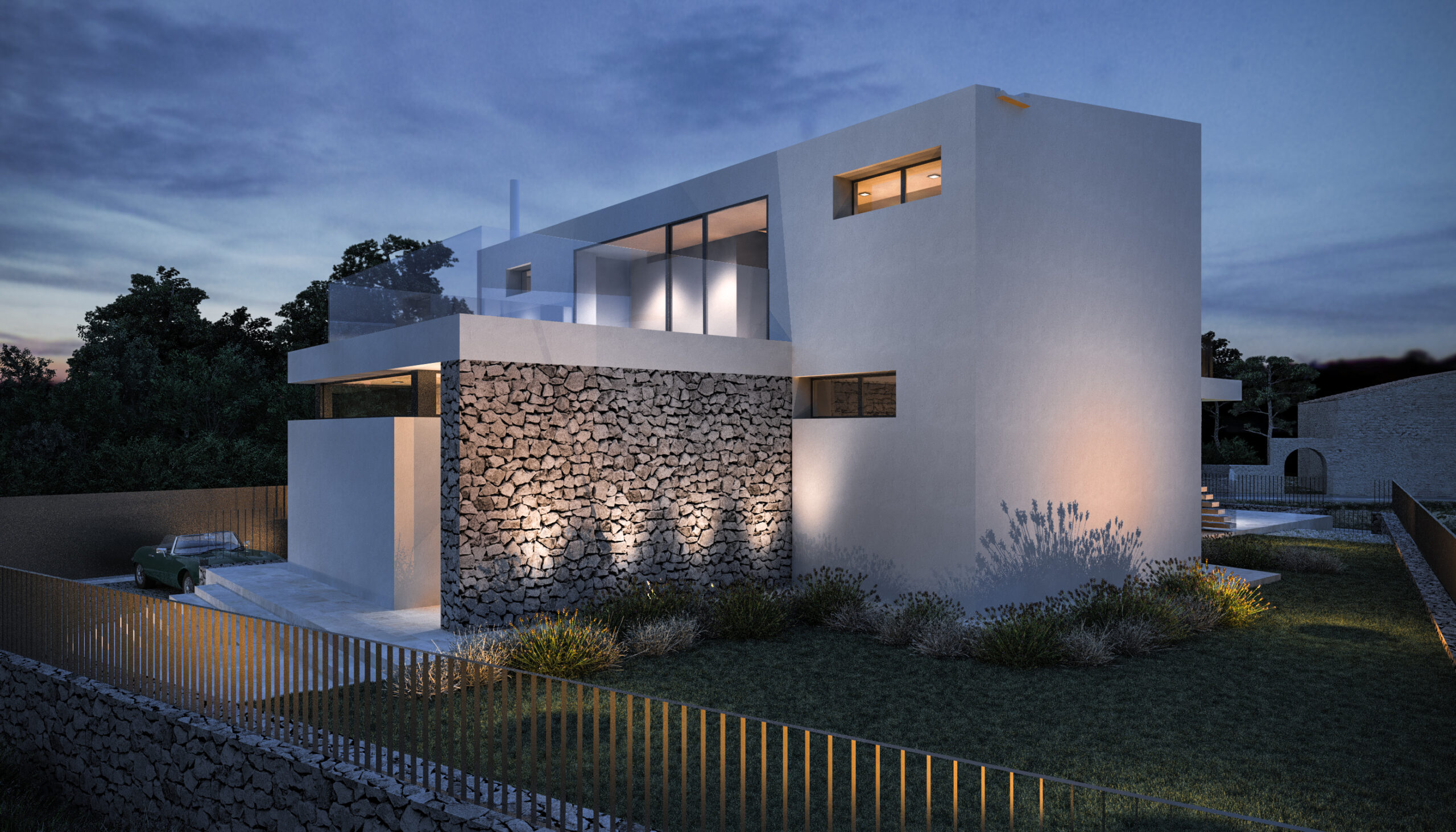 Smještena na blago nagnutoj parceli površine 800 m², vila iskorištava svoju povišenu poziciju s pogledom na obalu i okoliš. Tradicionalni suhozidi definiraju granice parcele i povezuju modernu arhitekturu s mediteranskim krajobrazom, stvarajući autentičnu i prirodnu atmosferu.