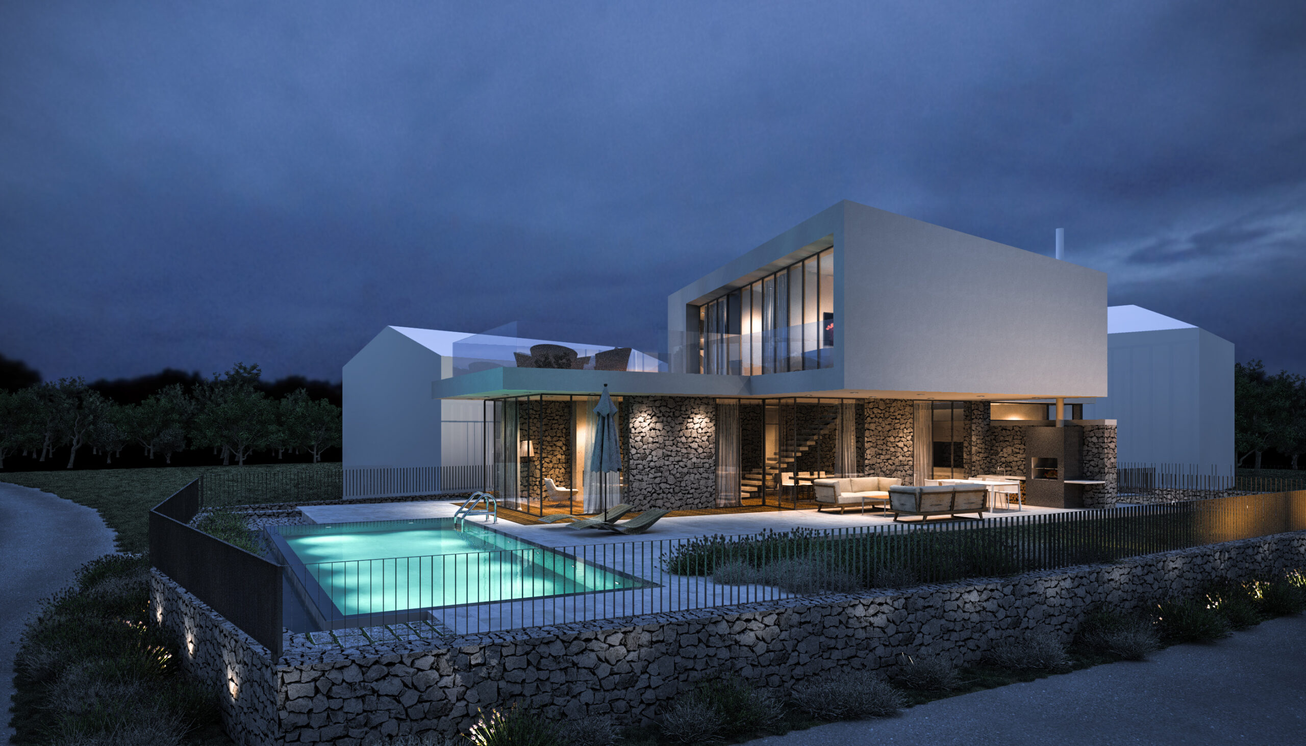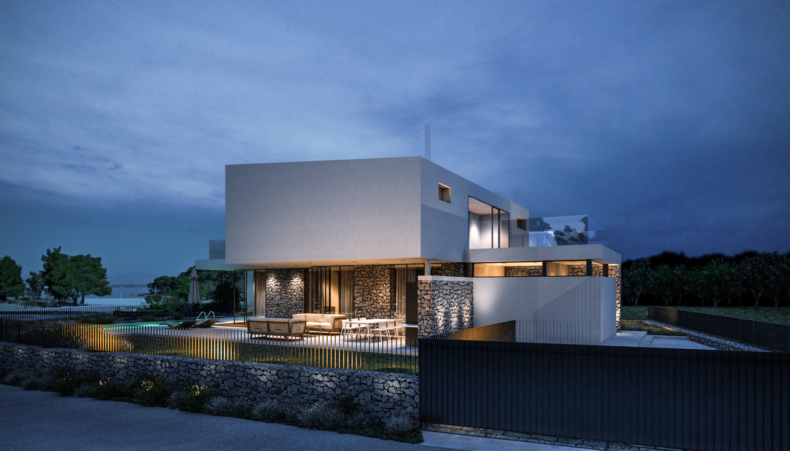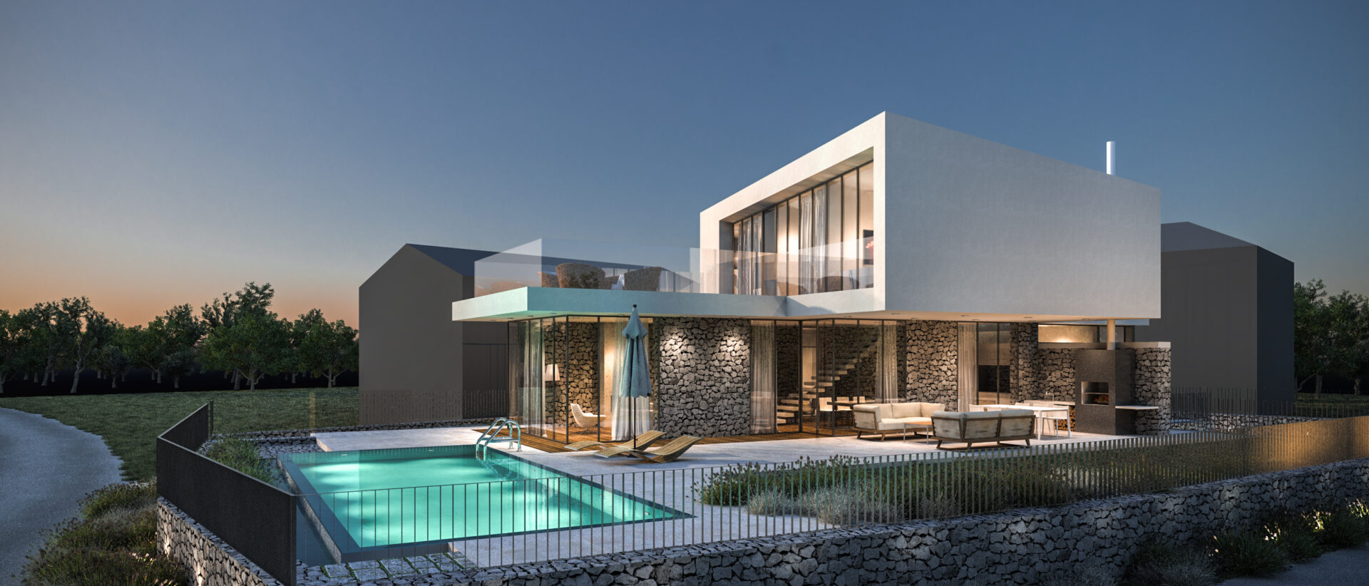 Kombinacija glatke bijele žbuke, prirodnog kamena i prostranih staklenih površina stvara suvremen, ali topao izraz. Kameni elementi unose teksturalnu bogatost i povezanost s tradicijom otoka, dok prozori uokviruju zadivljujuće krajolike i donose obilje prirodne svjetlosti.