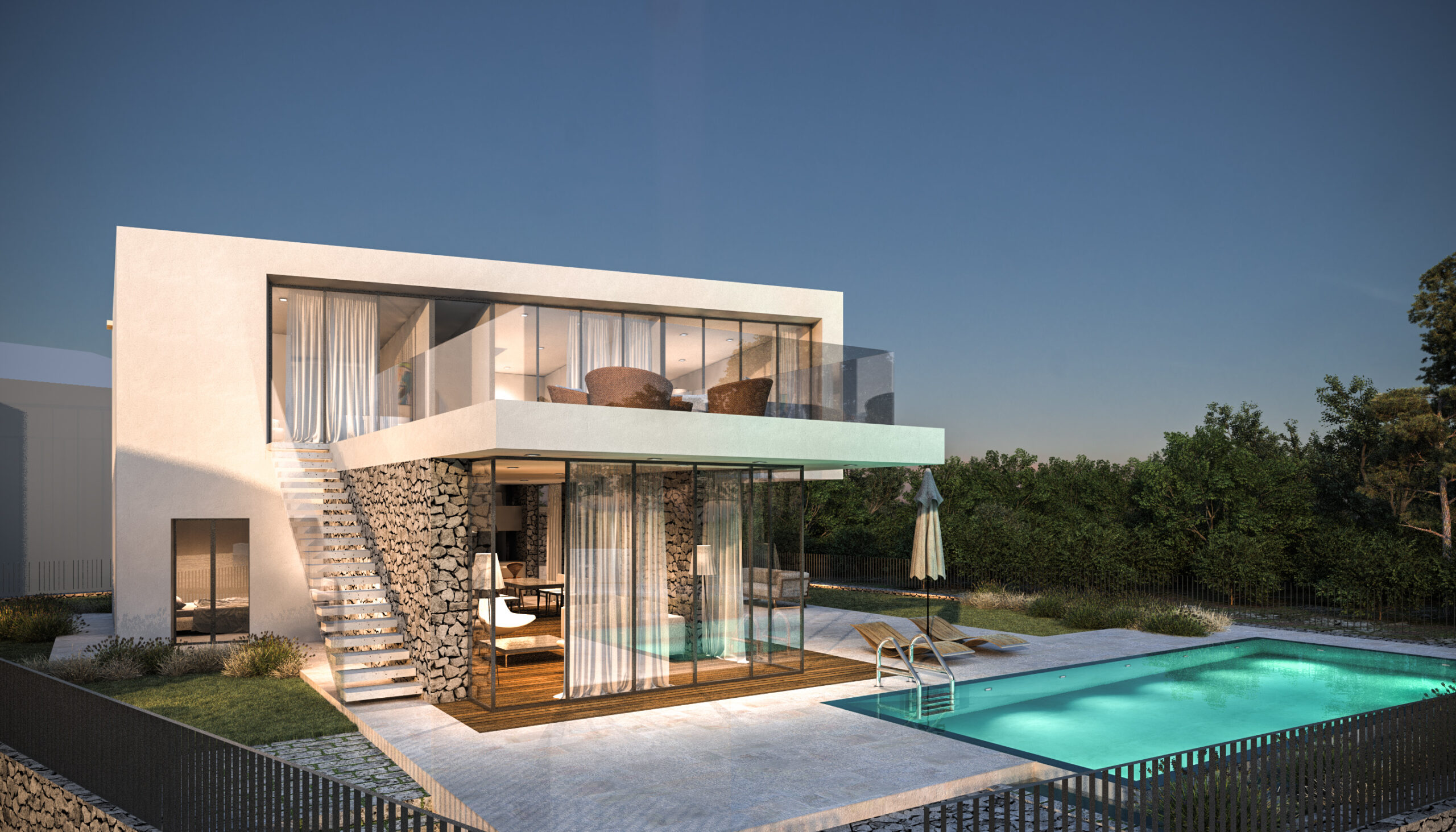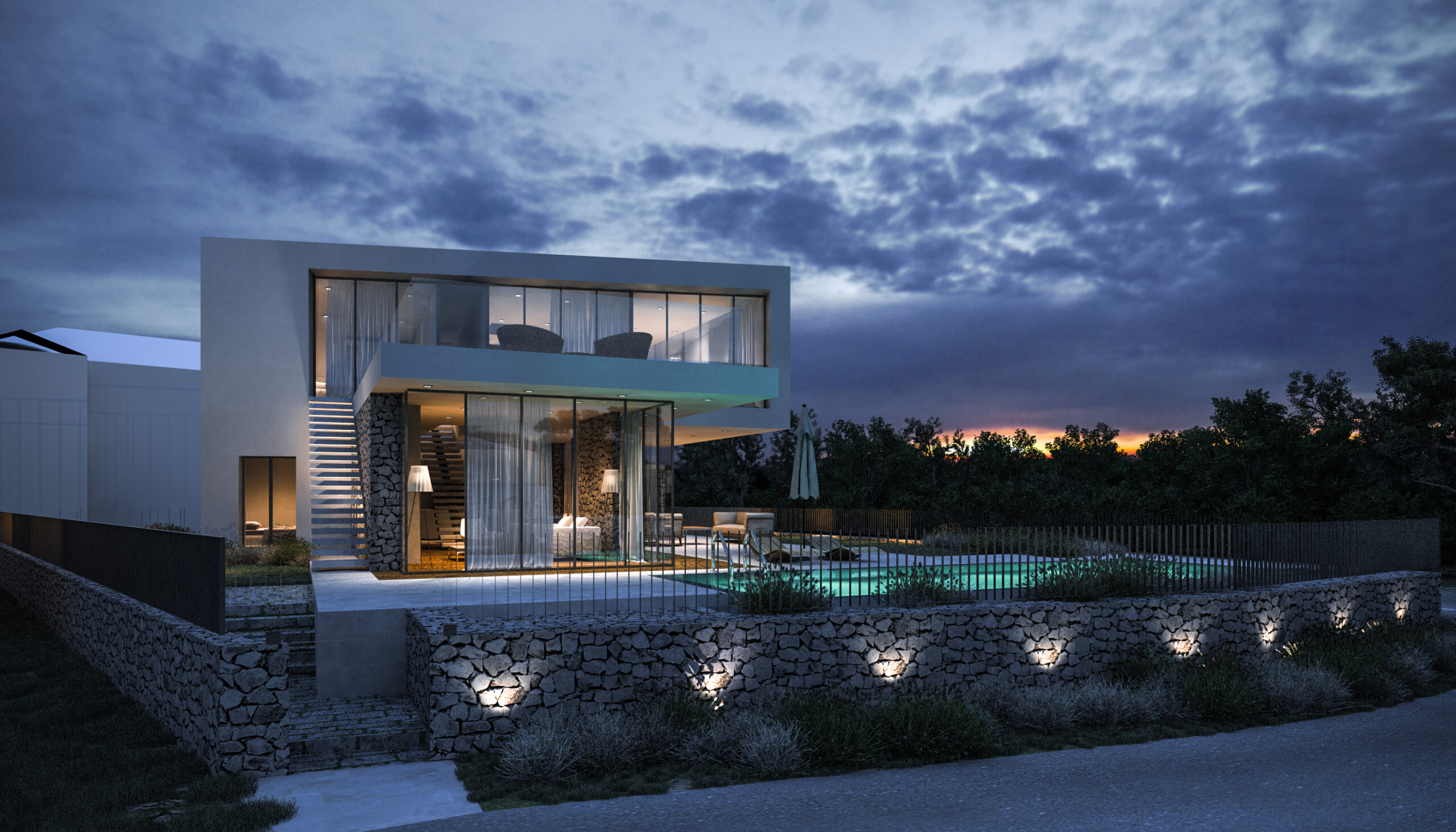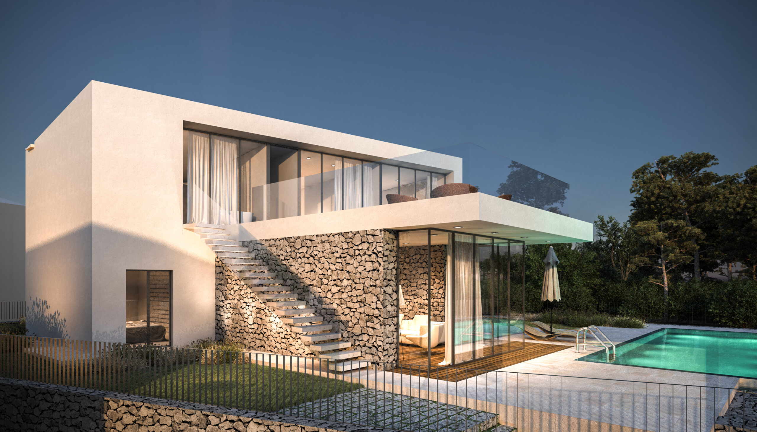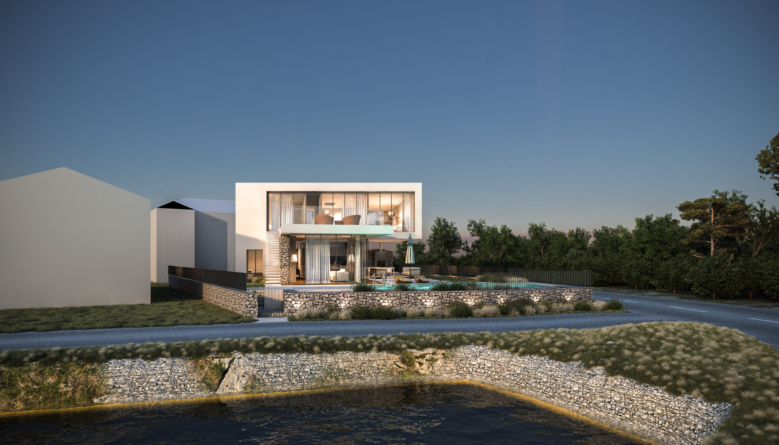 Kombinacija glatke bijele žbuke, prirodnog kamena i prostranih staklenih površina stvara suvremen, ali topao izraz. Kameni elementi unose teksturalnu bogatost i povezanost s tradicijom otoka, dok prozori uokviruju zadivljujuće krajolike i donose obilje prirodne svjetlosti.