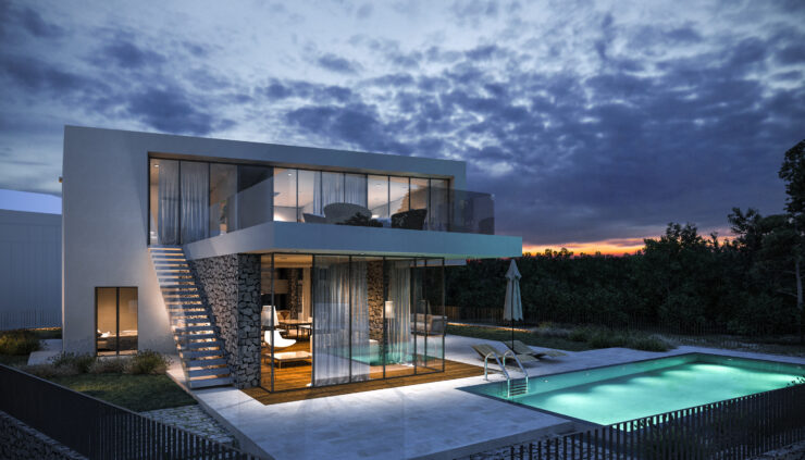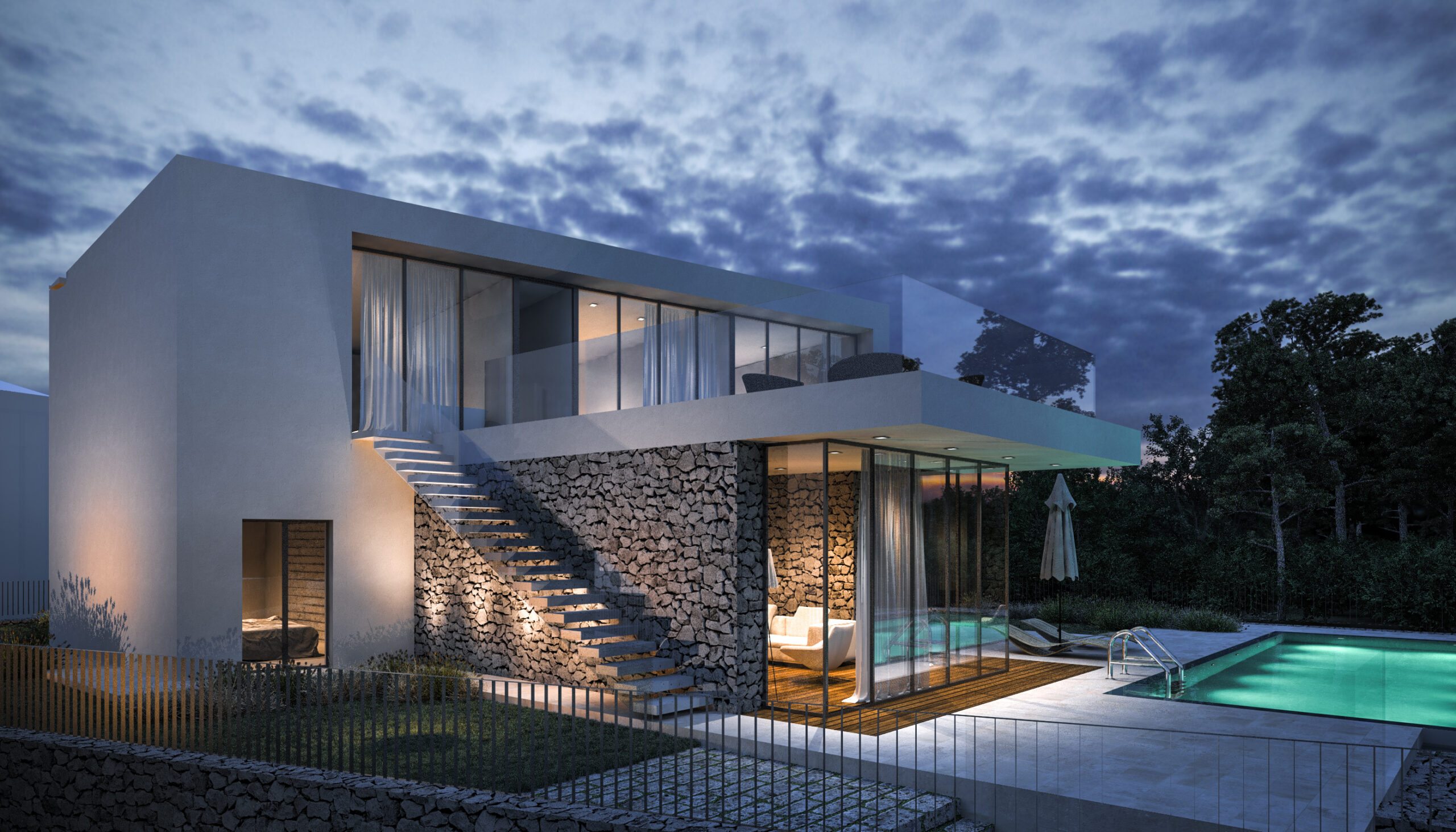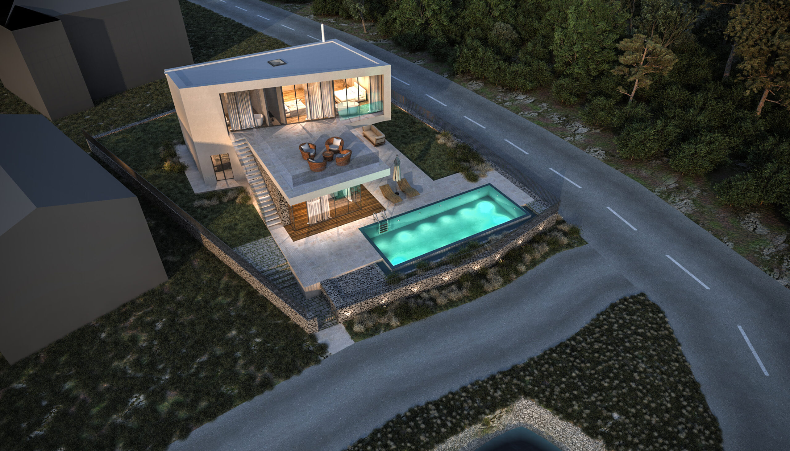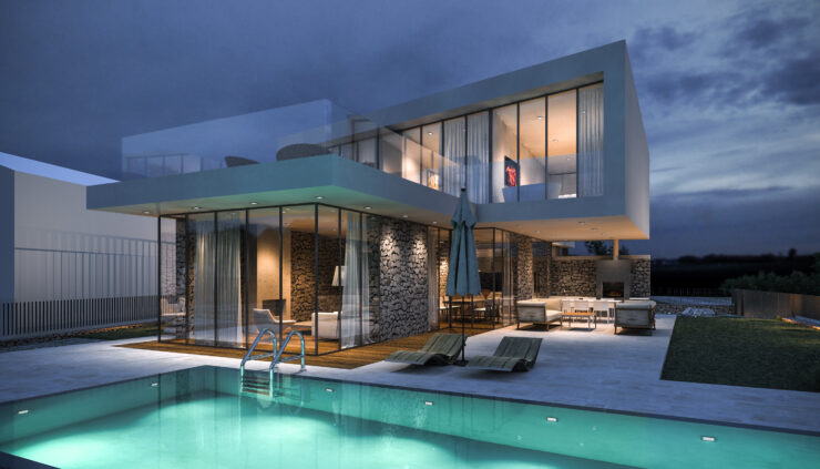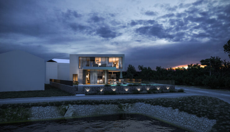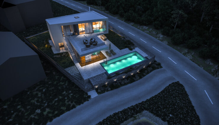 Vila se prostire na dvije etaže, pažljivo oblikovane kako bi se maksimalno iskoristio prostor i svjetlost. U prizemlju su prostrane dnevne zone koje se zahvaljujući velikim staklenim stijenkama spajaju s vanjskim terasama i bazenom. Na katu su privatne spavaće sobe s panoramskim pogledom i pristupom krovnoj terasi koja nudi miran kutak za odmor i uživanje.