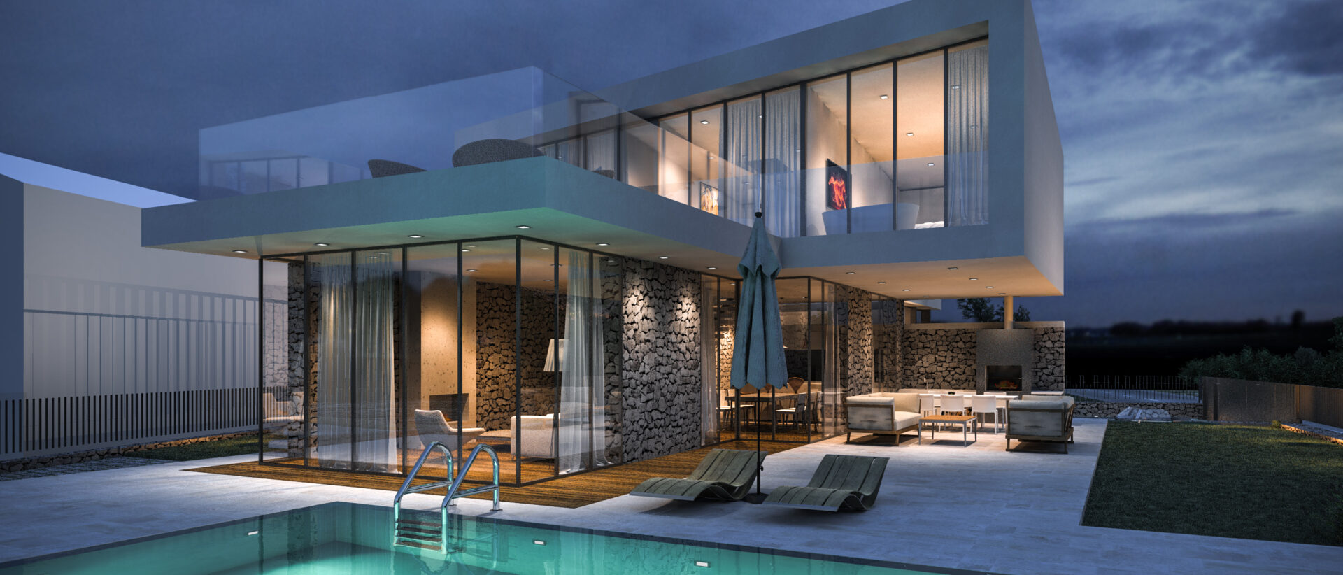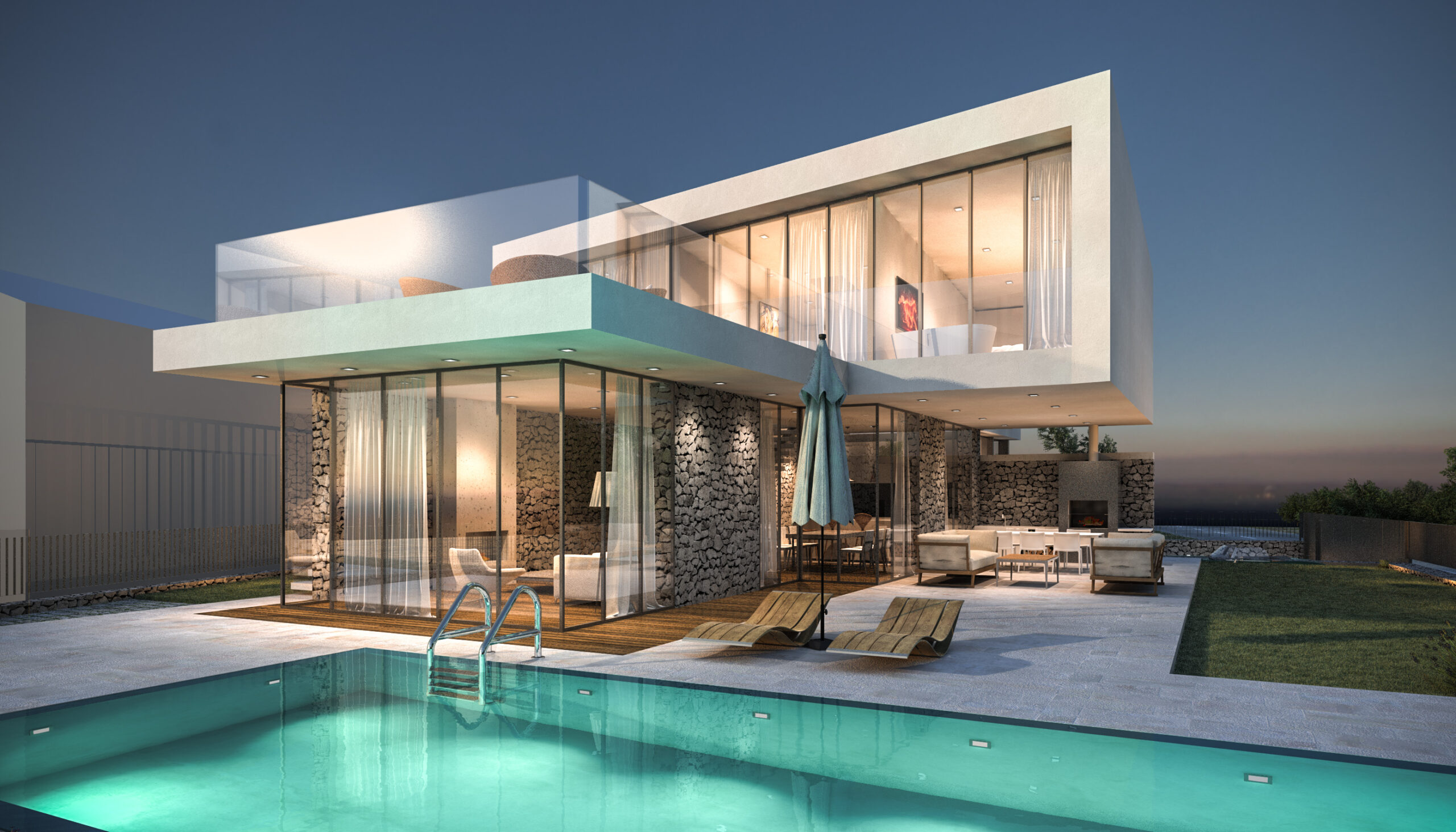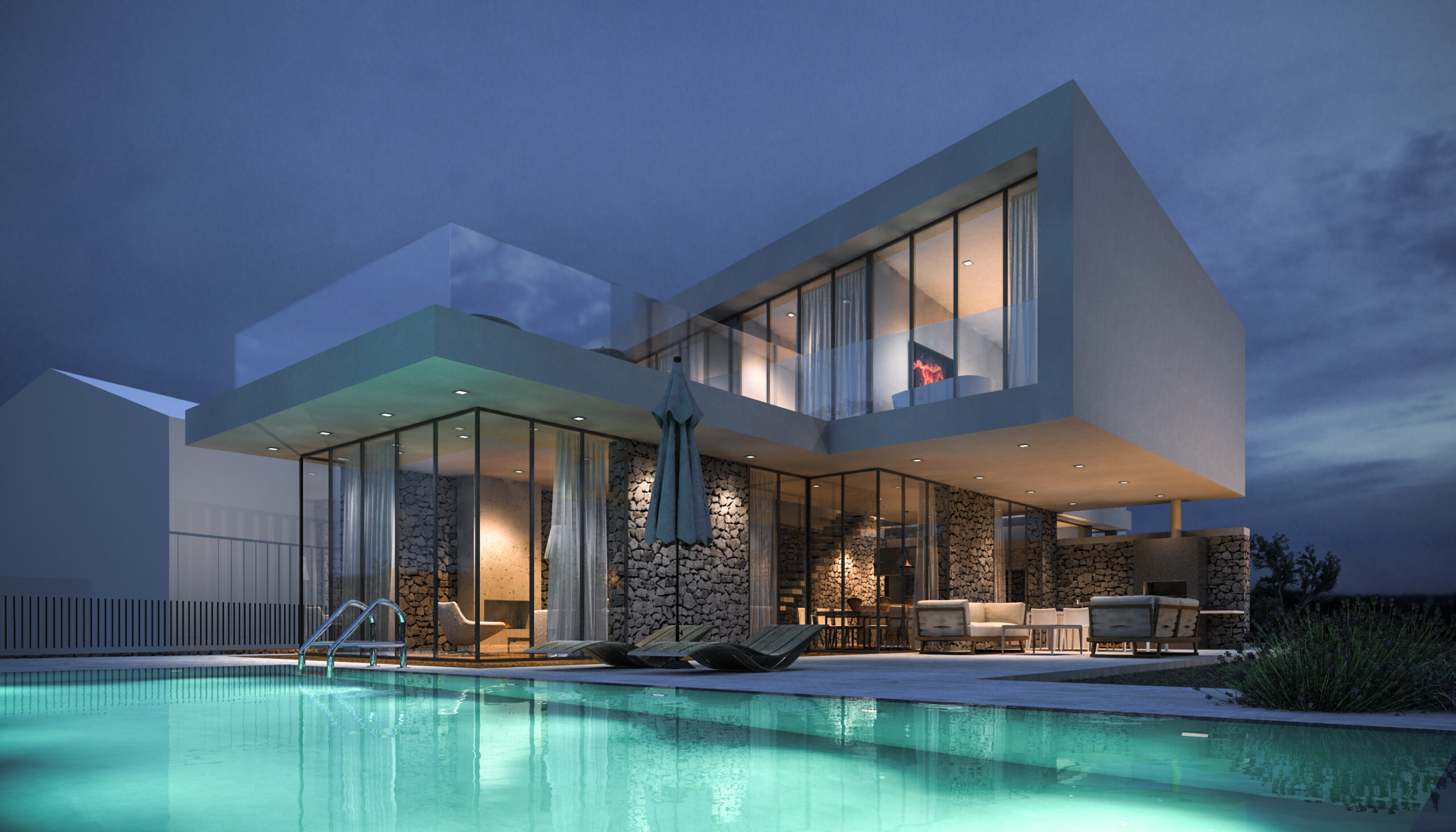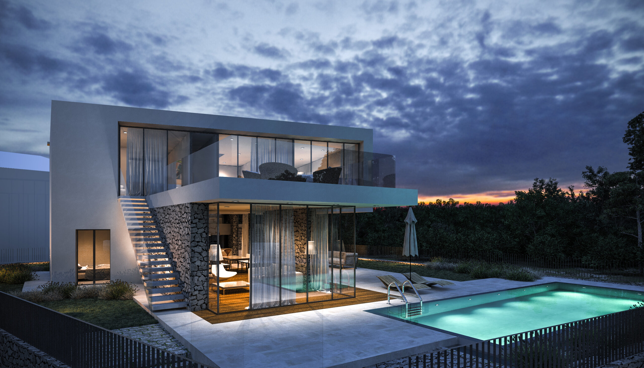 Vila se prostire na dvije etaže, pažljivo oblikovane kako bi se maksimalno iskoristio prostor i svjetlost. U prizemlju su prostrane dnevne zone koje se zahvaljujući velikim staklenim stijenkama spajaju s vanjskim terasama i bazenom. Na katu su privatne spavaće sobe s panoramskim pogledom i pristupom krovnoj terasi koja nudi miran kutak za odmor i uživanje.
