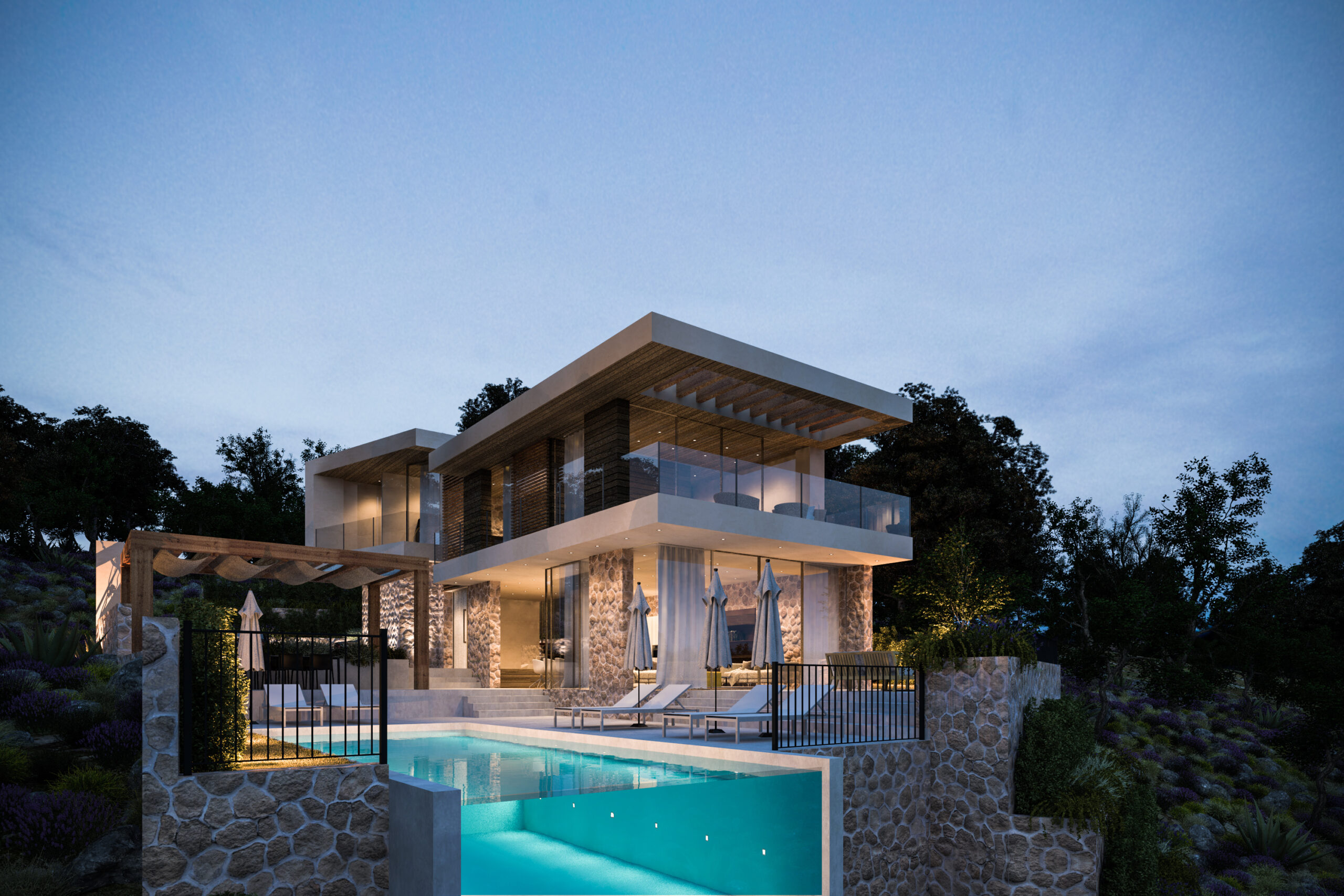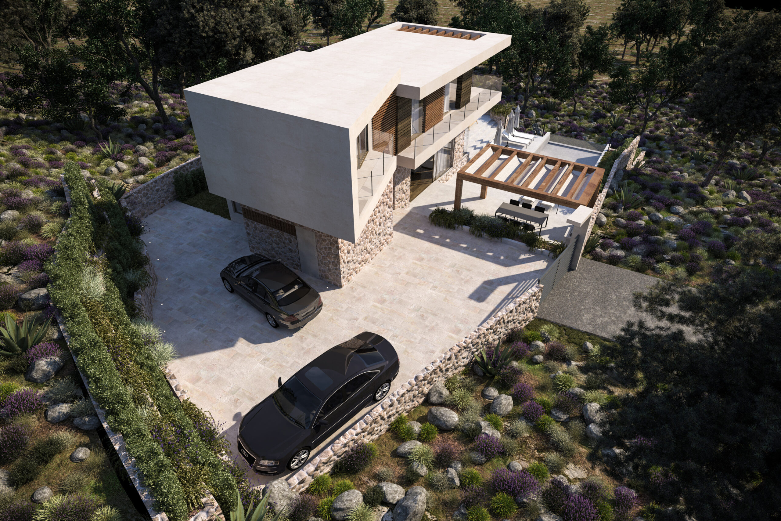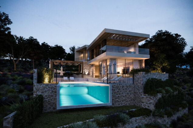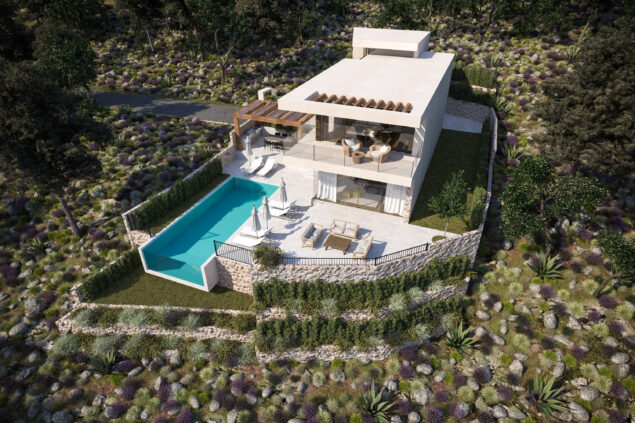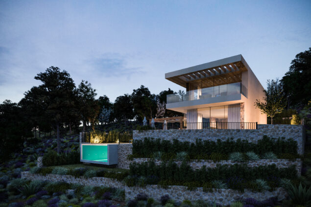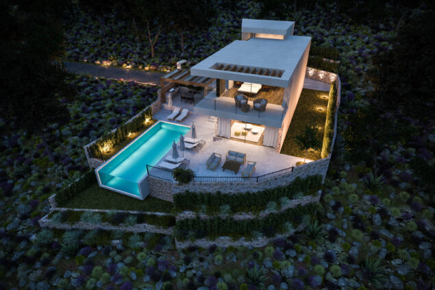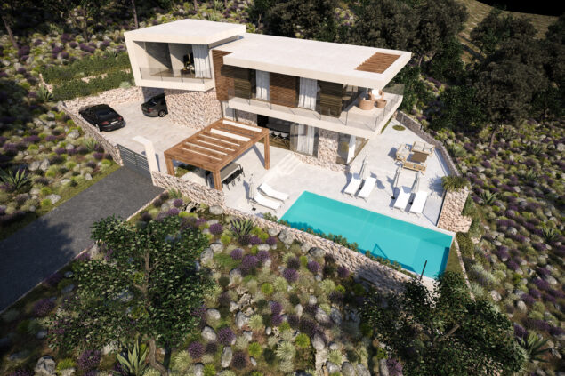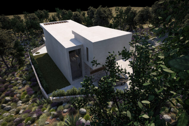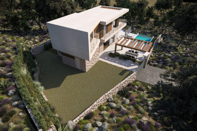 Krajobrazno rješenje prati prirodnu morfologiju terena, uz korištenje autohtone mediteranske vegetacije koja omekšava prijelaze između arhitekture i okoliša. Bazen je integriran u kamenu strukturu potpornih zidova te postaje vizualni fokus vanjskog prostora, s efektom lebdeće vodene plohe koja se otvara prema pogledu. Projekt ostvaruje sklad između suvremene arhitekture i mediteranskog ambijenta, naglašavajući osjećaj privatnosti, udobnosti i ekskluzivnosti.