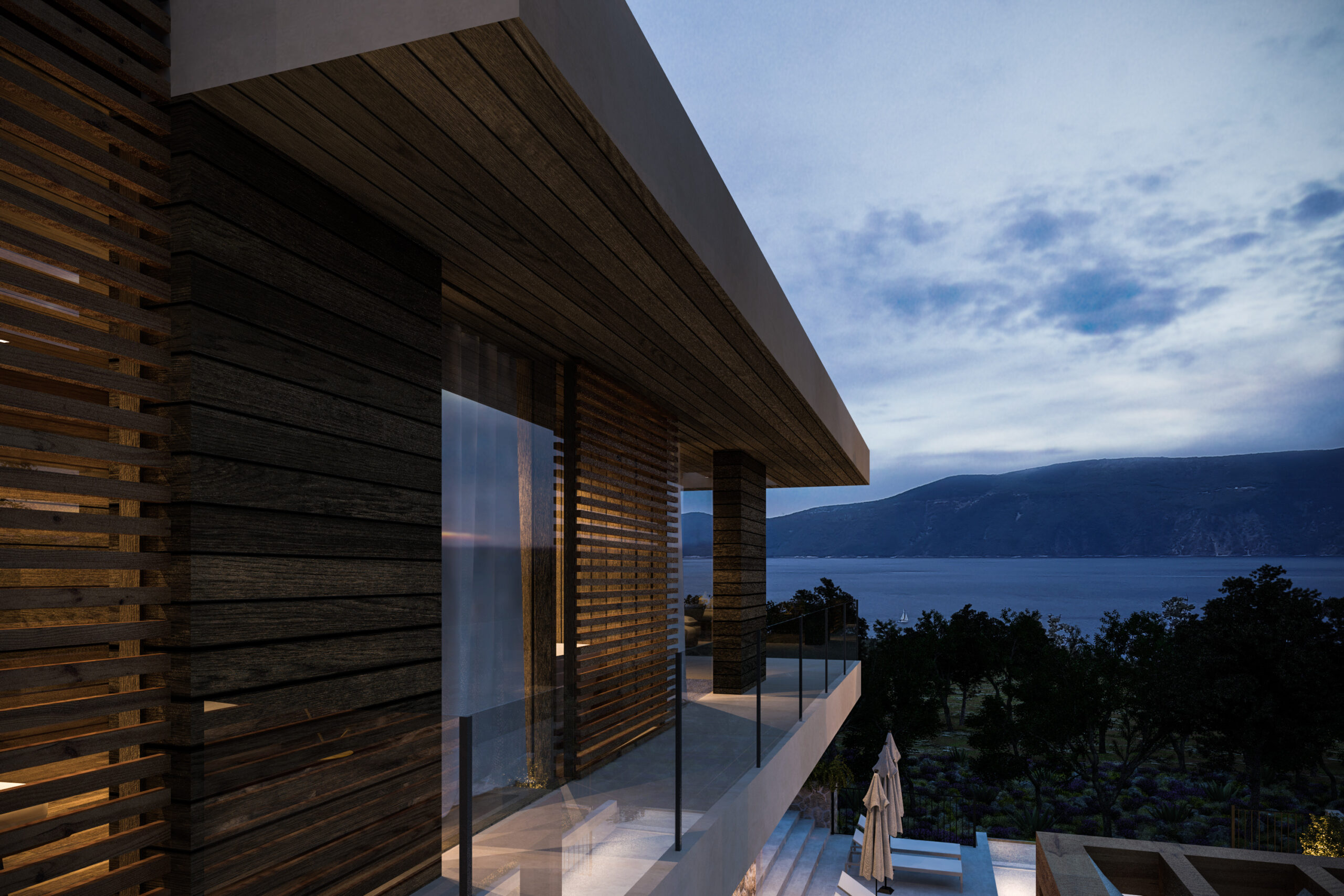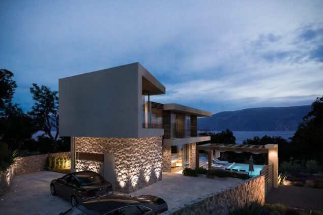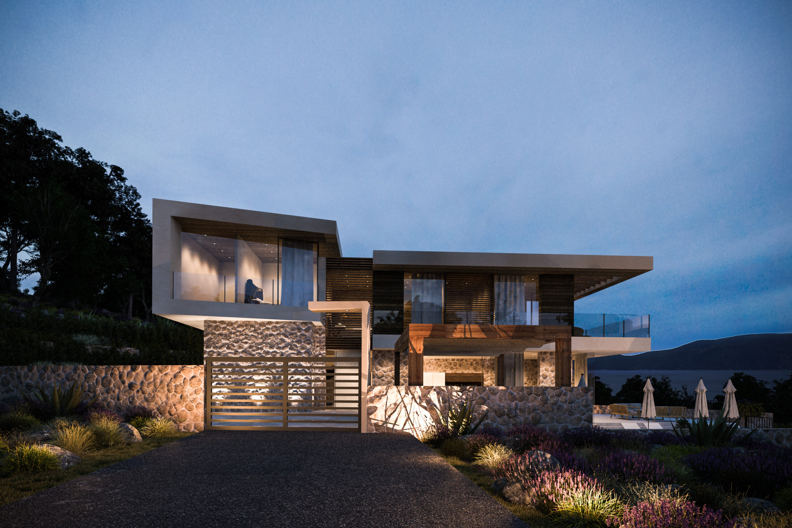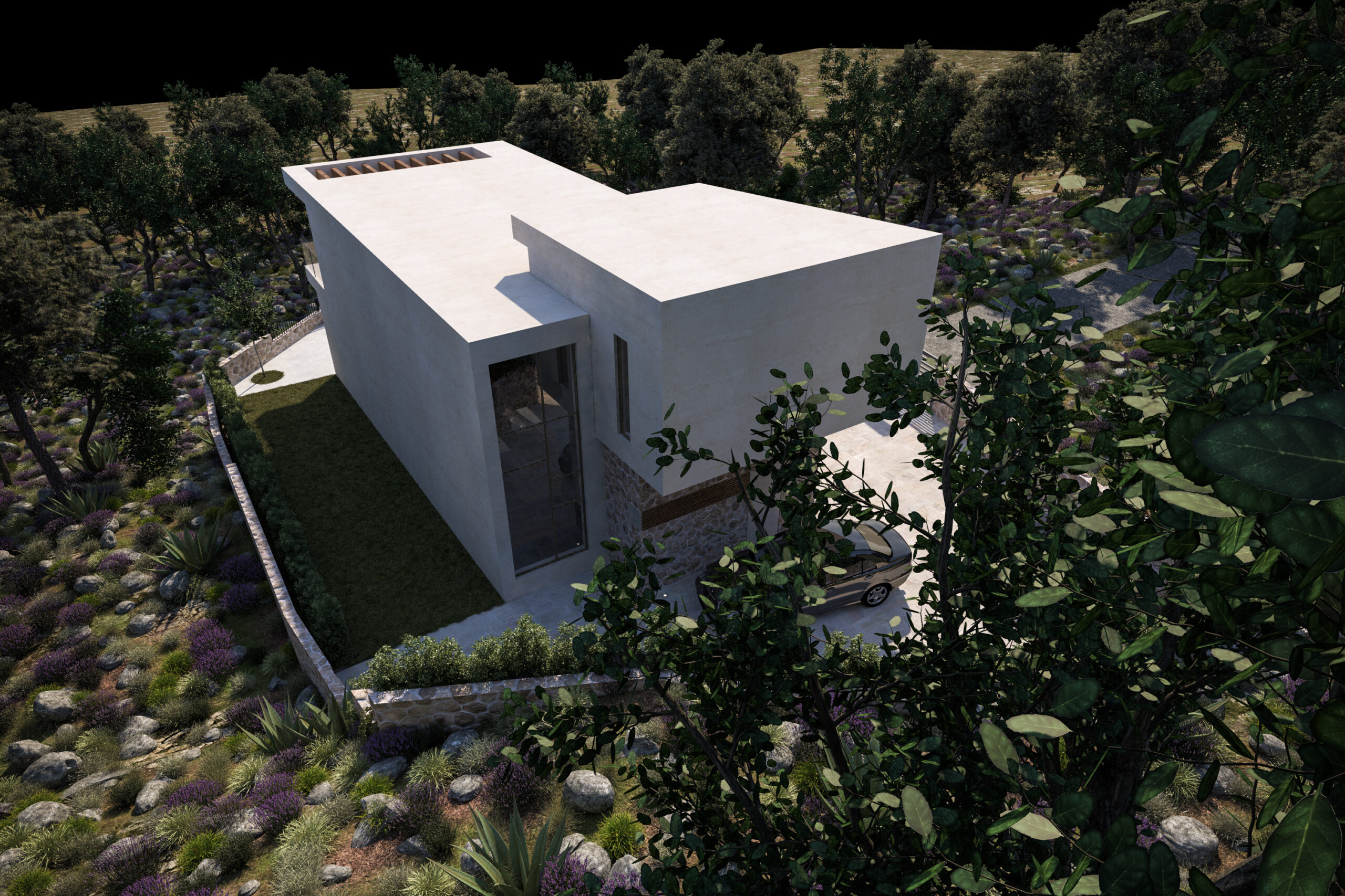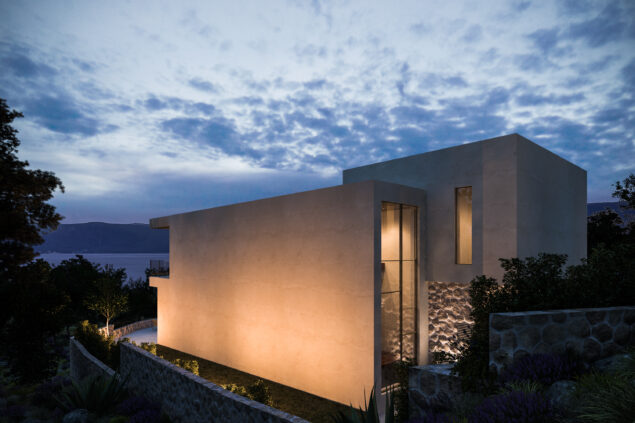 Projekt je oblikovan kao odgovor na konfiguraciju terena i vizure prema morskom horizontu. Objekt je kaskadno postavljen, prateći prirodni pad parcele, čime se postiže optimalna orijentacija i maksimalno korištenje pogleda. Arhitektura kombinira suvremene čiste volumene s tradicionalnim kamenim elementima, uspostavljajući dijalog s lokalnim graditeljskim nasljeđem. Gornji volumen djeluje kao lagana, horizontalna ploha koja lebdi iznad kamene baze, naglašavajući dinamičan odnos punog i transparentnog.