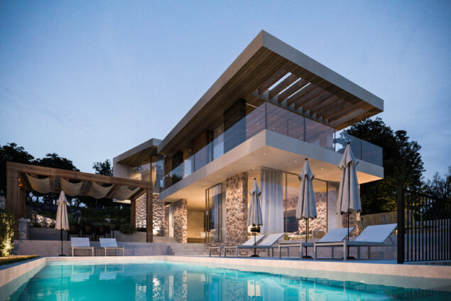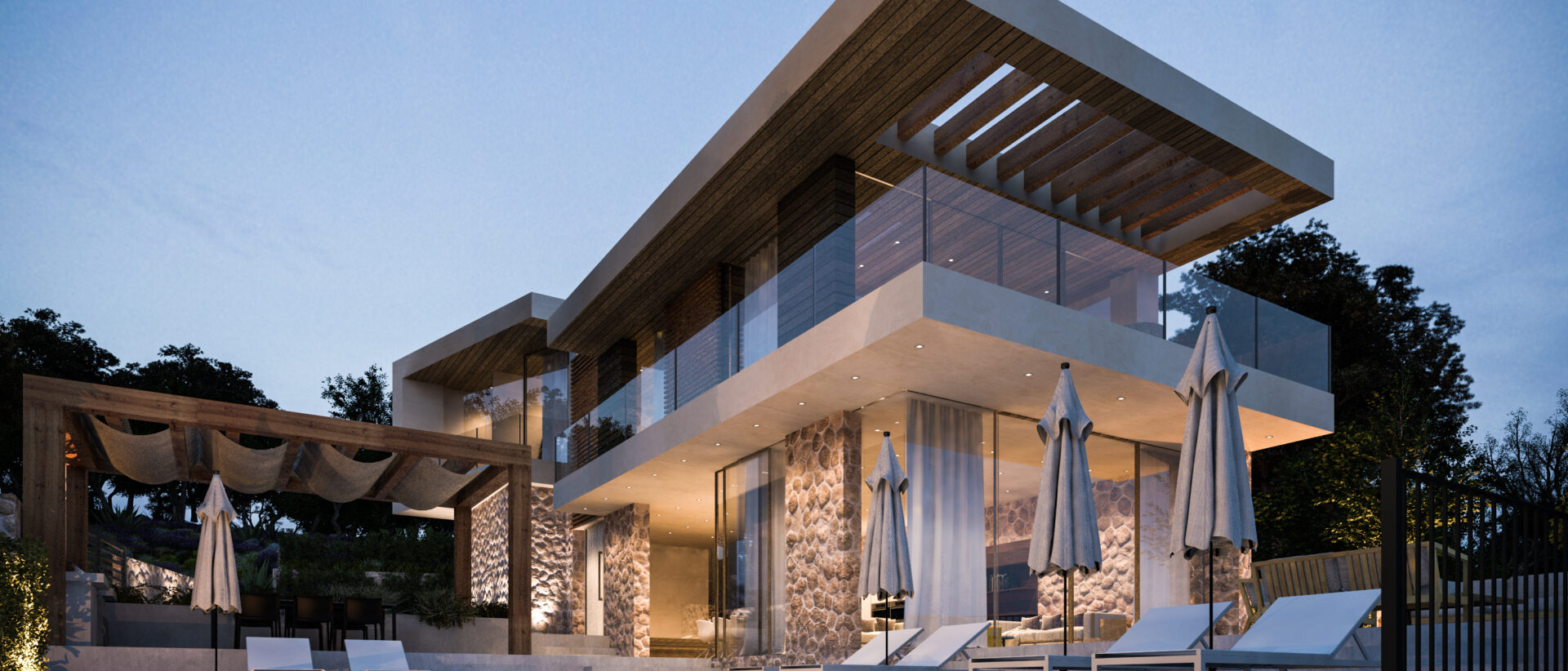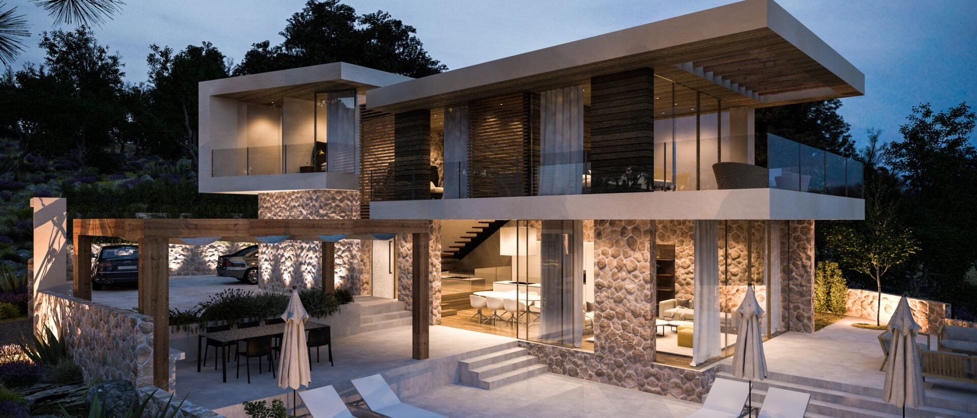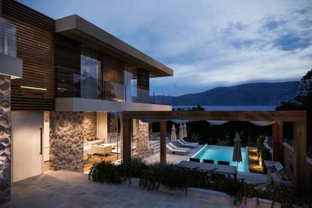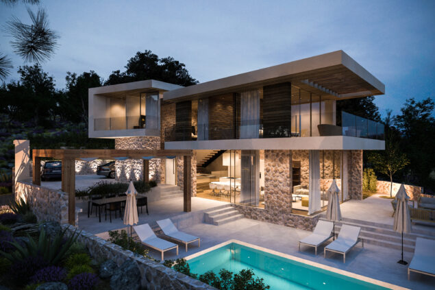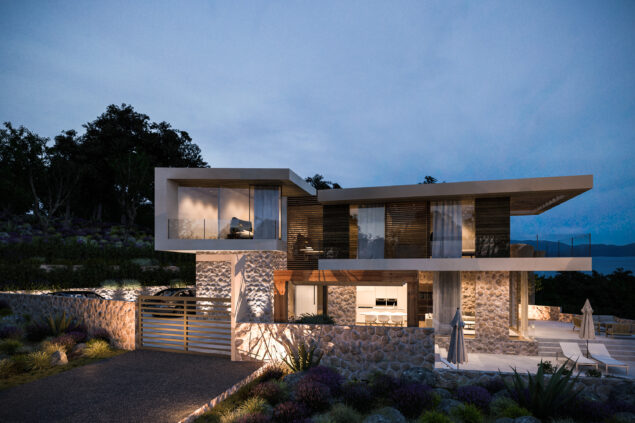 Materijalna paleta temelji se na kombinaciji lokalnog kamena, toplih drvenih obloga i svijetlih, glatkih ploha. Kamen definira bazu objekta i potporne zidove, dajući mu stabilnost i ukorijenjenost u teren, dok drveni elementi unose toplinu i ritam na fasadama. Naglašene horizontalne linije krova i terasa stvaraju suvremen, elegantan profil objekta, dok transparentne staklene ograde dodatno pojačavaju osjećaj lakoće gornjeg volumena.