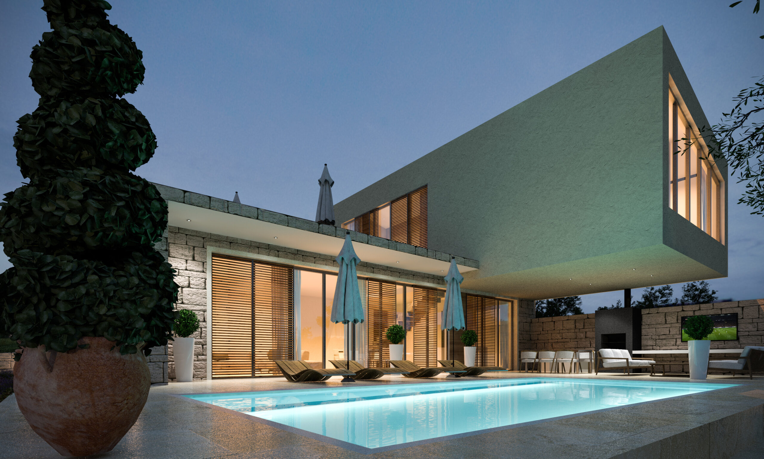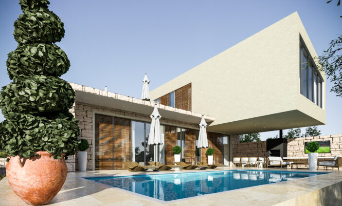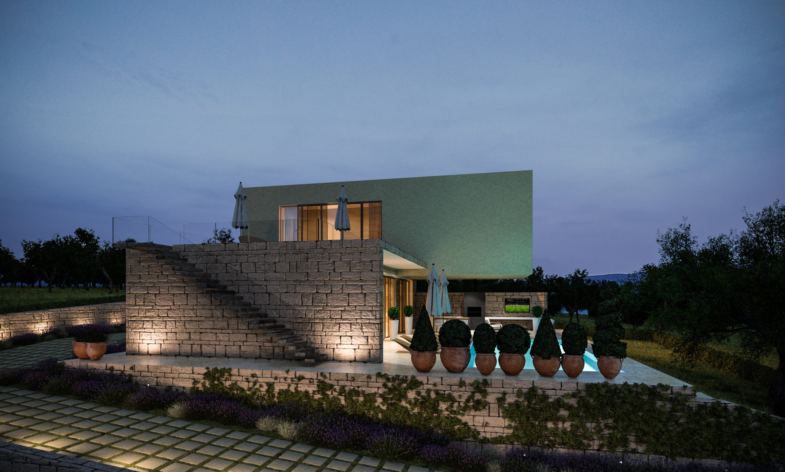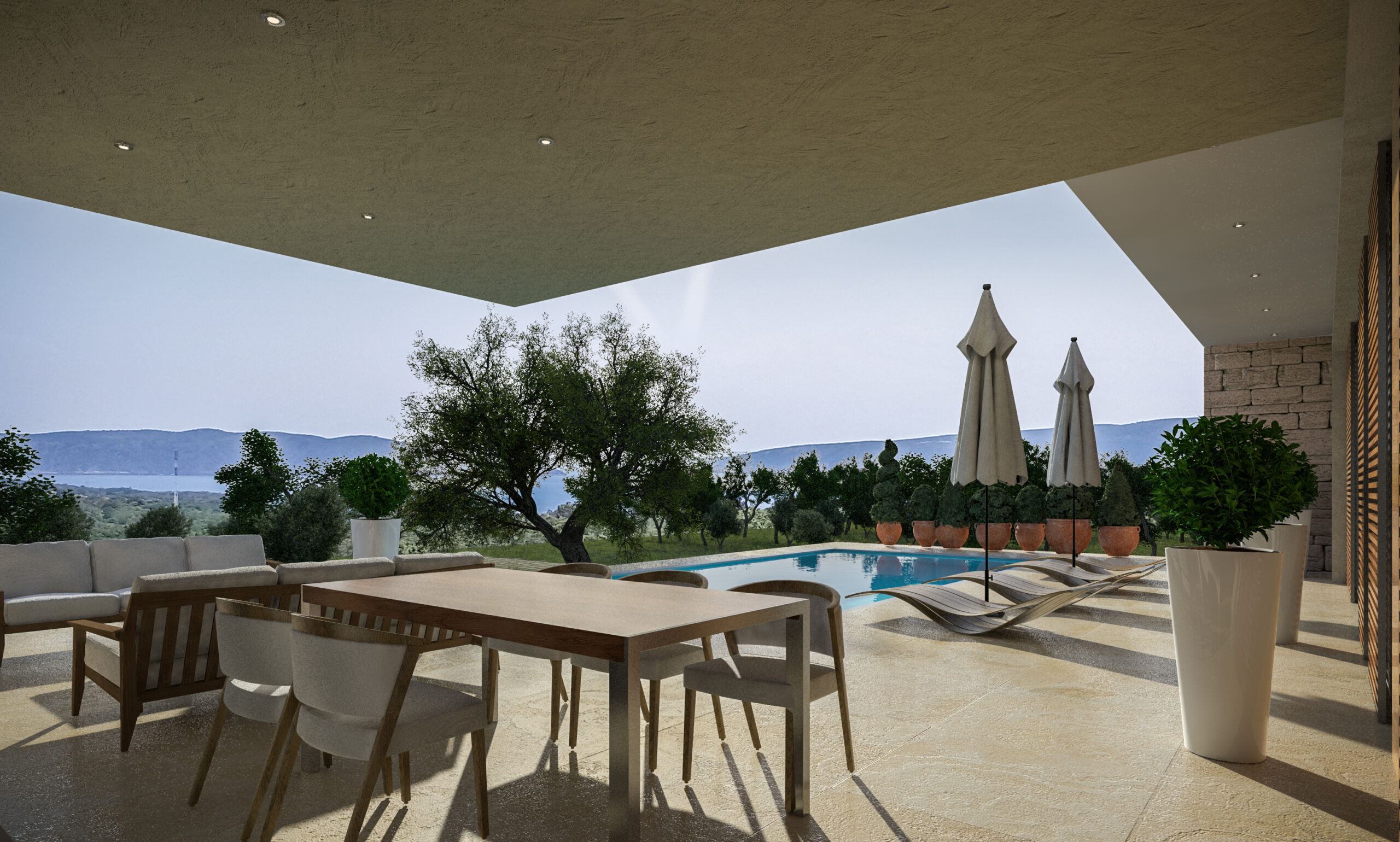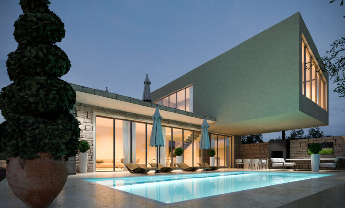 • Integracija unutarnjih i vanjskih prostora, uključujući bazen, natkrivene terase i ljetnu kuhinju
