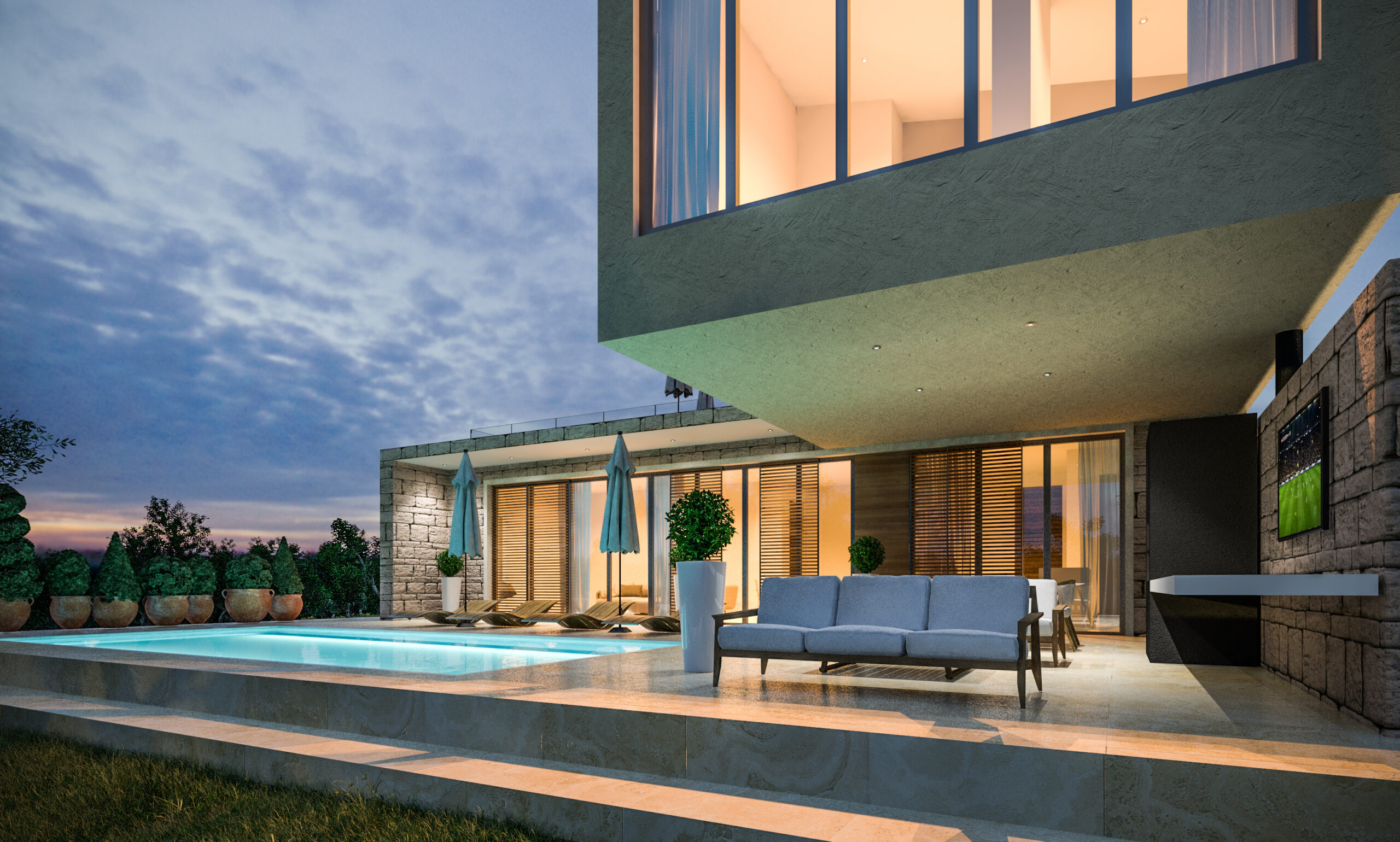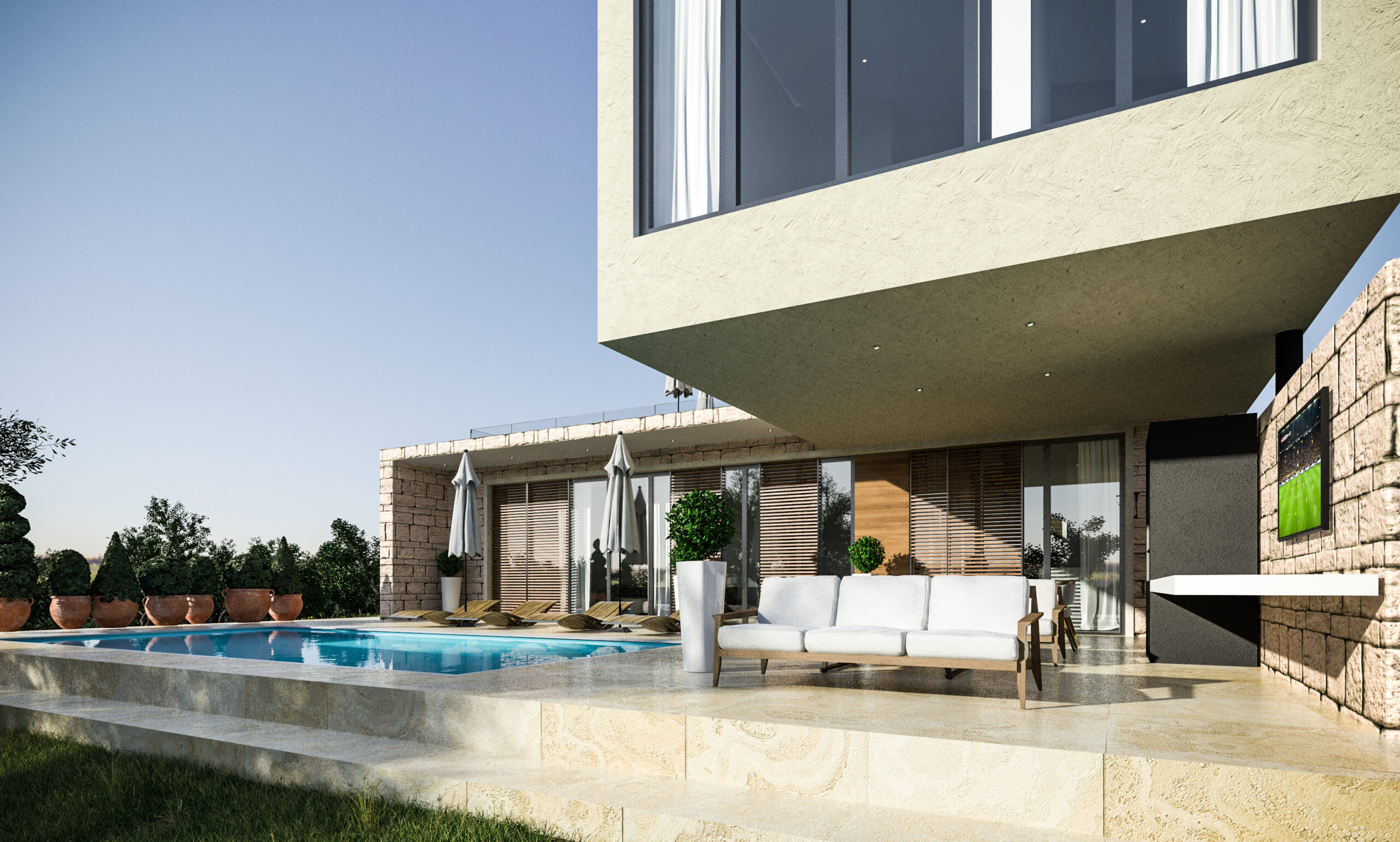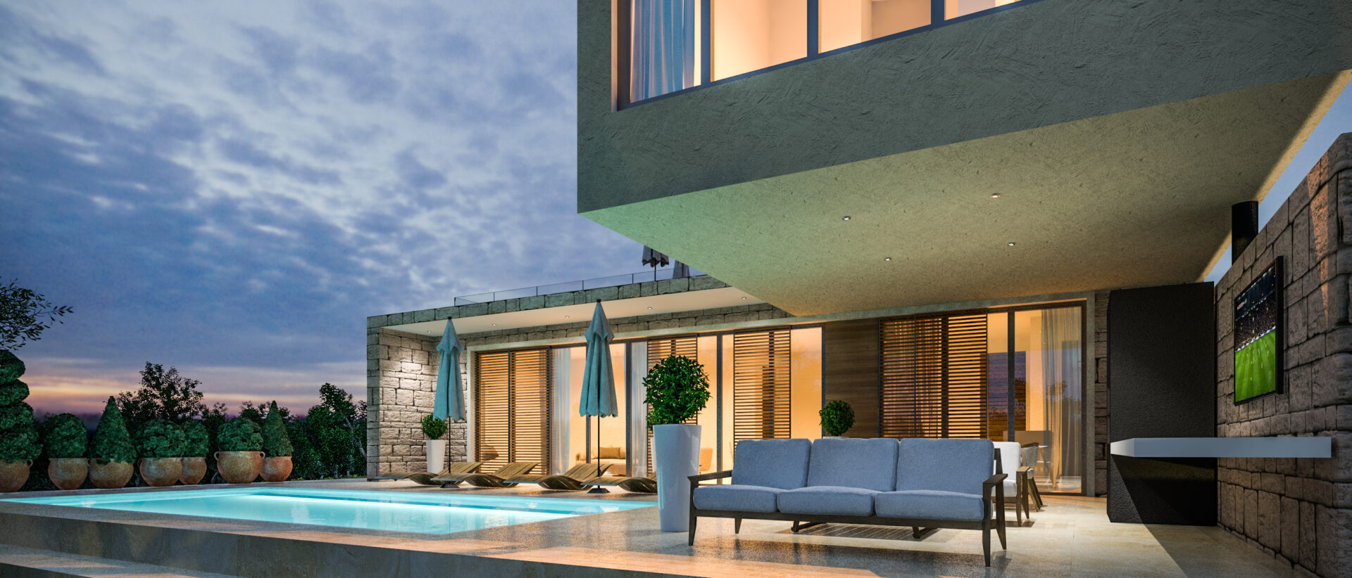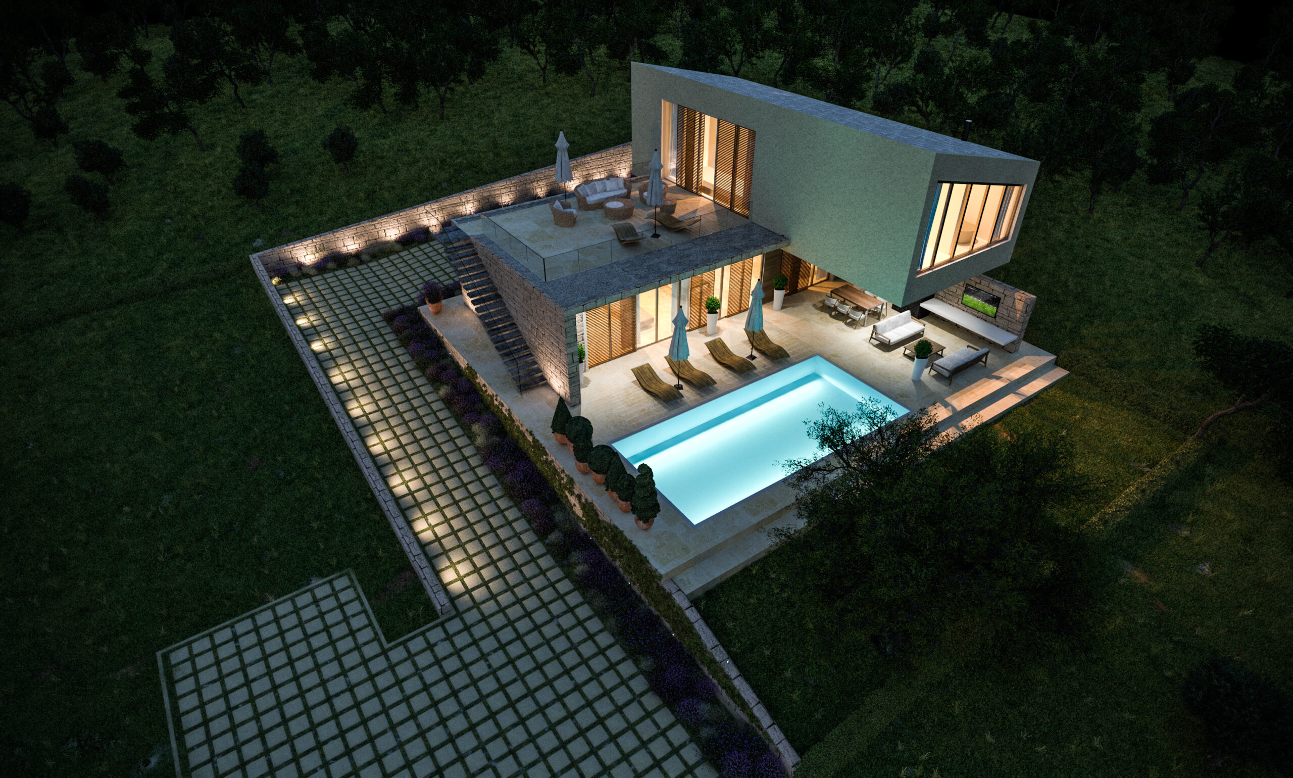 • Integracija unutarnjih i vanjskih prostora, uključujući bazen, natkrivene terase i ljetnu kuhinju