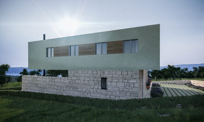 • Suvremena reinterpretacija tradicionalne otočke arhitekture kroz oblik L-kuće i pravilne proporcije