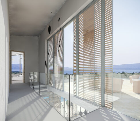 Projektirana vila koristi visokokvalitetne materijale, kombinirajući beton i armaturu za konstrukciju s drvenim i kamenom detaljima koji naglašavaju mediteranski karakter. Vanjski zidovi i kameni potporni zidovi uklapaju se u lokalni kontekst, dok natkrivene terase i prostrani otvoreni prostori omogućuju povezivanje interijera s okolišem. Krovne površine i terase dizajnirane su za maksimalnu funkcionalnost i estetiku, uz otpornost na klimatske uvjete otoka.