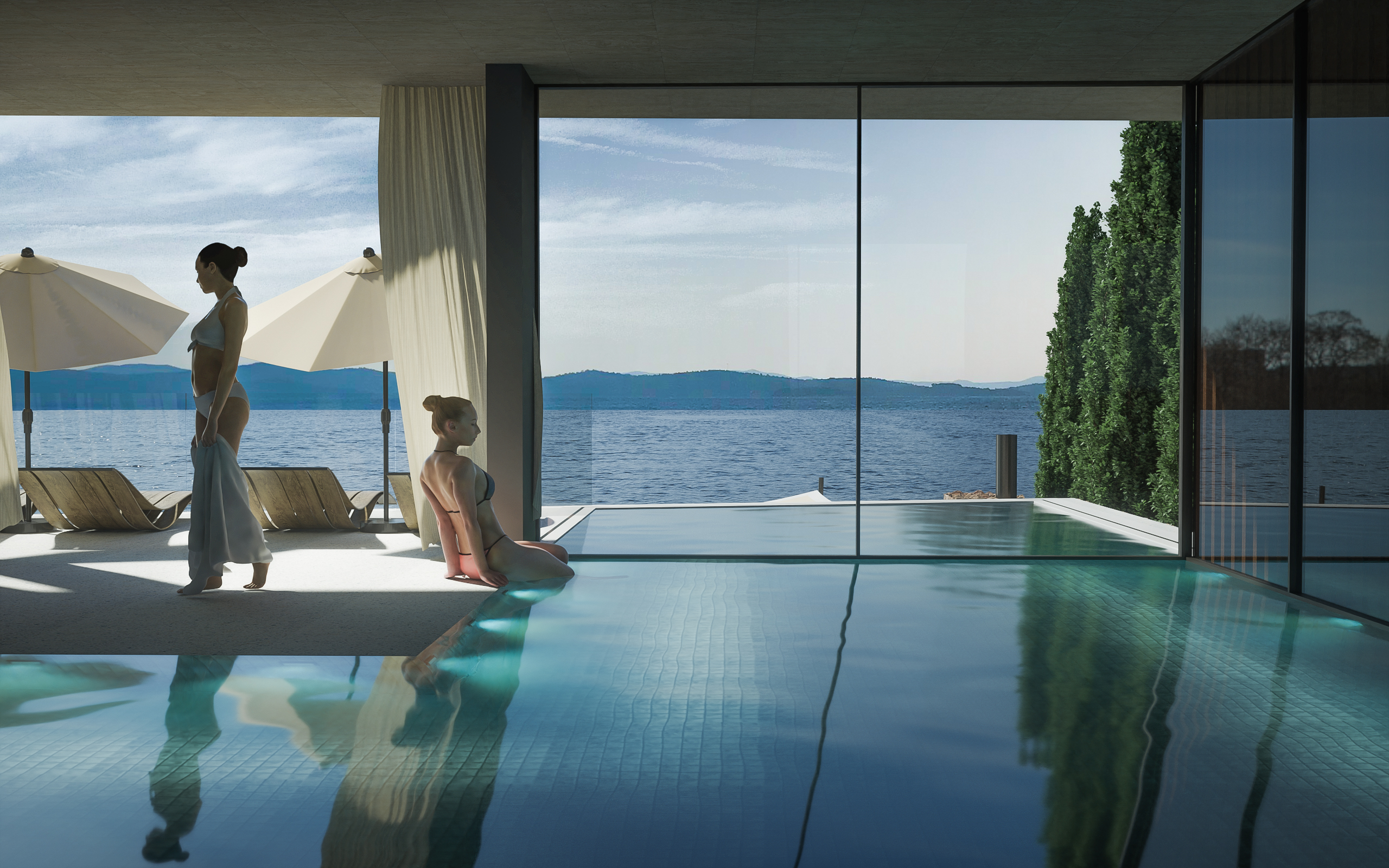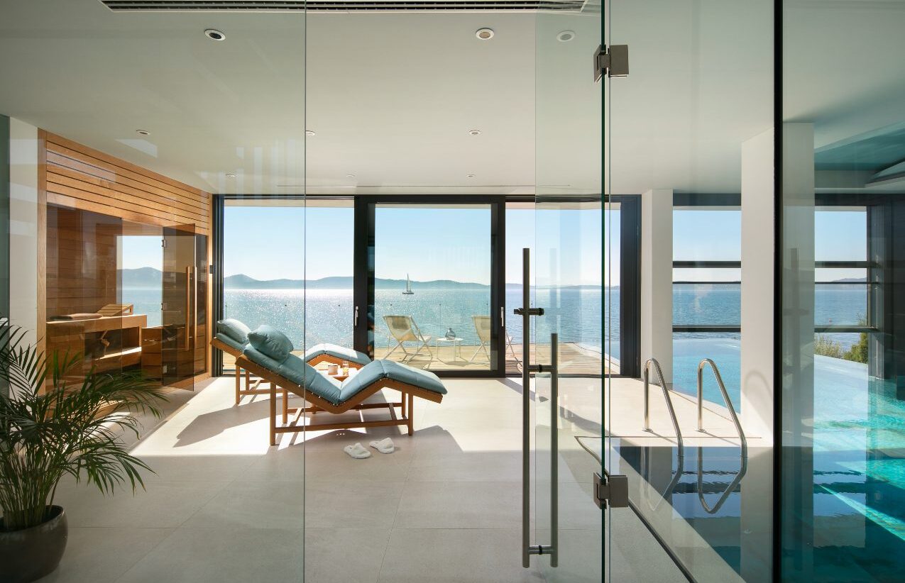 Na prvom katu nalazi se wellness prostor opremljen unutarnjim preljevnim bazenom i saunom s panoramskim pogledom. Sustav sklapanja staklenih stijena omogućuje njegovo korištenje i tijekom lošeg vremena, pretvarajući ga u zatvoreni prostor bez gubitka kontakta s okolišem.