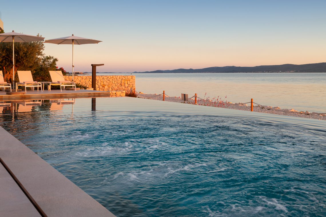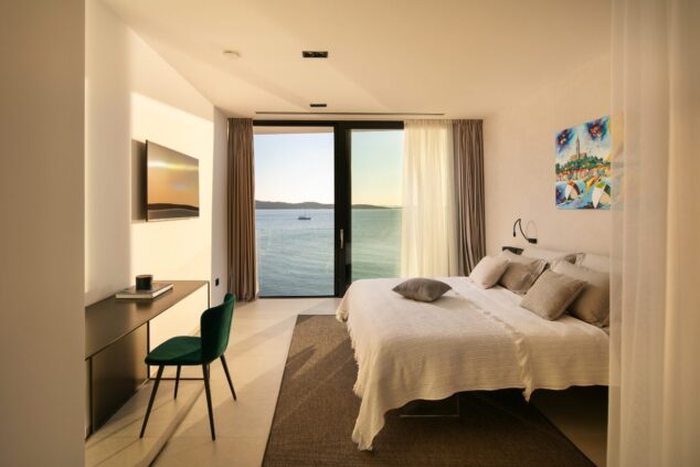 Vila se nalazi na iznimnoj lokaciji samo nekoliko metara od mora, uz mirnu plažu i otvorene poglede na otoke Pašman i Ugljan. Njena pozicija omogućuje neposrednu vezu između dnevnog života i jadranskog pejzaža — more postaje prirodan produžetak interijera, dok velike staklene stijene omogućuju nesmetan vizualni kontakt s okolišem.