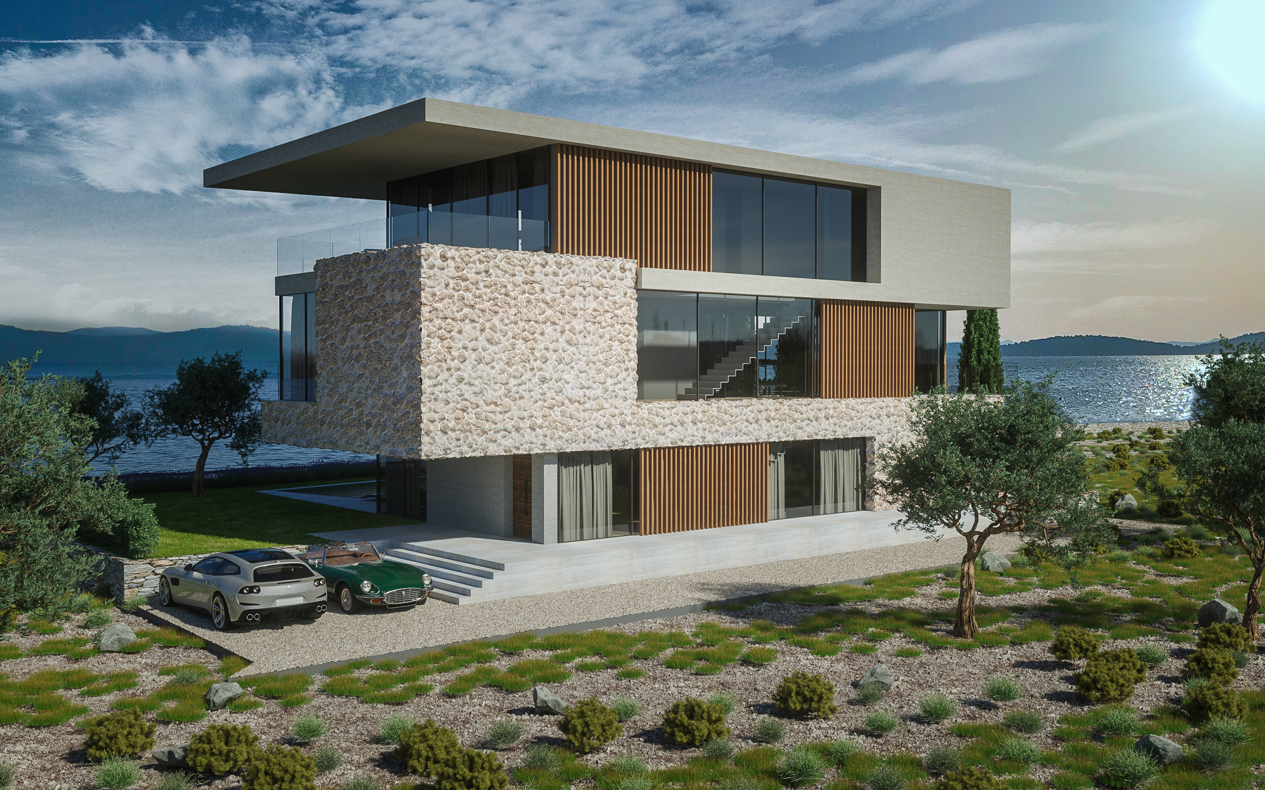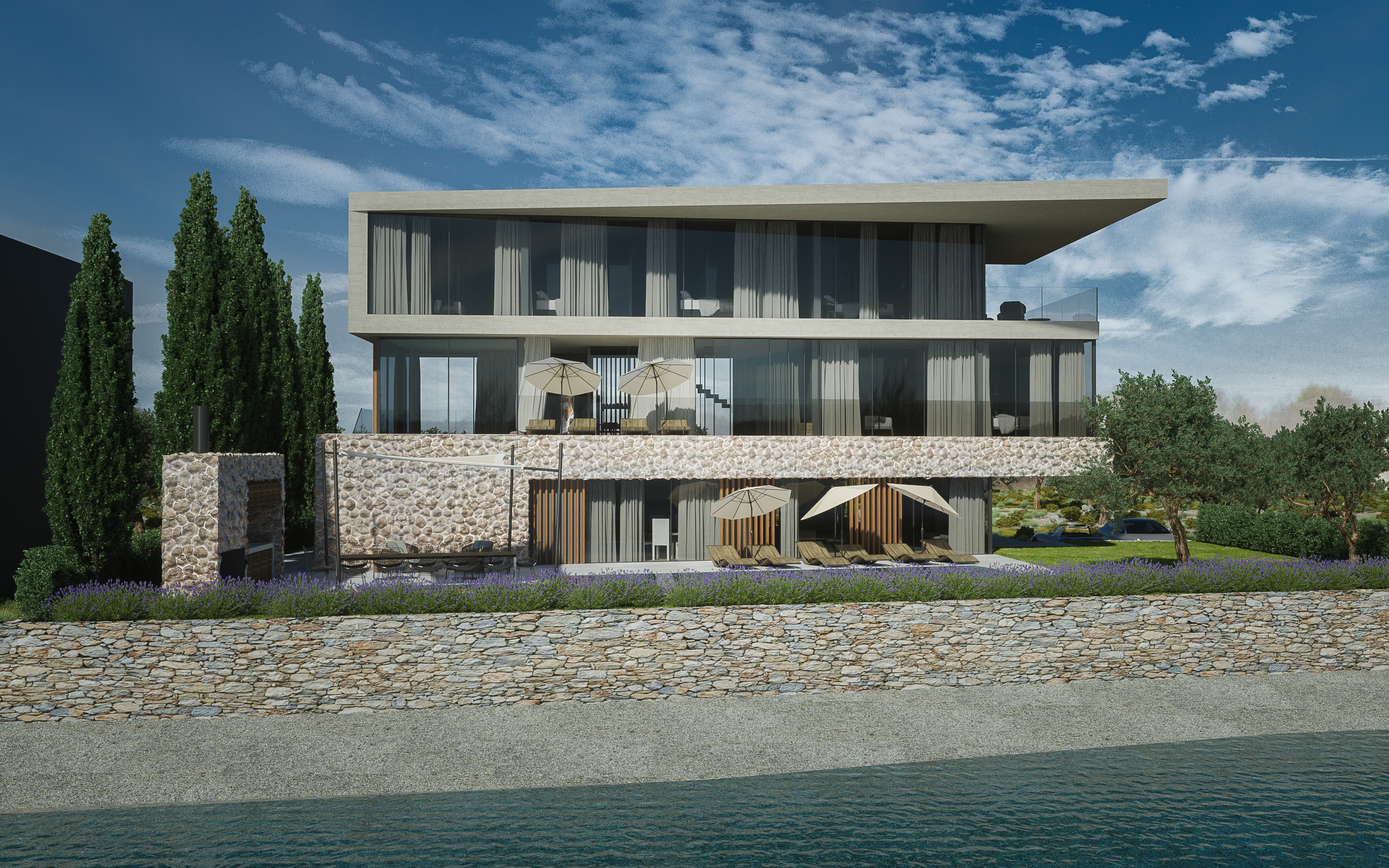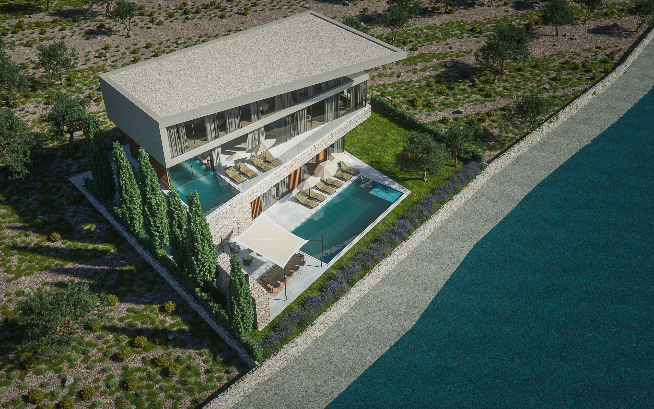 Vila je organizirana otvoreno prema moru; velike staklene stijene dnevnih prostora otvaraju se prema vanjskoj terasi i izrazito velikom bazenu s mogućnošću grijanja i hlađenja vode. Vanjski prostori, uključujući travnati vrt s mediteranskim biljem i agrumima, pažljivo su projektirani kako bi nadopunjavali arhitekturu i omogućili različite načine boravka uz more.