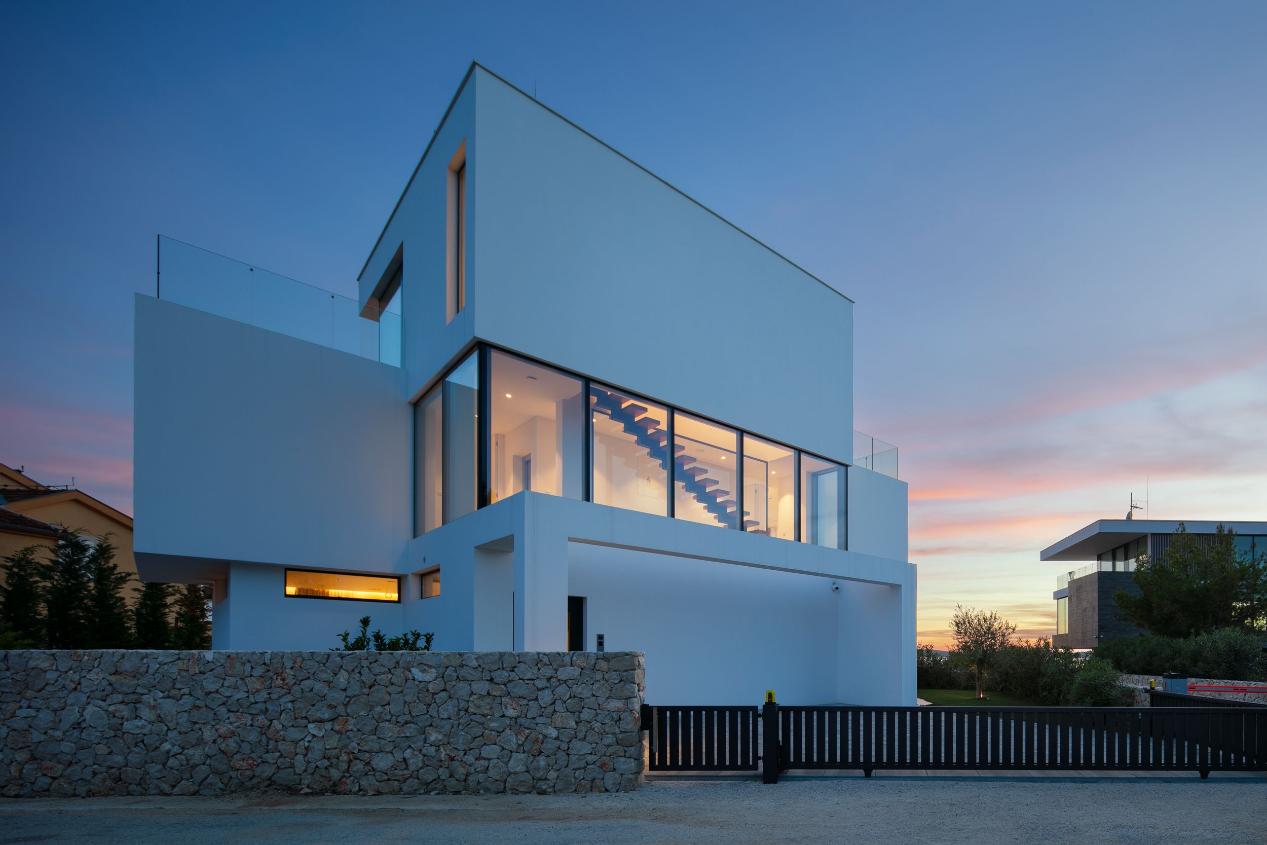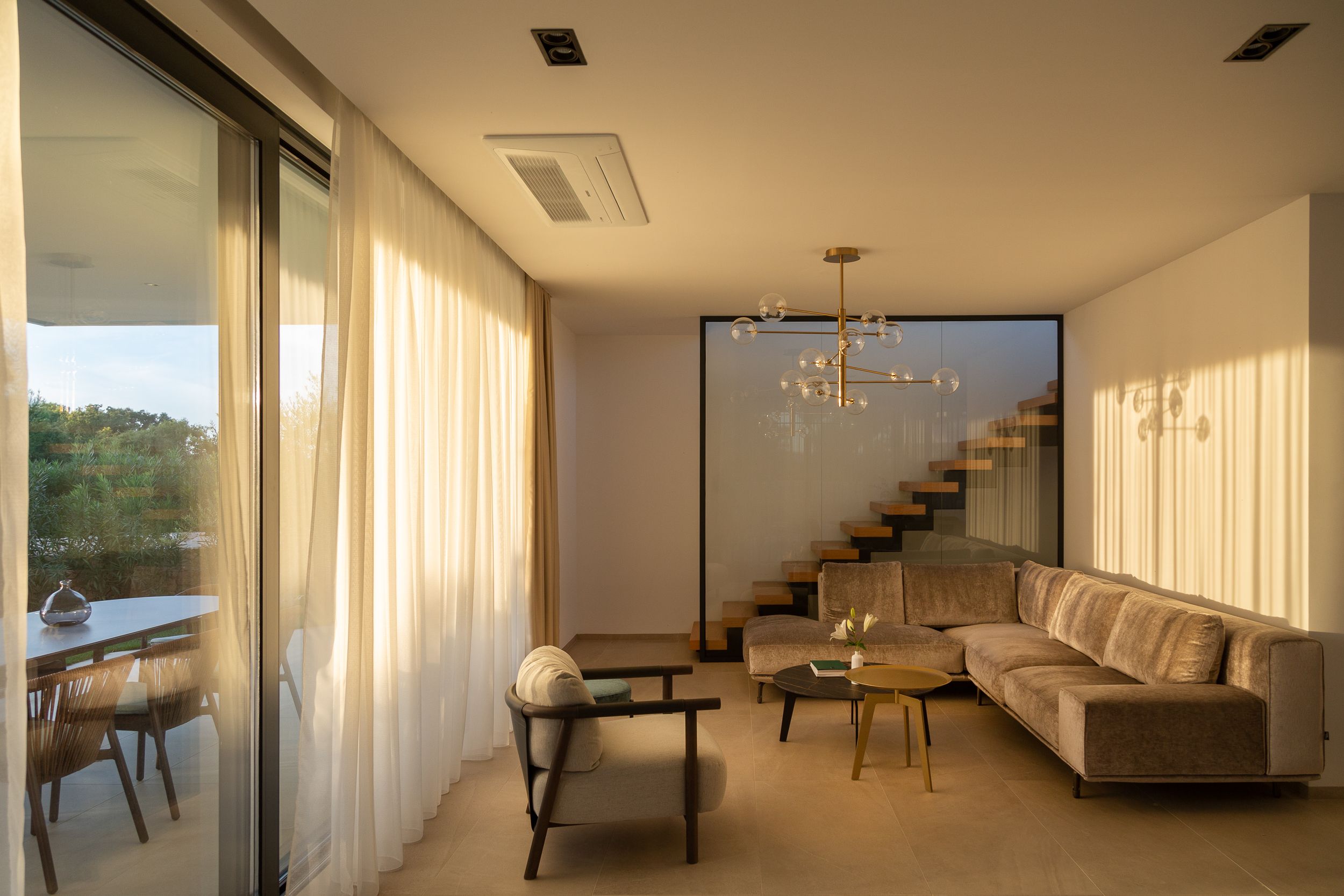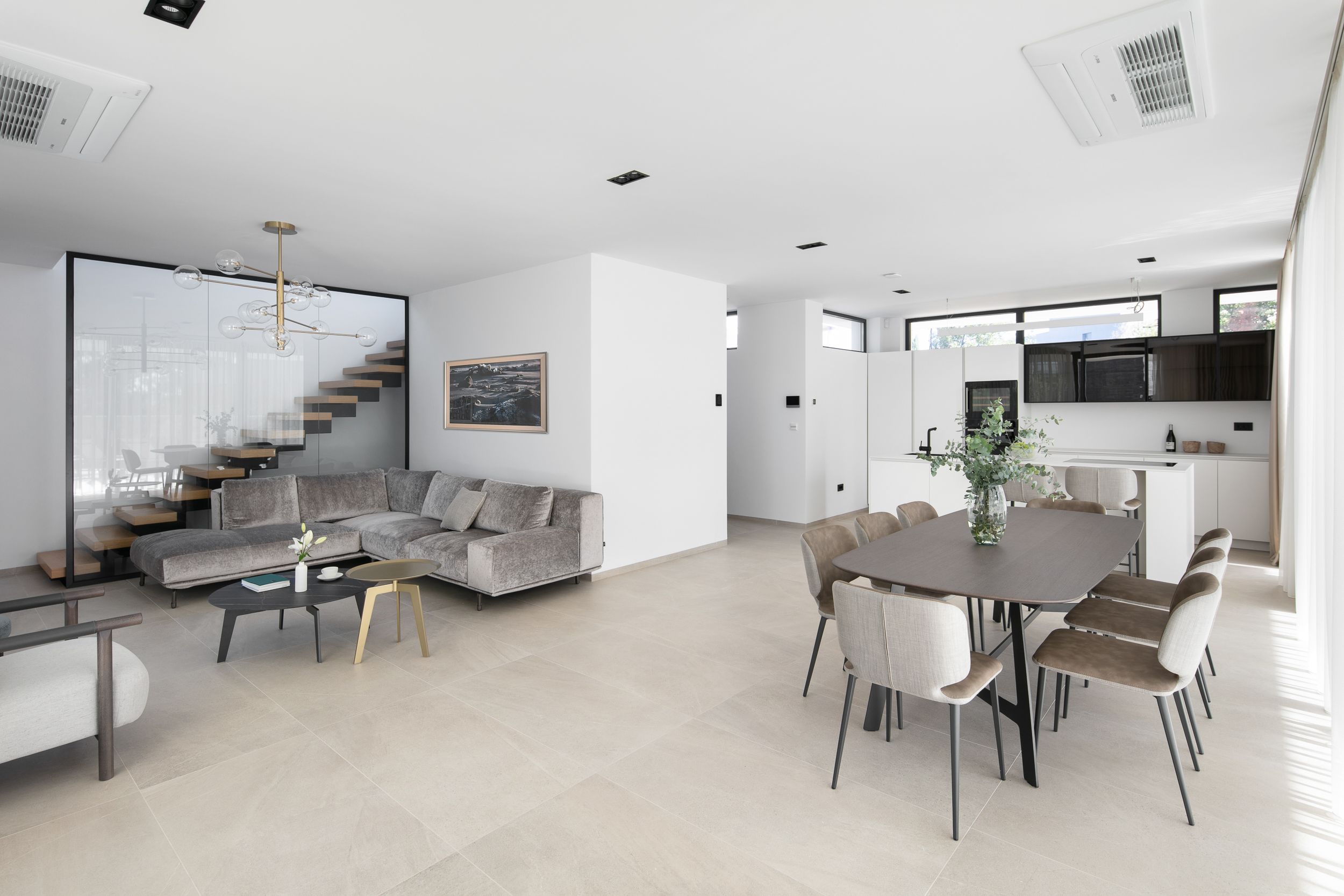 U prizemlju se prostire prostrani otvoreni koncept koji povezuje kuhinju, blagovaonicu i dnevni boravak s velikim natkrivenim terasama, stvarajući neprekidan protok između unutarnjeg i vanjskog prostora. Stakleni zidovi od poda do stropa maksimalno koriste prirodno svjetlo i uokviruju dinamične poglede, dok visokokvalitetni materijali i završne obrade naglašavaju suvremeni karakter vile.