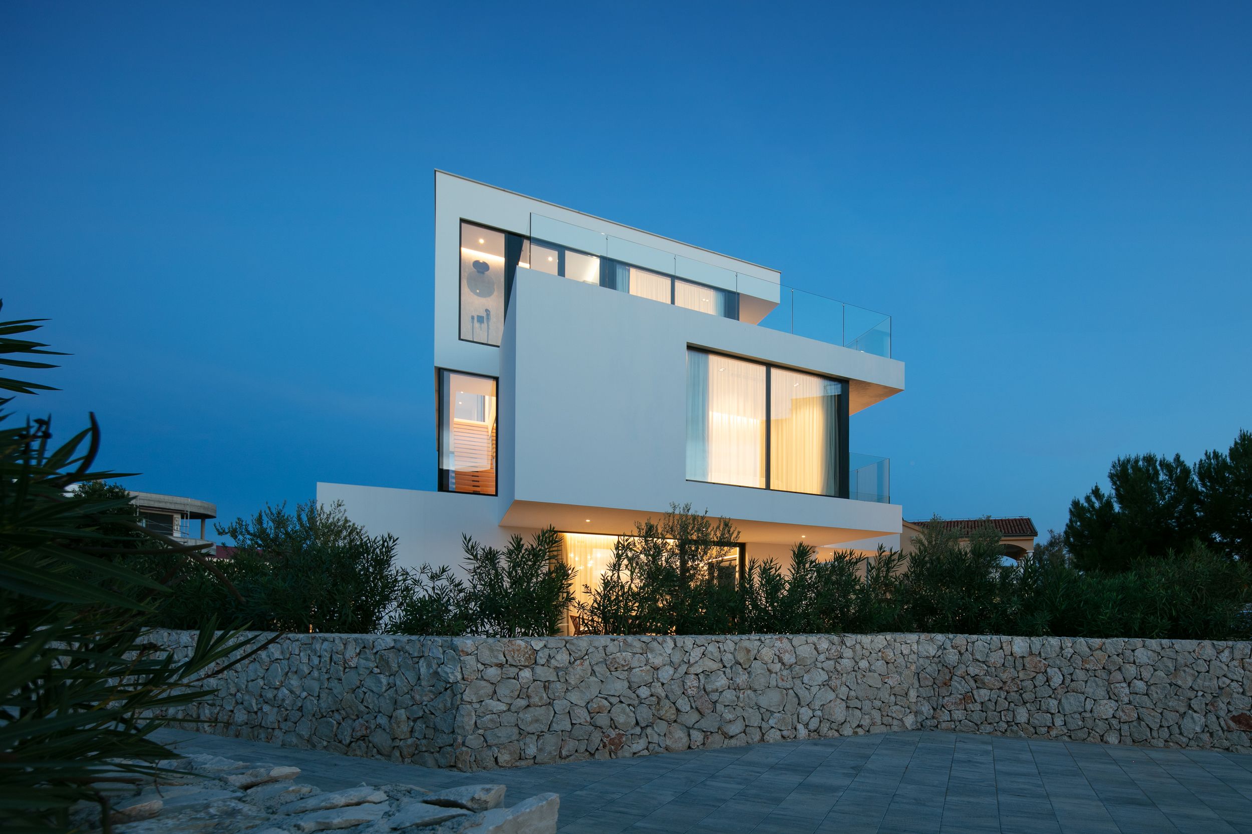 Na prvom katu nalaze se tri luksuzno opremljene spavaće sobe, svaka s vlastitom kupaonicom i izlazom na terasu, pružajući privatnost i komfor s panoramskim pogledom. Drugi kat uključuje dodatnu spavaću sobu s en-suite kupaonicom i prostrani wellness prostor s direktnim pristupom terasi – prostor za opuštanje uz prekrasan pogled na more i okolni krajolik.