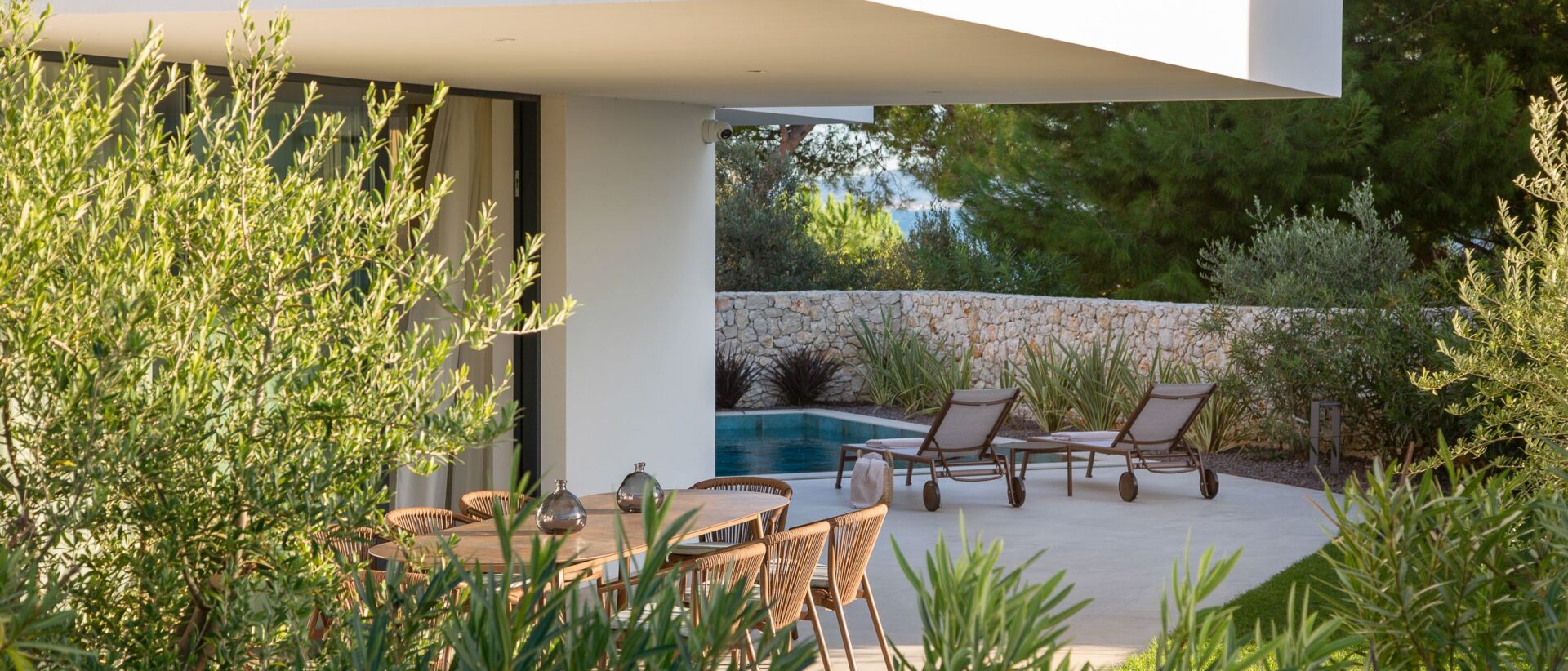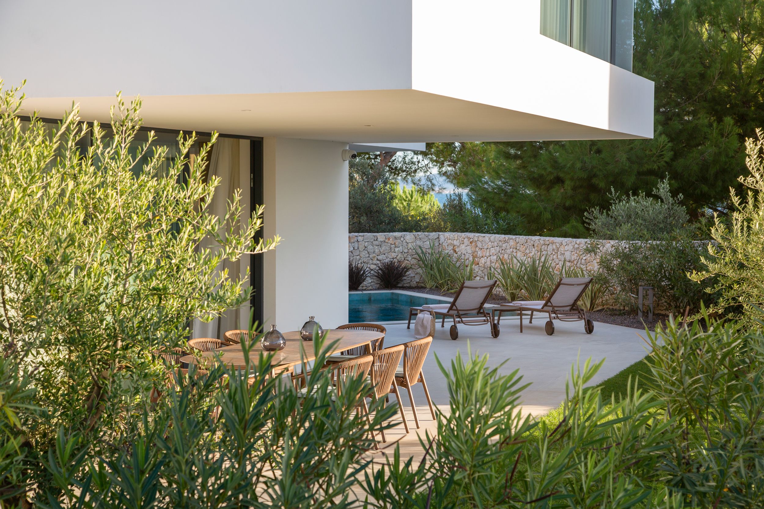 Vila je otvorena prema vanjskim prostorima, gdje je središnji element 45 m² veliki grijani bazen. Natkrivene terase i vanjski prostori za opuštanje strateški su pozicionirani kako bi omogućili panoramski pogled na more i maksimalno uživanje u životu na otvorenom tijekom cijele godine.