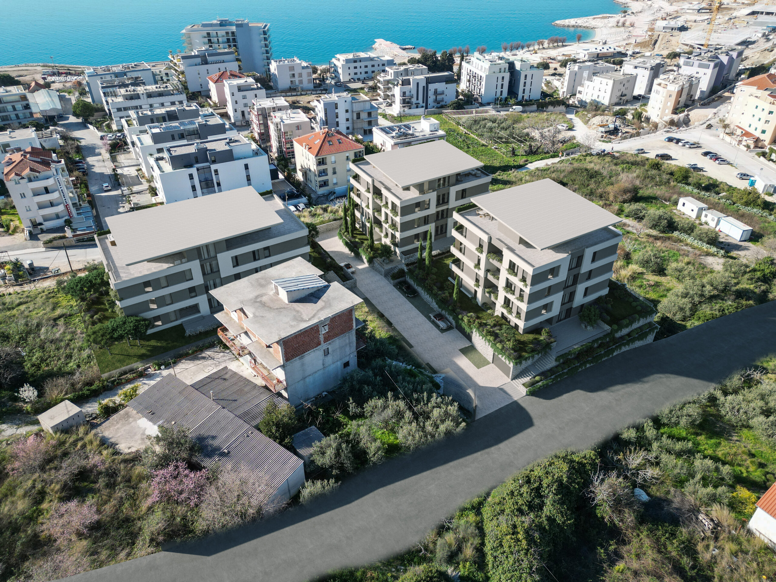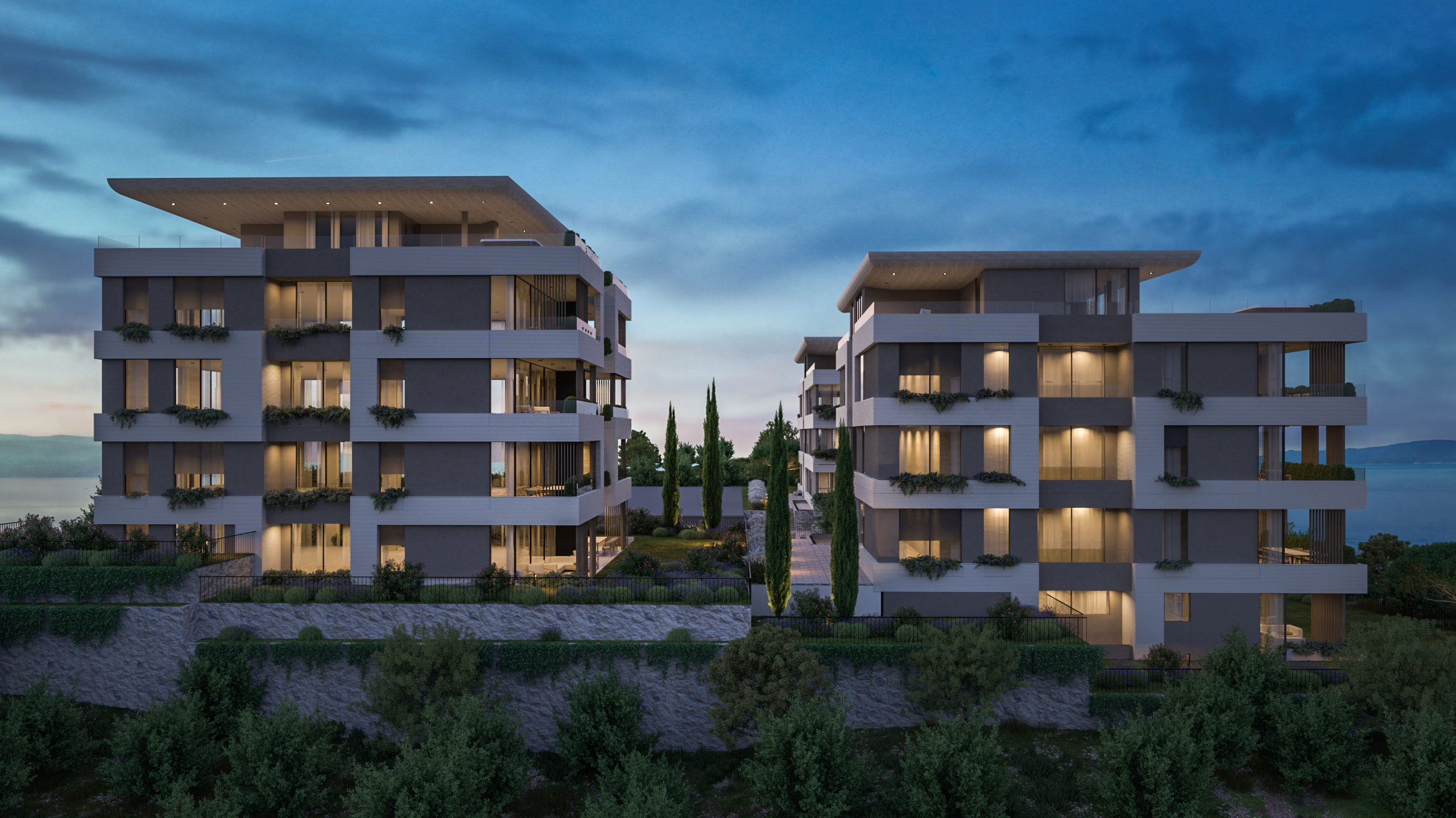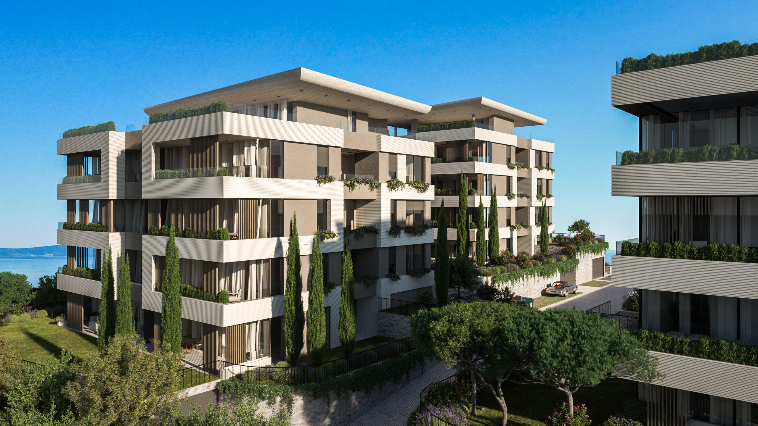 Balkoni i terase obogaćeni su mediteranskom vegetacijom, koja omekšava pročelja, stvara vizualni “zeleni jastuk” između privatnih i javnih prostora te potiče osjećaj kontinuiteta s prirodnim okolišem. Uz to, pažljivo projektirani vrtovi doprinose skladnoj integraciji arhitekture u okoliš i dodatno unapređuju kvalitetu života stanara.