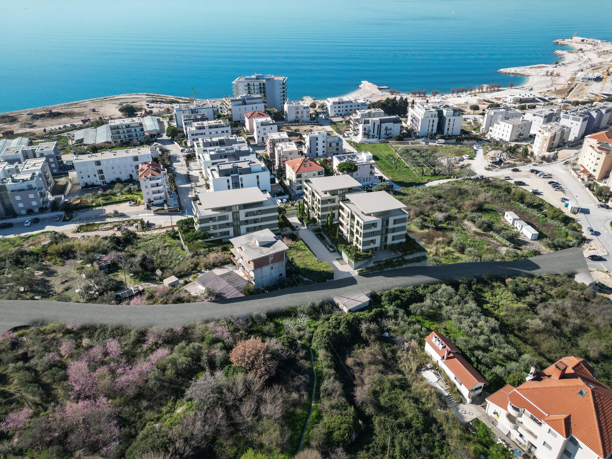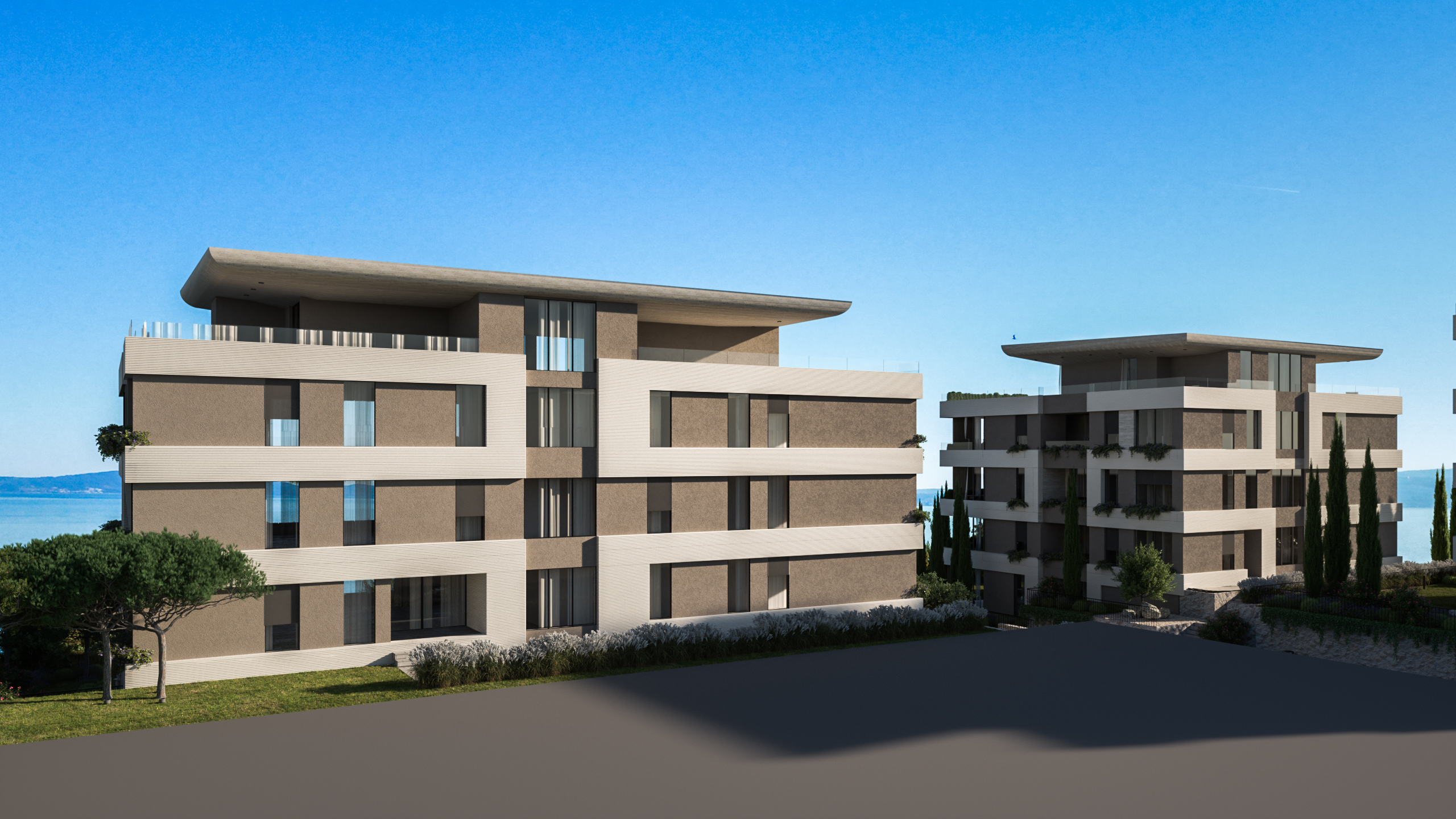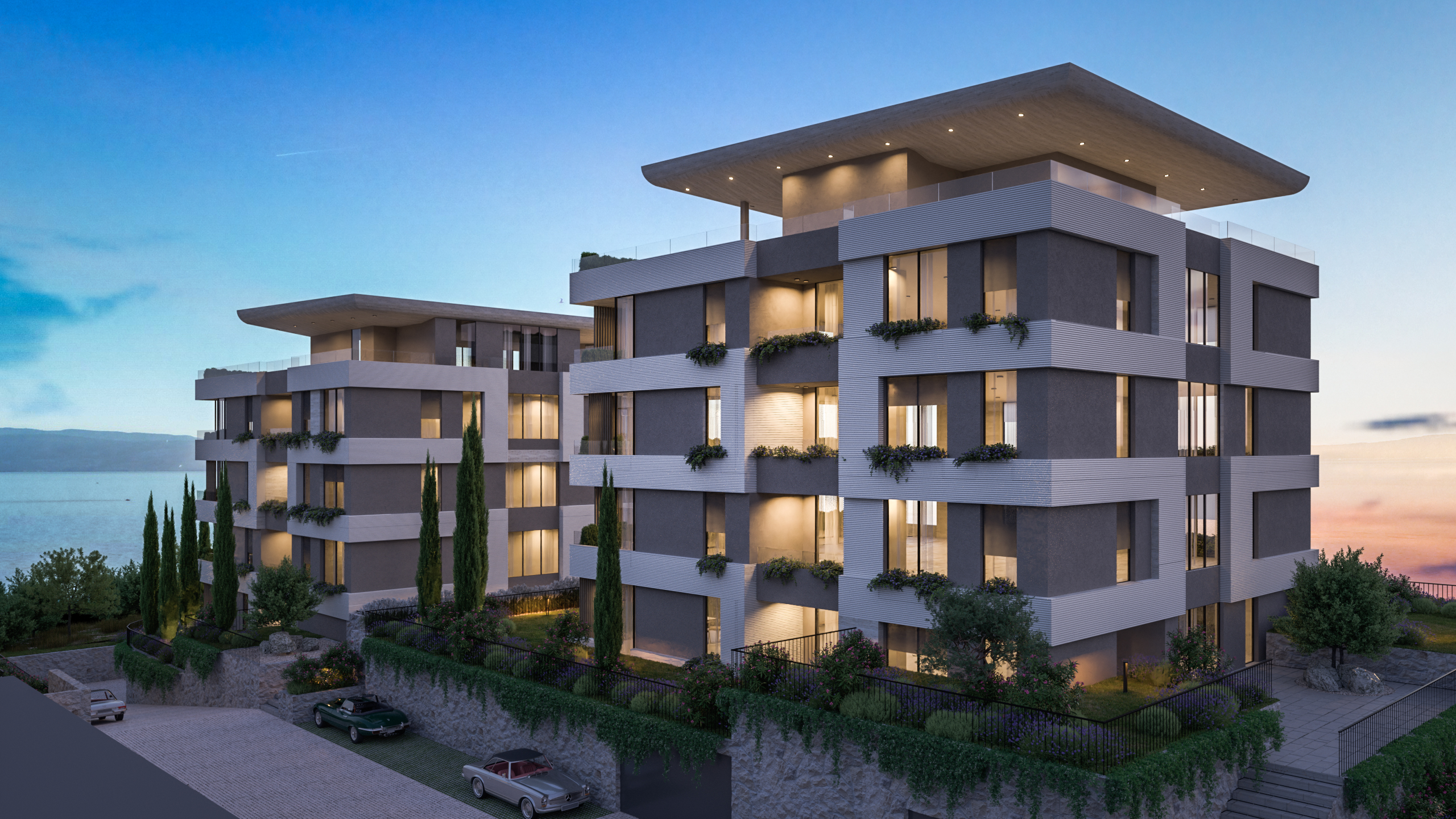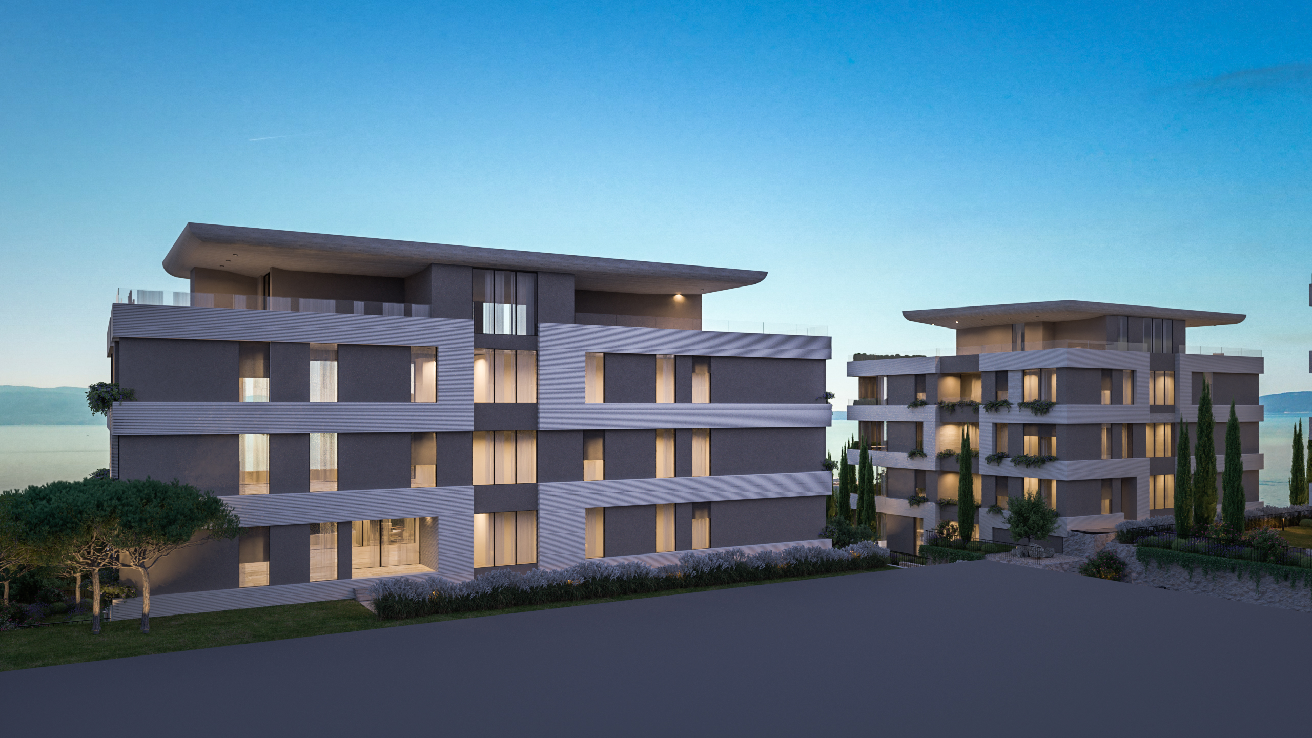 Balkoni i terase obogaćeni su mediteranskom vegetacijom, koja omekšava pročelja, stvara vizualni “zeleni jastuk” između privatnih i javnih prostora te potiče osjećaj kontinuiteta s prirodnim okolišem. Uz to, pažljivo projektirani vrtovi doprinose skladnoj integraciji arhitekture u okoliš i dodatno unapređuju kvalitetu života stanara.