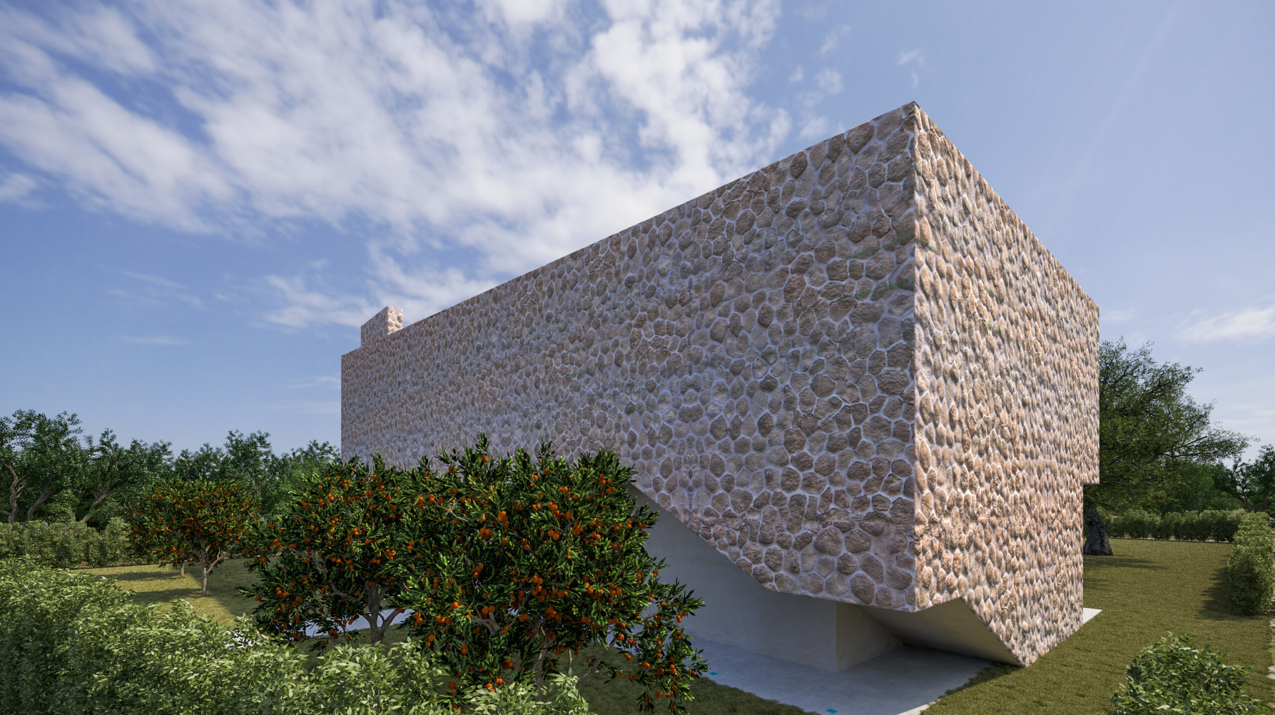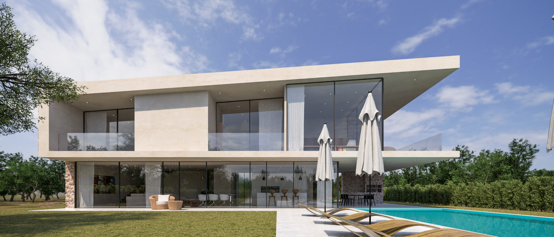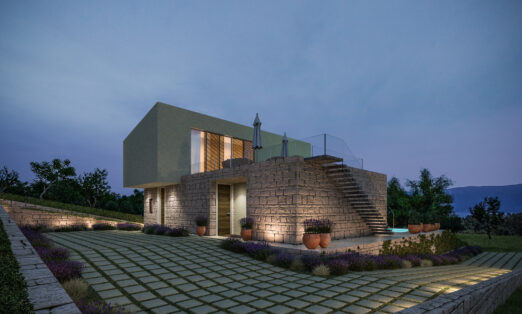 The architectural language is defined by a combination of stone cladding, smooth light-toned surfaces, and expansive glass façades. Stone introduces tactility and a reference to the local context, while clean lines and minimalist detailing highlight the contemporary character of the villa. Transparent glass railings further enhance the sense of lightness of the upper volume. The contrast between the solid stone element and the floating white roof plane creates a strong visual identity – the “two faces” of the architecture.