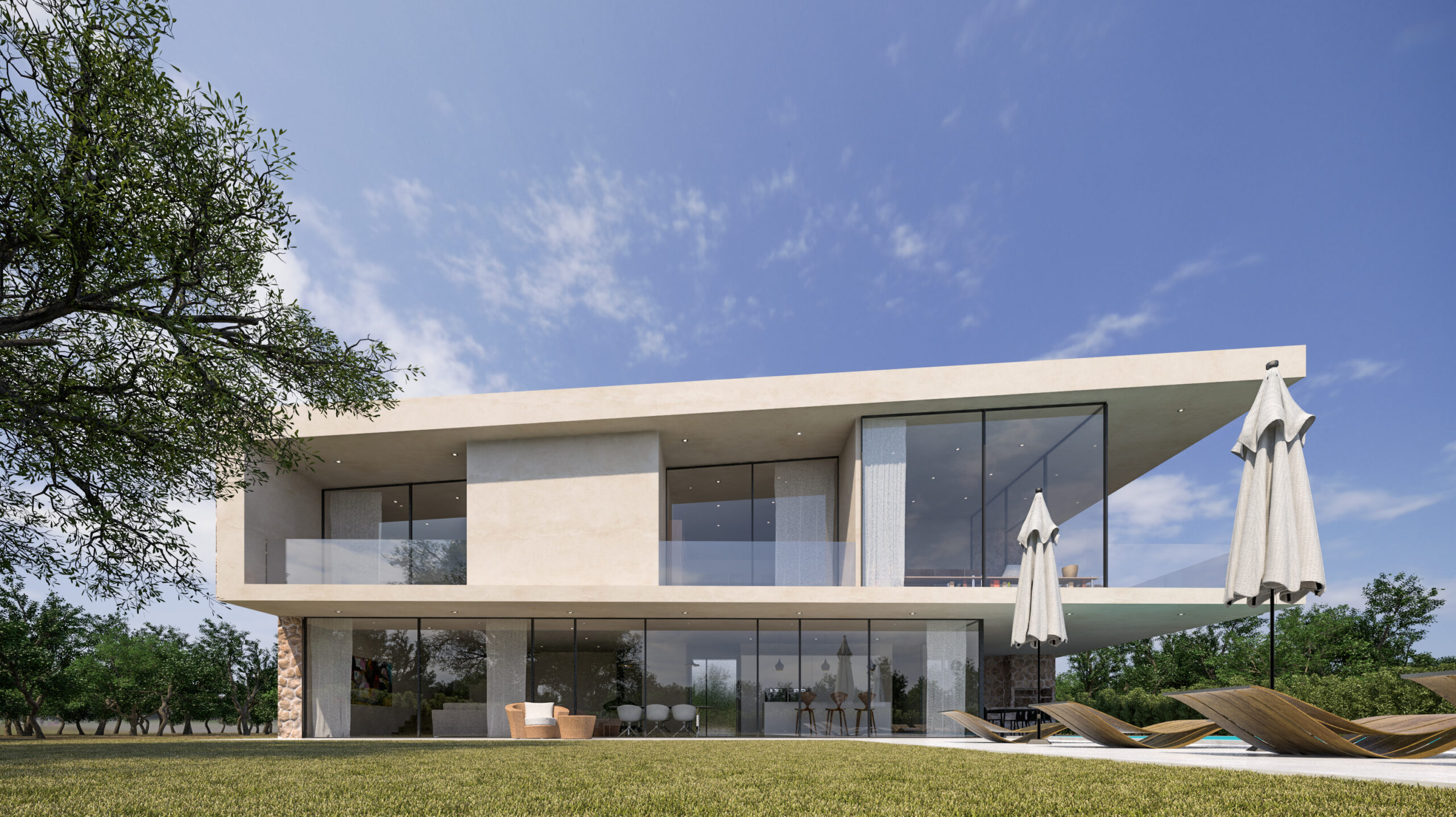 The spatial organization is developed across two levels, with the main living areas located on the ground floor and private zones on the upper floor. The ground level is fully oriented toward the garden and pool, with large glazed surfaces dissolving the boundary between interior and exterior. The covered terrace functions as a natural extension of the living space, forming a continuous environment for relaxation and social gatherings. The upper floor is conceived as a more intimate and tranquil zone, with panoramic openings that frame selected views and ensure controlled daylight exposure.