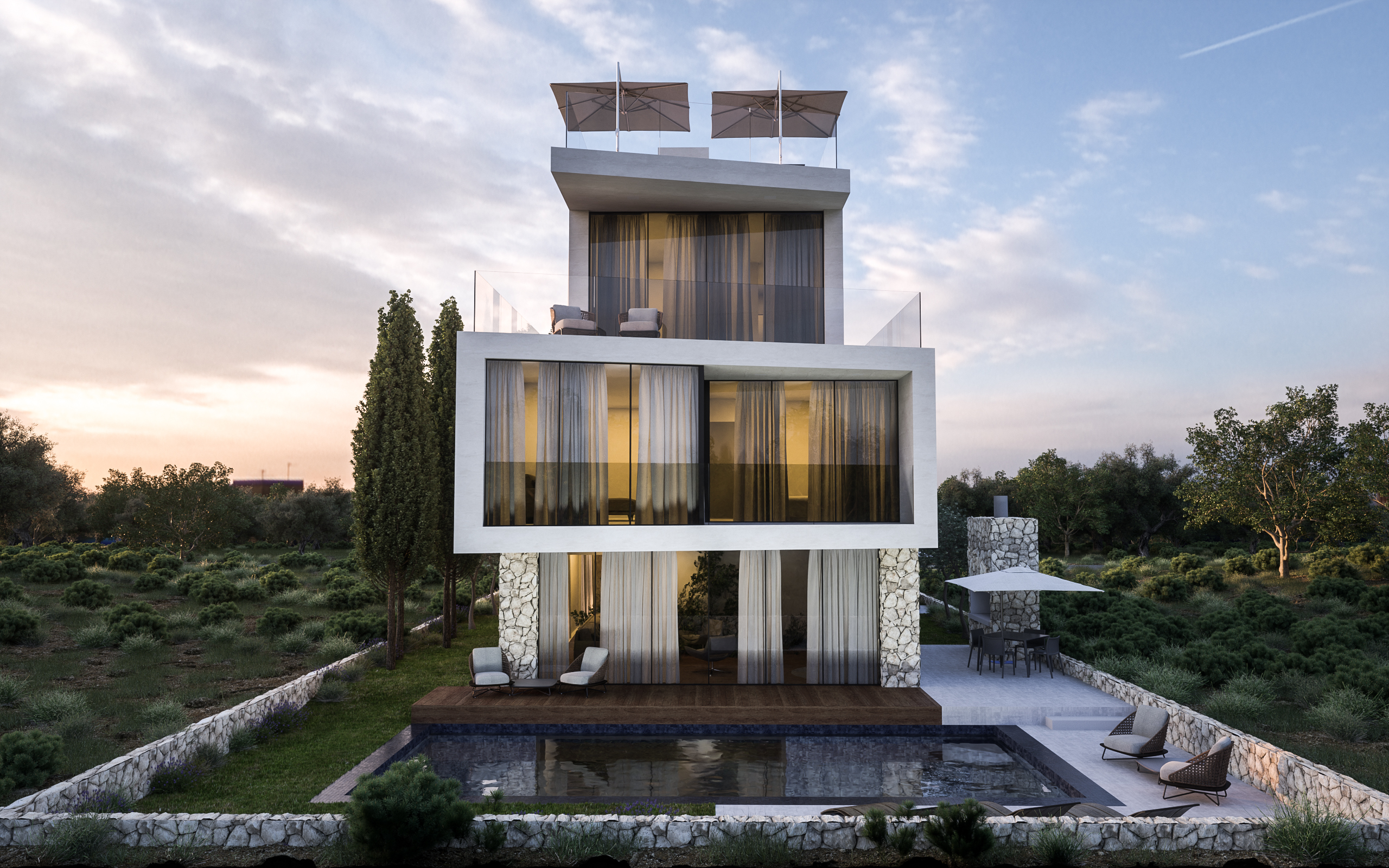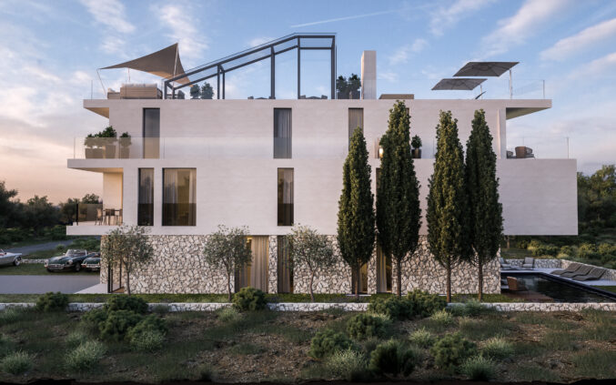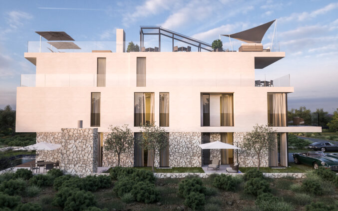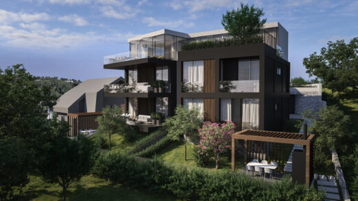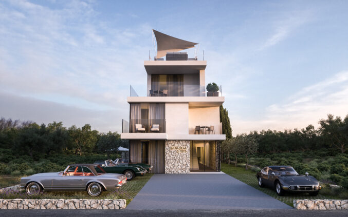 The architectural approach focuses on creating sophisticated and functional residential suites that combine contemporary design with local environmental conditions – emphasizing spaciousness, natural light, and visual connection to the surroundings. The volumes are shaped to ensure optimal orientation toward views and the site’s microclimate.
