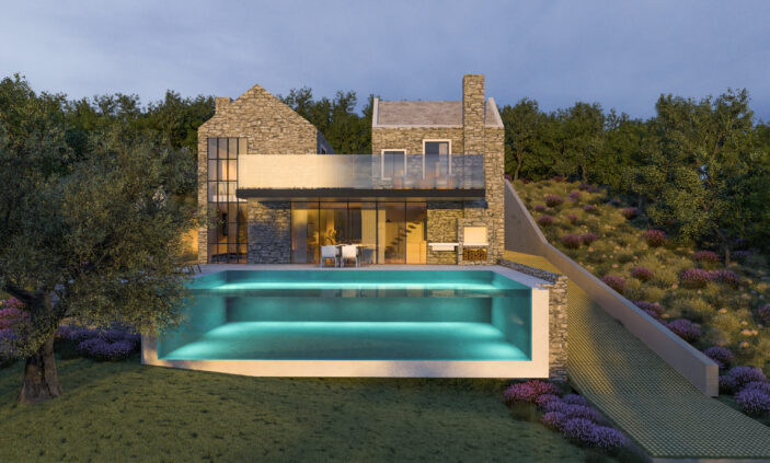 Natural stone is the dominant material, defining the volumes and giving the building strength and authenticity. The stone is combined with contemporary elements — large glass surfaces, minimalist metal details, and flat horizontal terraces — achieving a balanced contrast between tradition and modernity. Evening lighting further emphasizes the texture of the stone and the architectural articulation of the structure, creating a warm and sophisticated atmosphere.