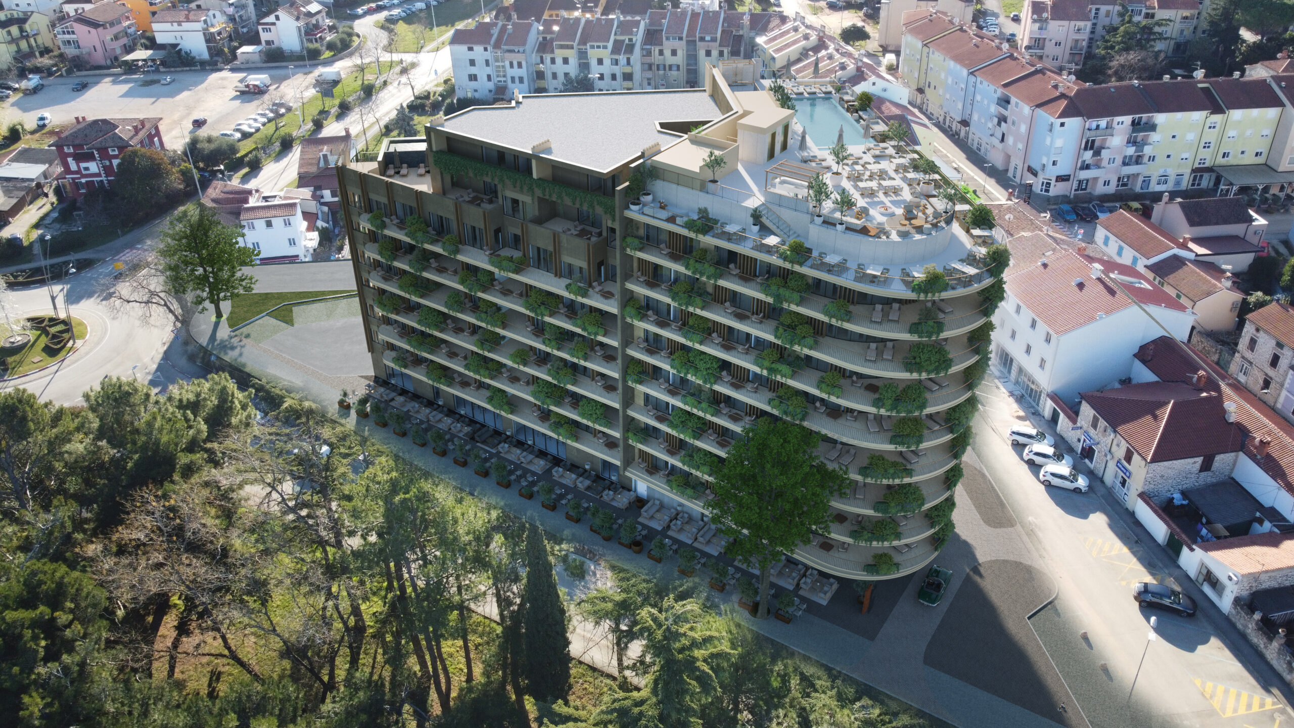 Green Tower is a contemporary hotel and residential complex located in the very center of Umag, conceived as a new urban vertical landmark with a strong emphasis on sustainability, green building practices, and a high level of comfort. Green balconies and landscaped terraces create a “vertical garden,” while the rooftop terrace with premium amenities becomes an exclusive living space offering views of the city and the sea. Through its architecture, the project subtly yet distinctly establishes a new reference point in Umag’s urban landscape.