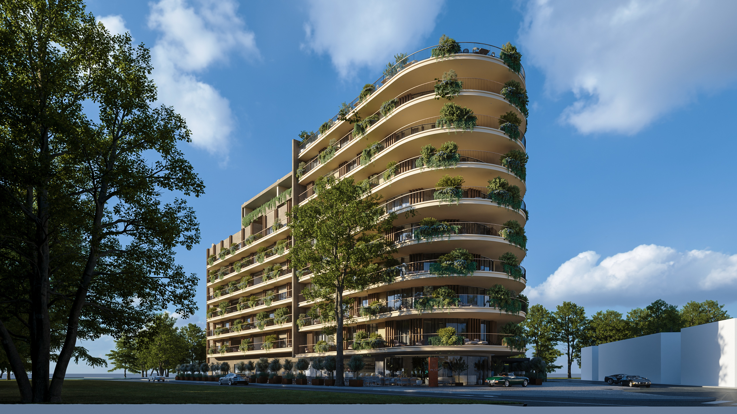 A strong emphasis is placed on sustainability and green building principles—landscaped balconies, terraces, and integrated vegetation create the concept of a “vertical garden,” improving the microclimate, reducing thermal loads, and enhancing overall quality of living.