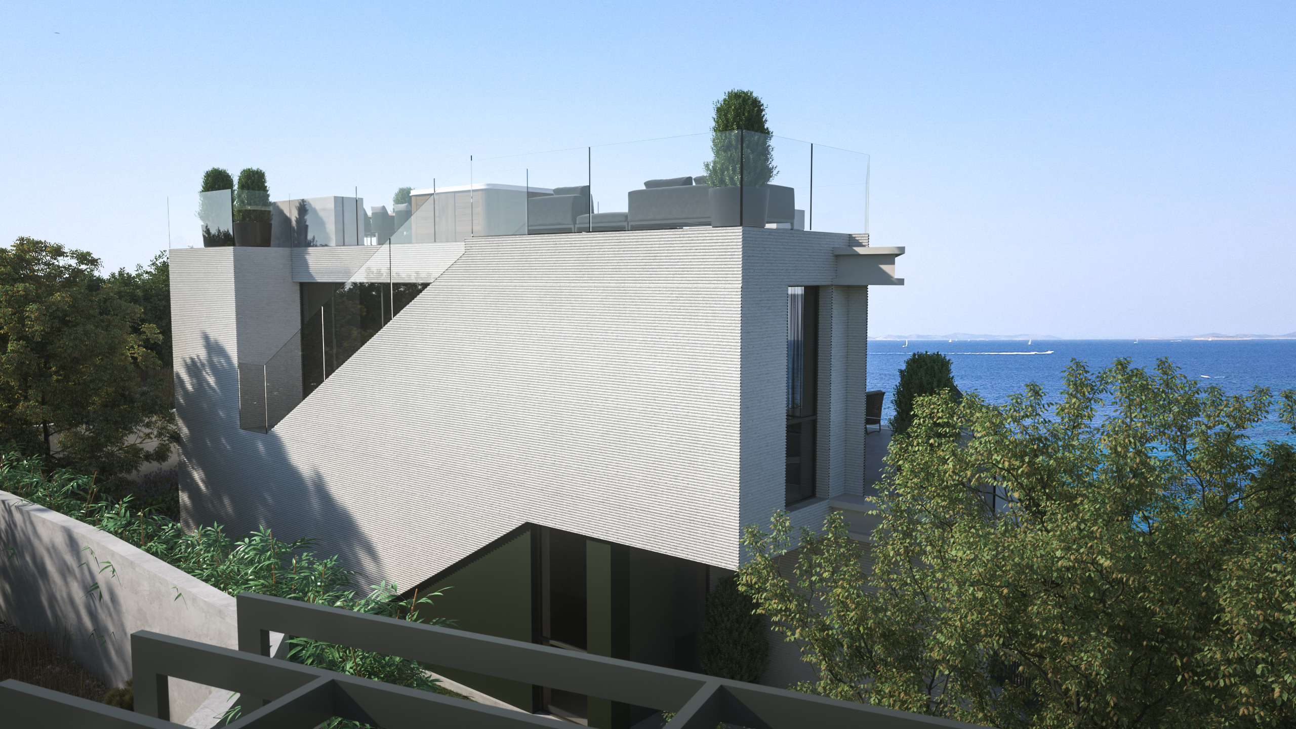 Although specific materials are not listed on the website, the visual documentation suggests carefully chosen surfaces that echo the Mediterranean character of the location — combining natural-toned facades with extensive glazing that brings abundant daylight into the interior.