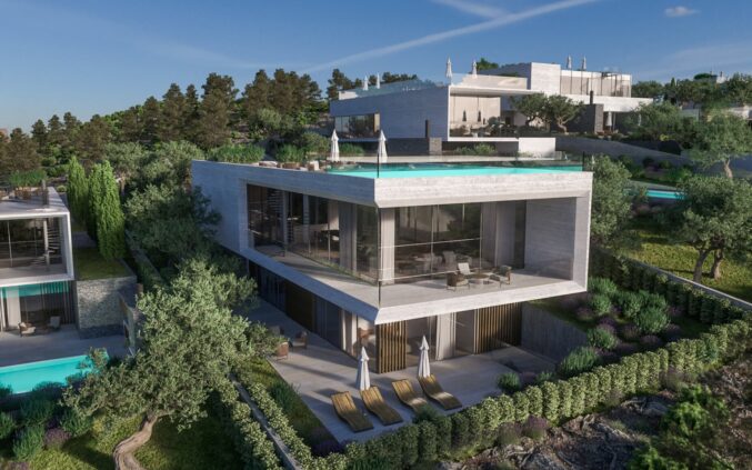The villa was designed in response to the site’s distinctive topography and its exceptional position offering panoramic views of the sea and the surrounding landscape. The volumes are carefully positioned to maximize visual connections while minimizing the building’s impact on the natural environment. The architecture is based on principles of contemporary Mediterranean design—clean lines, clearly defined masses, and a strong connection between interior and exterior spaces.