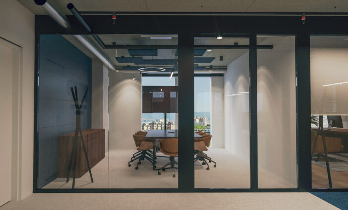 The layout includes expansive open-plan work areas, glazed meeting rooms, two representative reception areas, lounge spaces for breaks and informal employee gatherings, and a three-part multimedia hall adaptable for larger meetings and presentations. Special attention was given to the use of wood, natural stone, and neutral tones, achieving a balance between business rationality and a comfortable ambiance. Transparent glass partitions allow natural light to penetrate deep into the floor plan while maintaining visual connectivity. Carefully planned acoustics ensure functionality within large open workspaces. Most furniture and joinery elements were custom-designed and produced to align precisely with the project concept and the client’s specific operational needs.