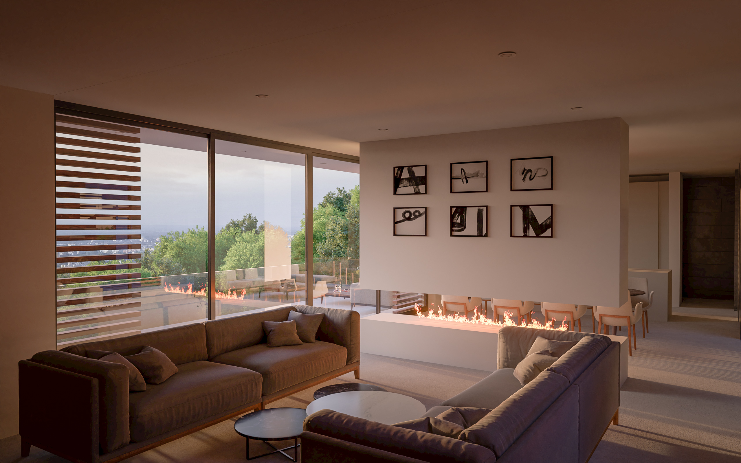 In this project are used high‑quality materials – such as refined stone, timber, and expansive glazing – that enhance tactile richness and visual continuity. The material palette supports a timeless aesthetic while reinforcing a sense of warmth and luxury.