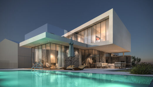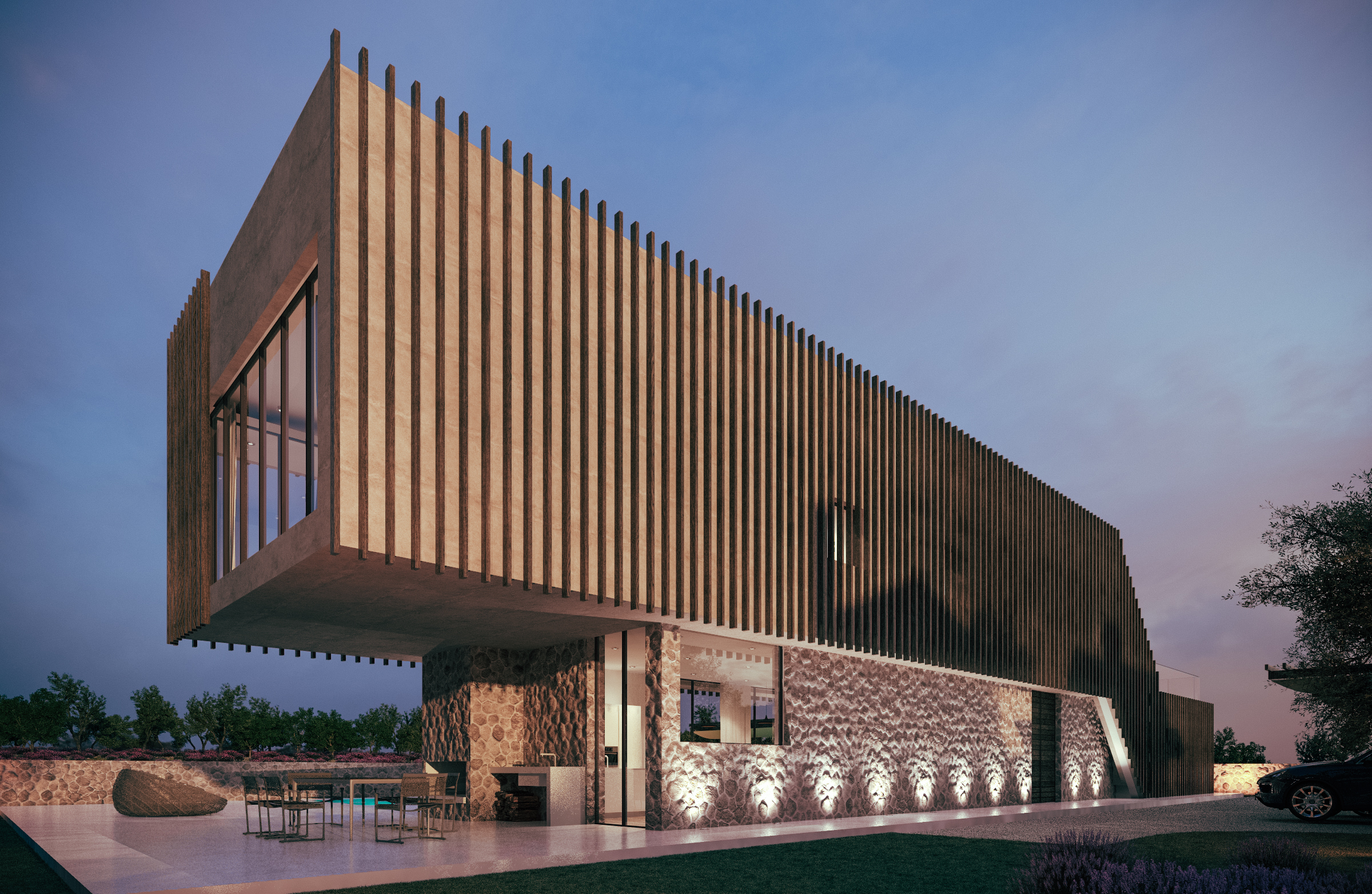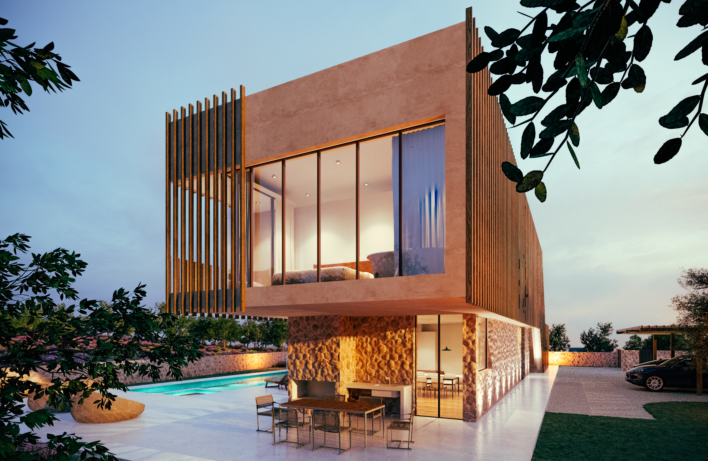 Natural materials dominate the design, with stone and wood playing a central role. Stone is used for retaining walls and exterior accents, reinforcing the building’s connection to the local architectural context. Wood is applied in pergolas, window frames, and interior finishes, adding warmth and texture. The villa’s construction prioritizes durability and environmental integration. Careful attention to facade materials, finishes, and detailing ensures a cohesive aesthetic that complements the Mediterranean landscape.