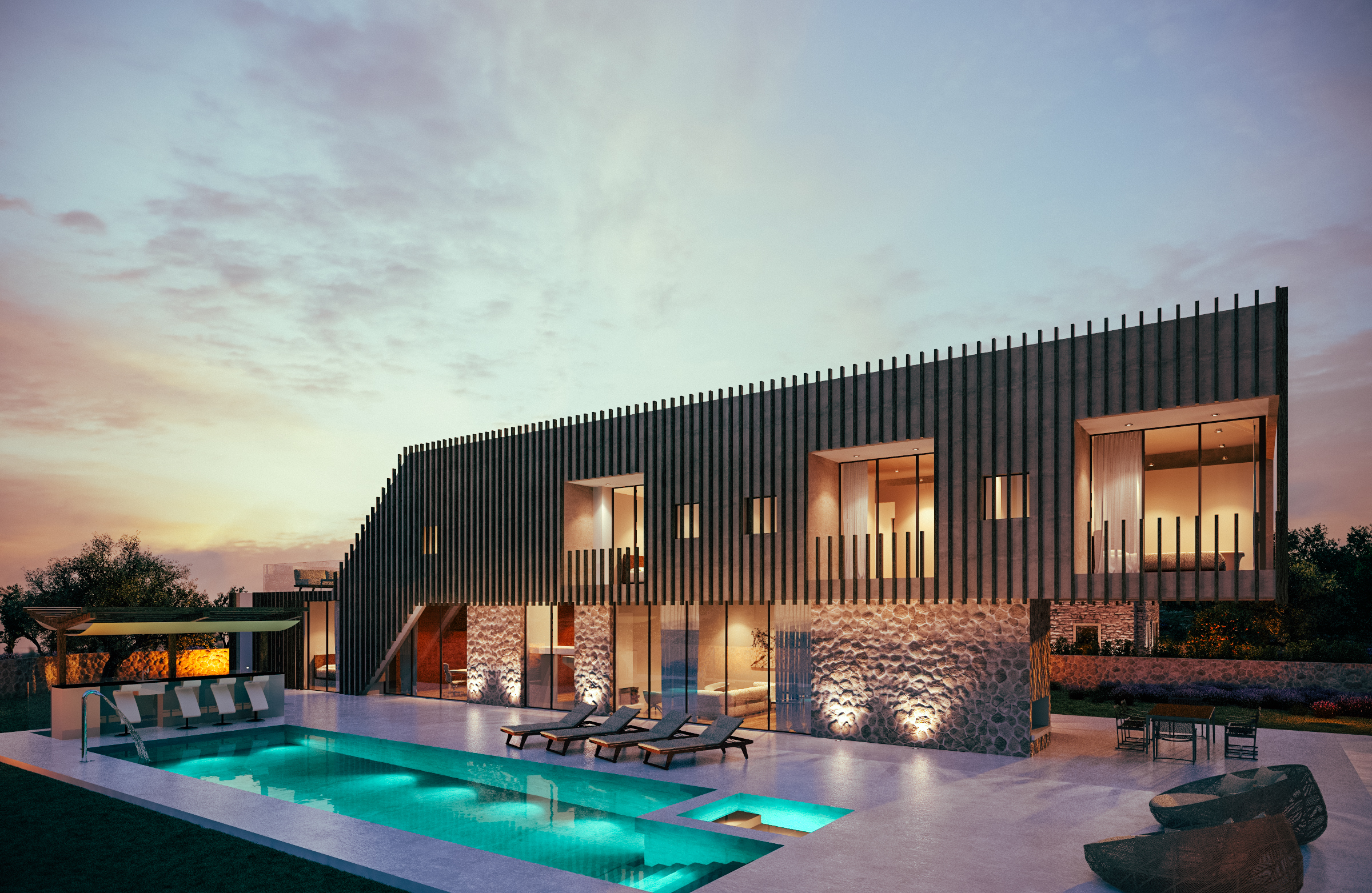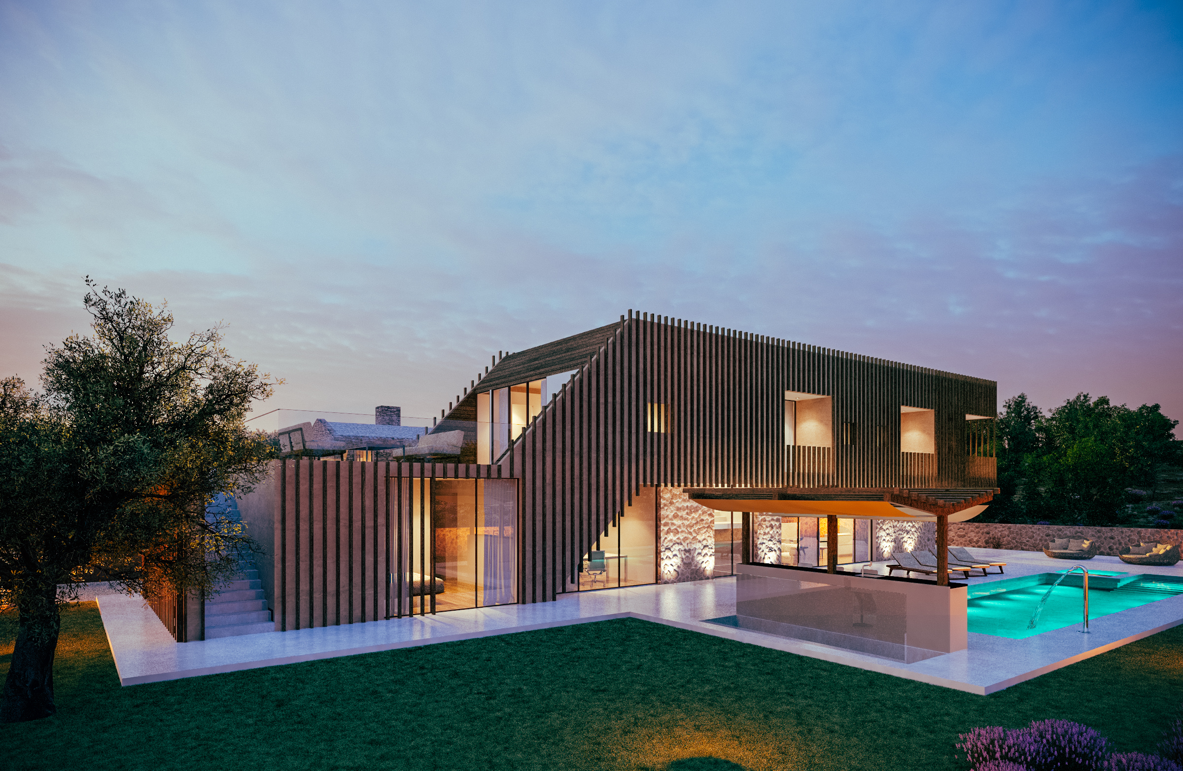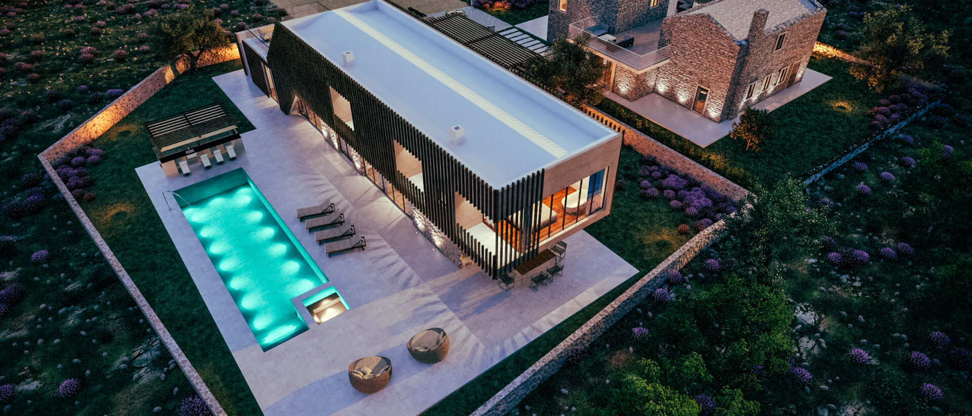 The villa is a two-unit family home that blends modern architecture with traditional local elements. Its form is inspired by the elongated shapes and proportions typical of Istrian residential architecture, while the overall layout has been adapted to contemporary needs. The structure features a combination of straight lines and subtle L-shaped arrangements, creating a dynamic composition that respects traditional forms. Public and private areas are clearly separated, with living, dining, and leisure spaces seamlessly connected to outdoor terraces, gardens, and a swimming pool.