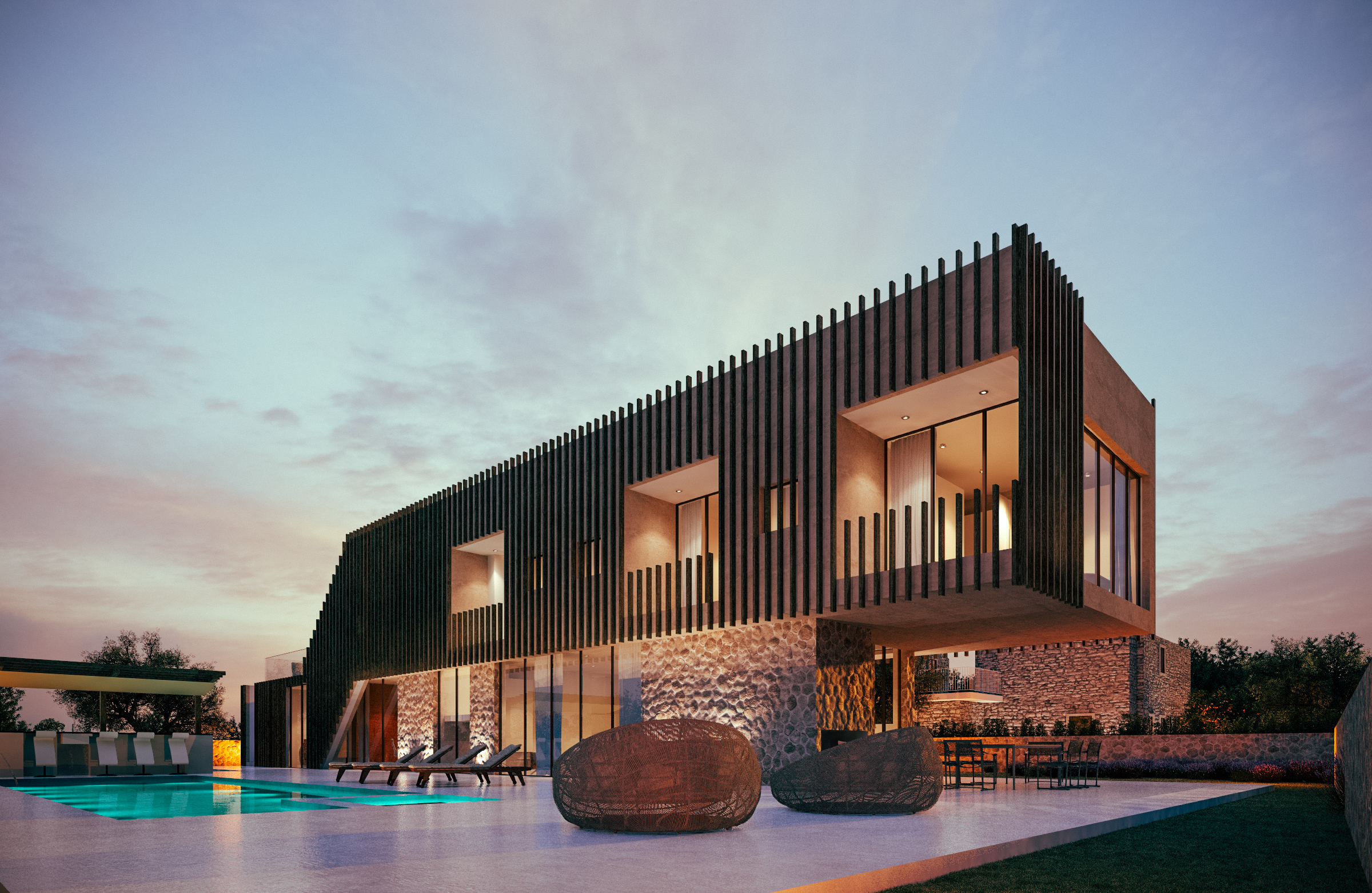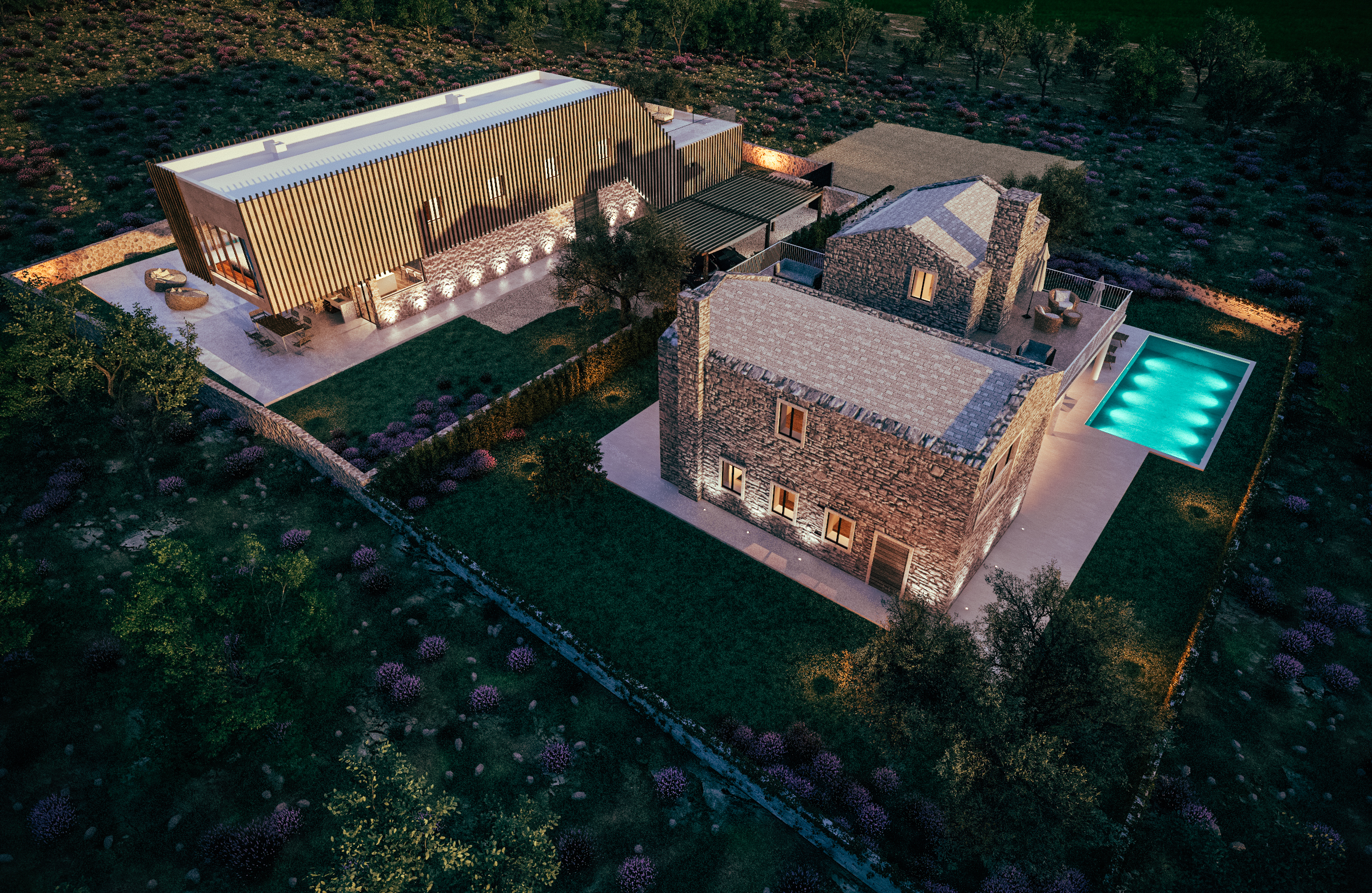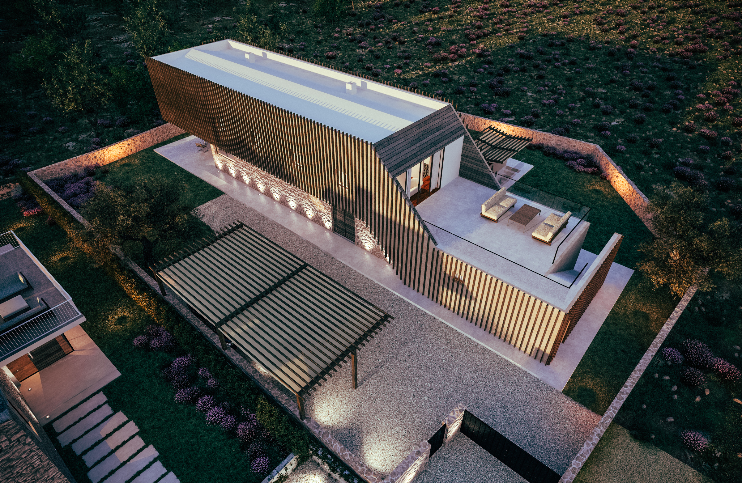 The villa is a two-unit family home that blends modern architecture with traditional local elements. Its form is inspired by the elongated shapes and proportions typical of Istrian residential architecture, while the overall layout has been adapted to contemporary needs. The structure features a combination of straight lines and subtle L-shaped arrangements, creating a dynamic composition that respects traditional forms. Public and private areas are clearly separated, with living, dining, and leisure spaces seamlessly connected to outdoor terraces, gardens, and a swimming pool.