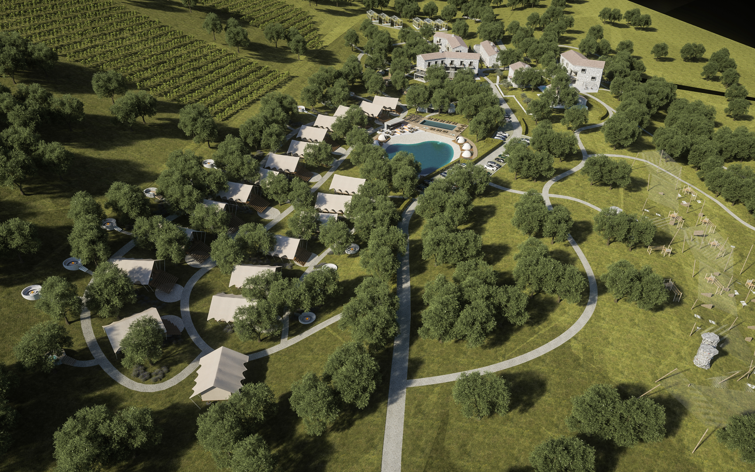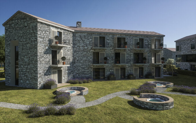 Situated in the historic Istrian town of Roč, the resort draws inspiration from the area’s cultural heritage and natural landscape. The setting is characterized by Mediterranean vegetation, traditional stone textures, and the tranquility of a rural environment — all of which contribute to the architectural language and overall atmosphere of the project.