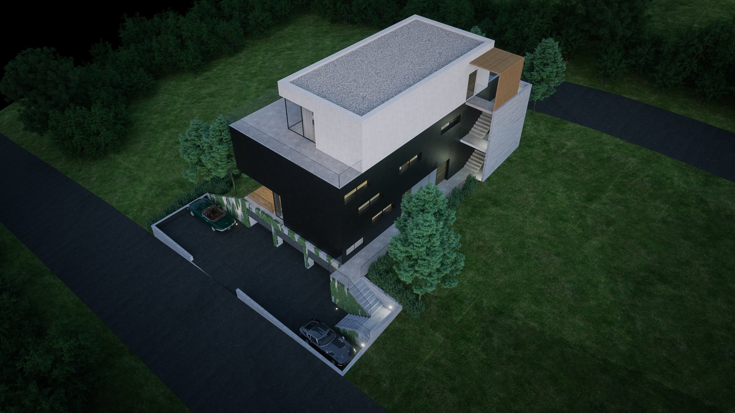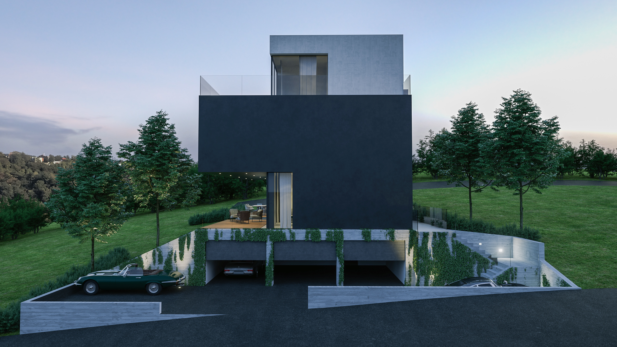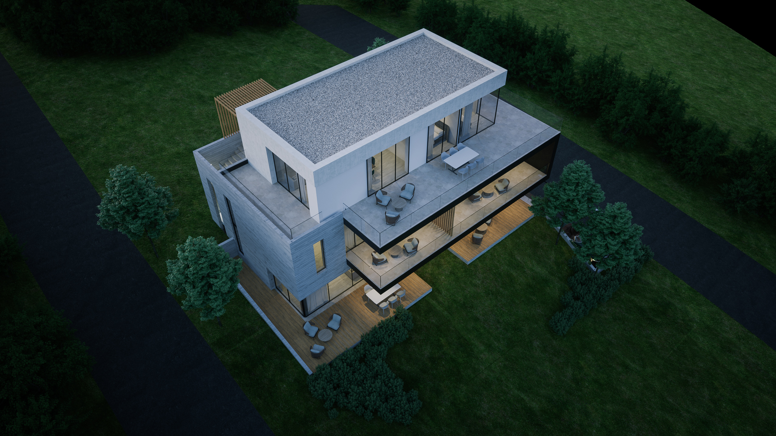 The villa’s volumetry is composed through a layered arrangement of compact cubic forms, resulting in a dynamic yet balanced silhouette. Varying heights and horizontal articulation emphasize the contemporary character of the building, while recessed areas and cantilevered elements define entrance zones, terraces, and covered outdoor spaces. The facades are designed with a minimalist approach, focusing on clean surfaces and material contrasts. A combination of light and dark facade finishes, complemented by subtle wooden accents, creates a sophisticated and warm visual identity. Large glazed openings are carefully integrated into the architectural composition, enabling strong visual connections between the interior, the garden, and the surrounding greenery.