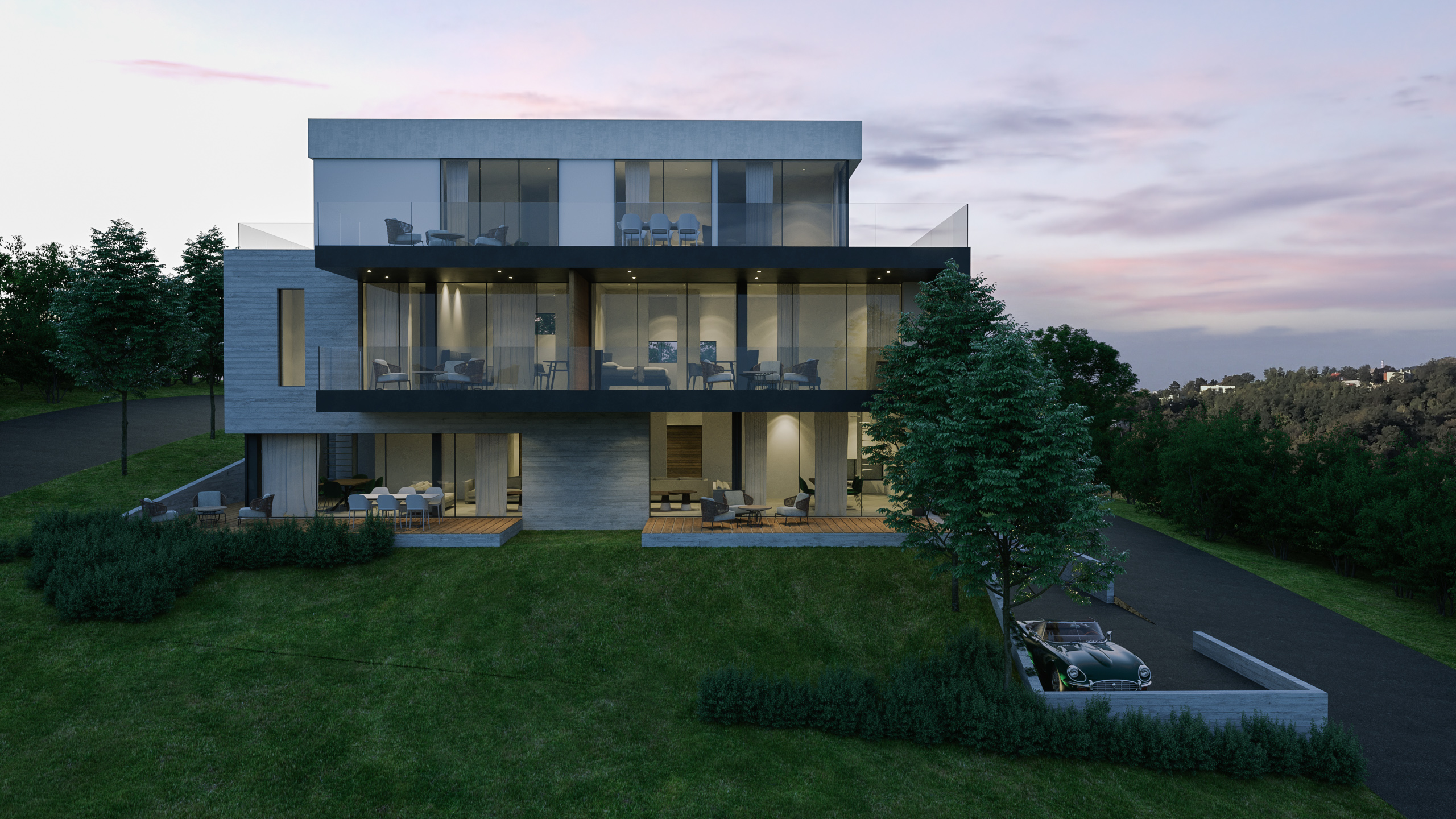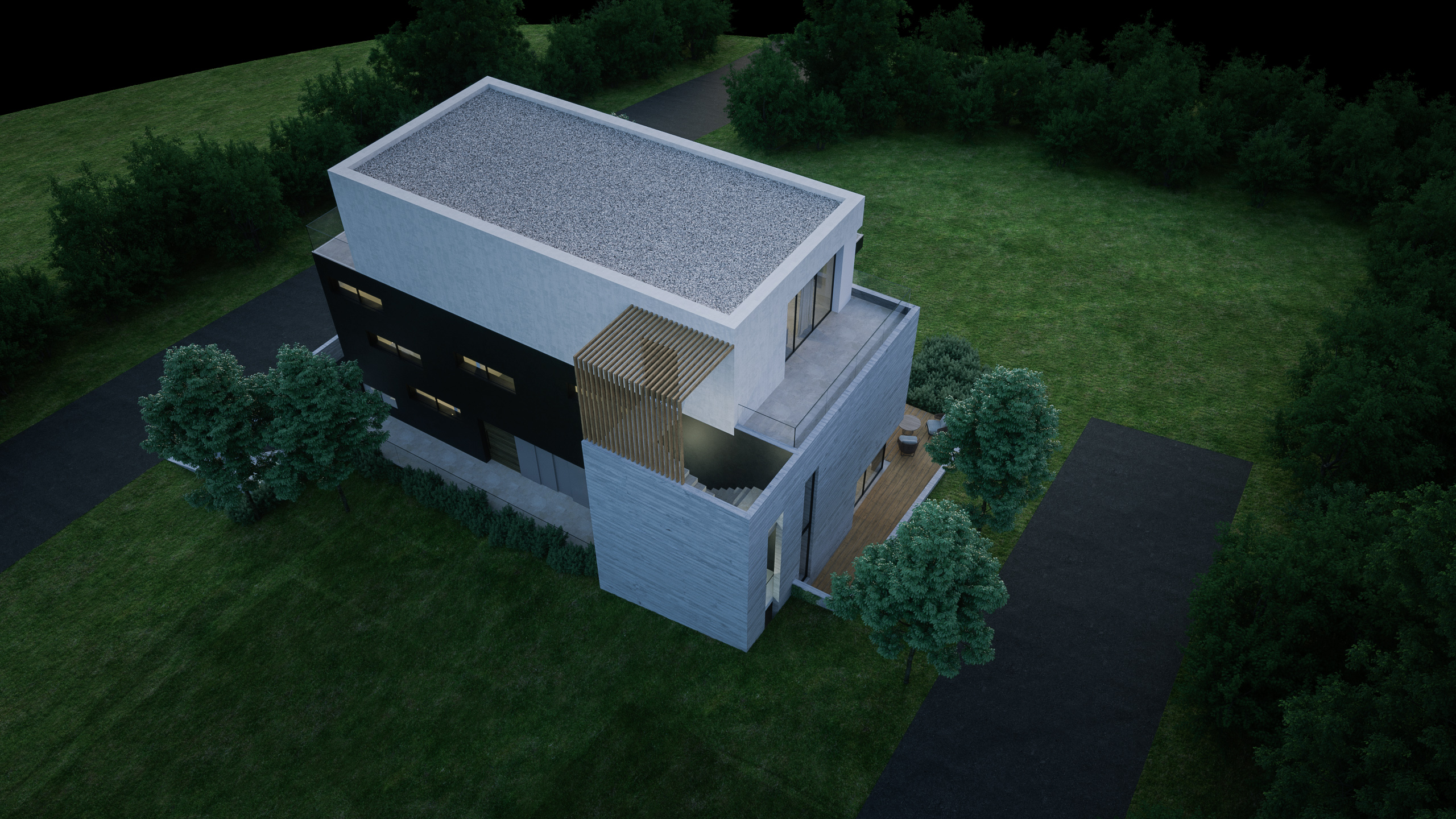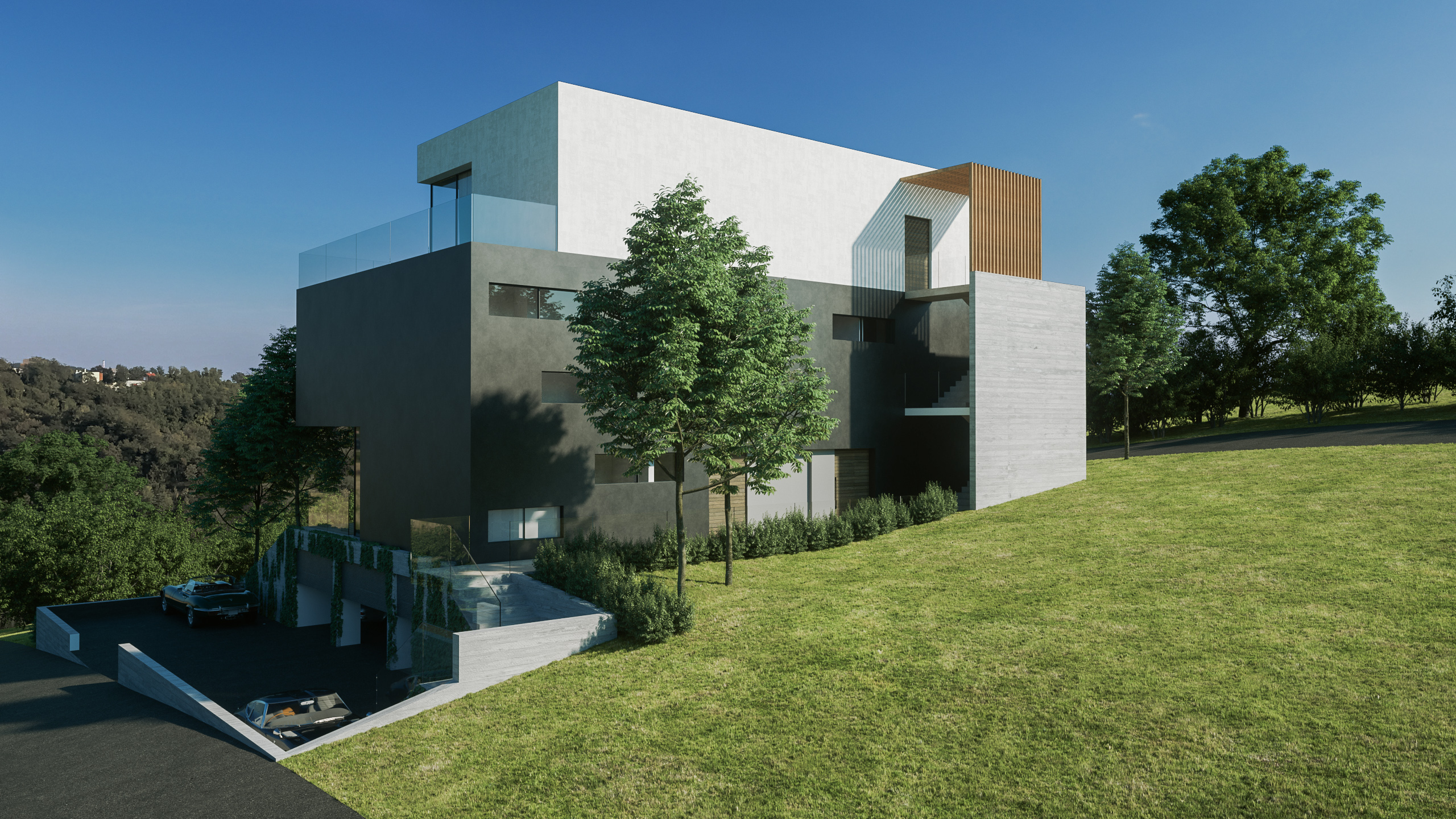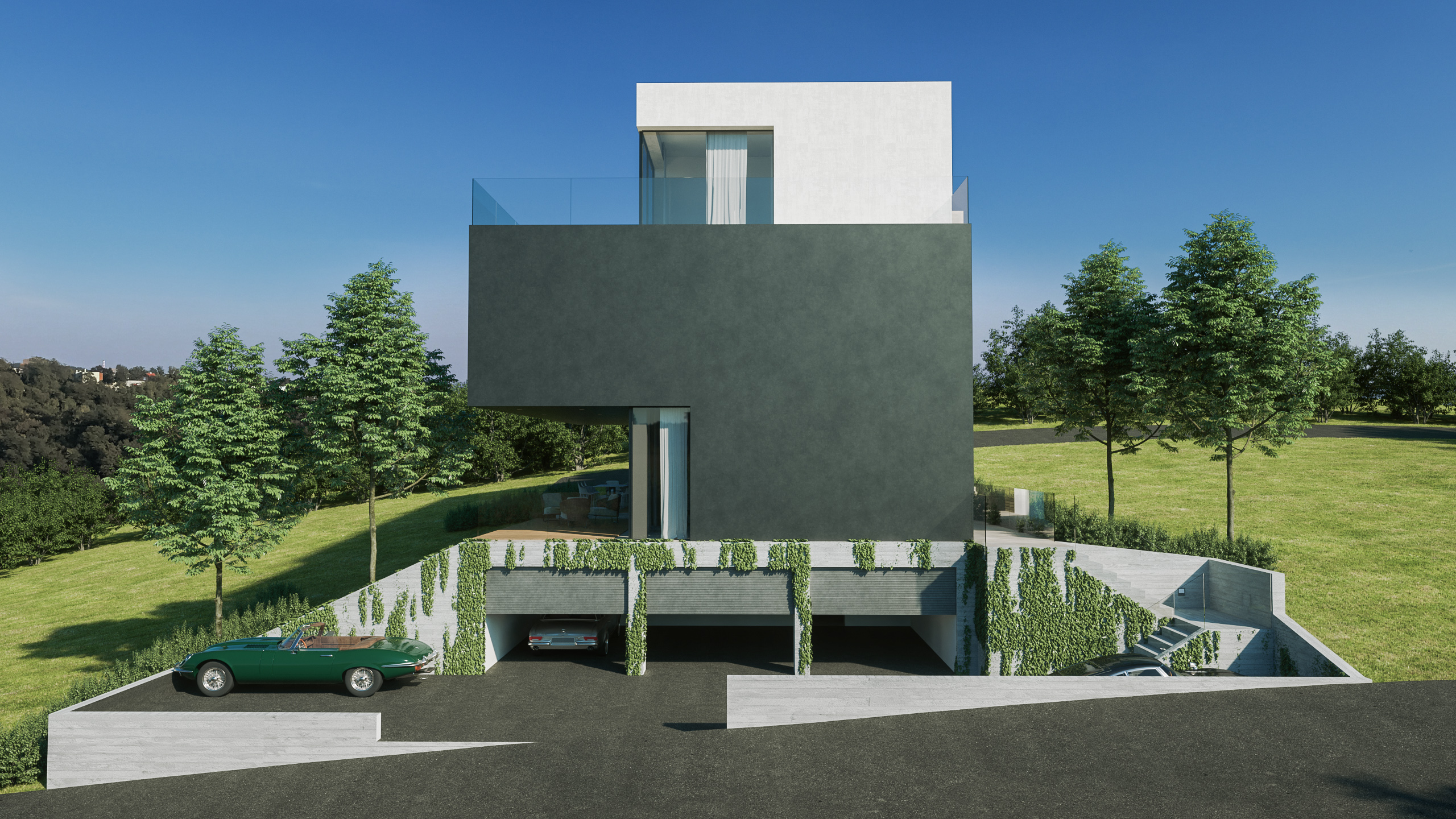 The villa’s volumetry is composed through a layered arrangement of compact cubic forms, resulting in a dynamic yet balanced silhouette. Varying heights and horizontal articulation emphasize the contemporary character of the building, while recessed areas and cantilevered elements define entrance zones, terraces, and covered outdoor spaces. The facades are designed with a minimalist approach, focusing on clean surfaces and material contrasts. A combination of light and dark facade finishes, complemented by subtle wooden accents, creates a sophisticated and warm visual identity. Large glazed openings are carefully integrated into the architectural composition, enabling strong visual connections between the interior, the garden, and the surrounding greenery.