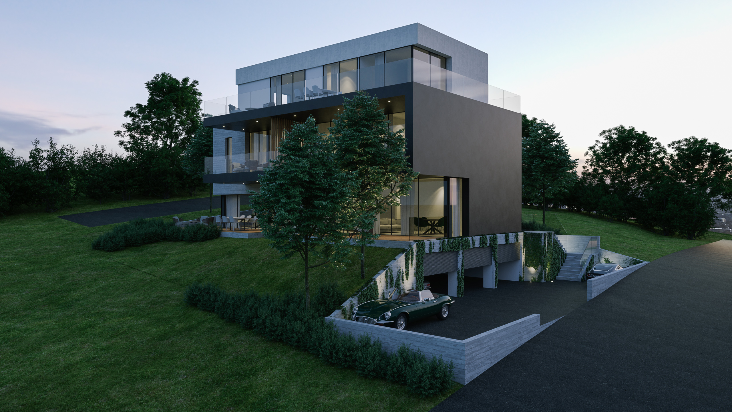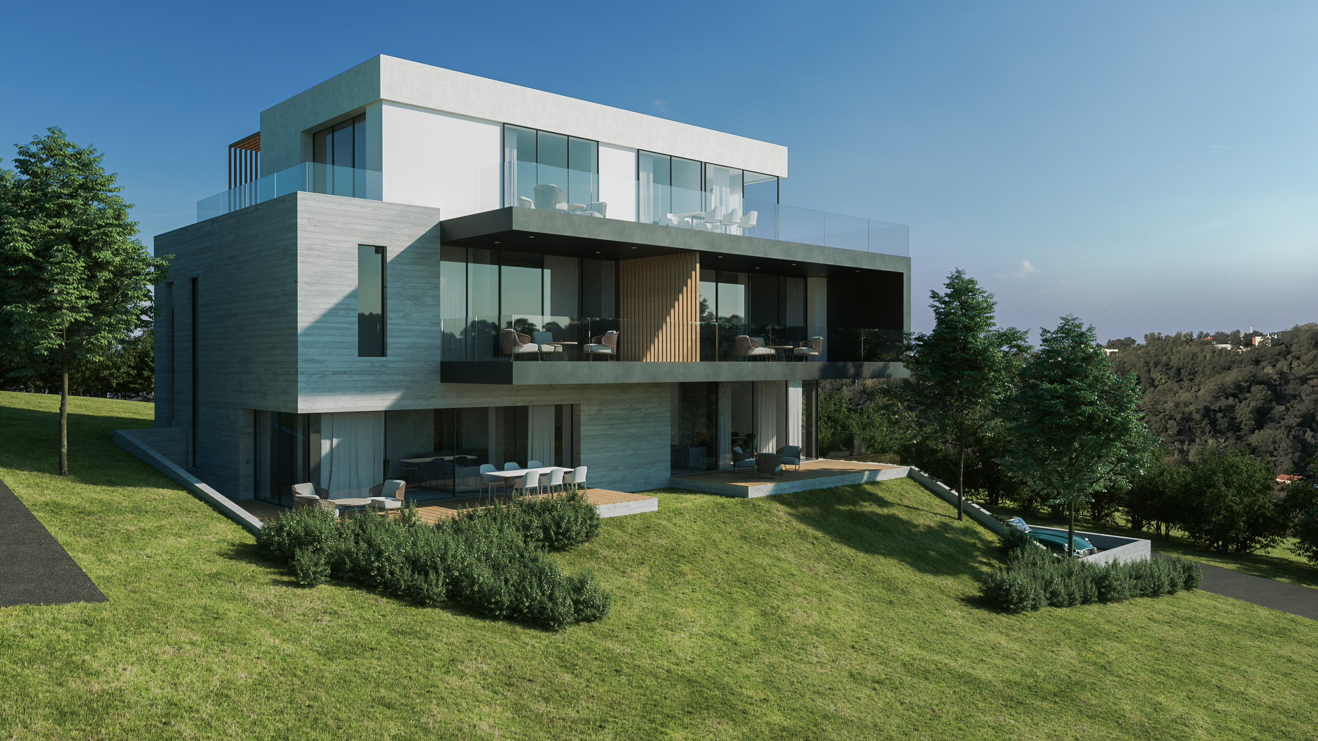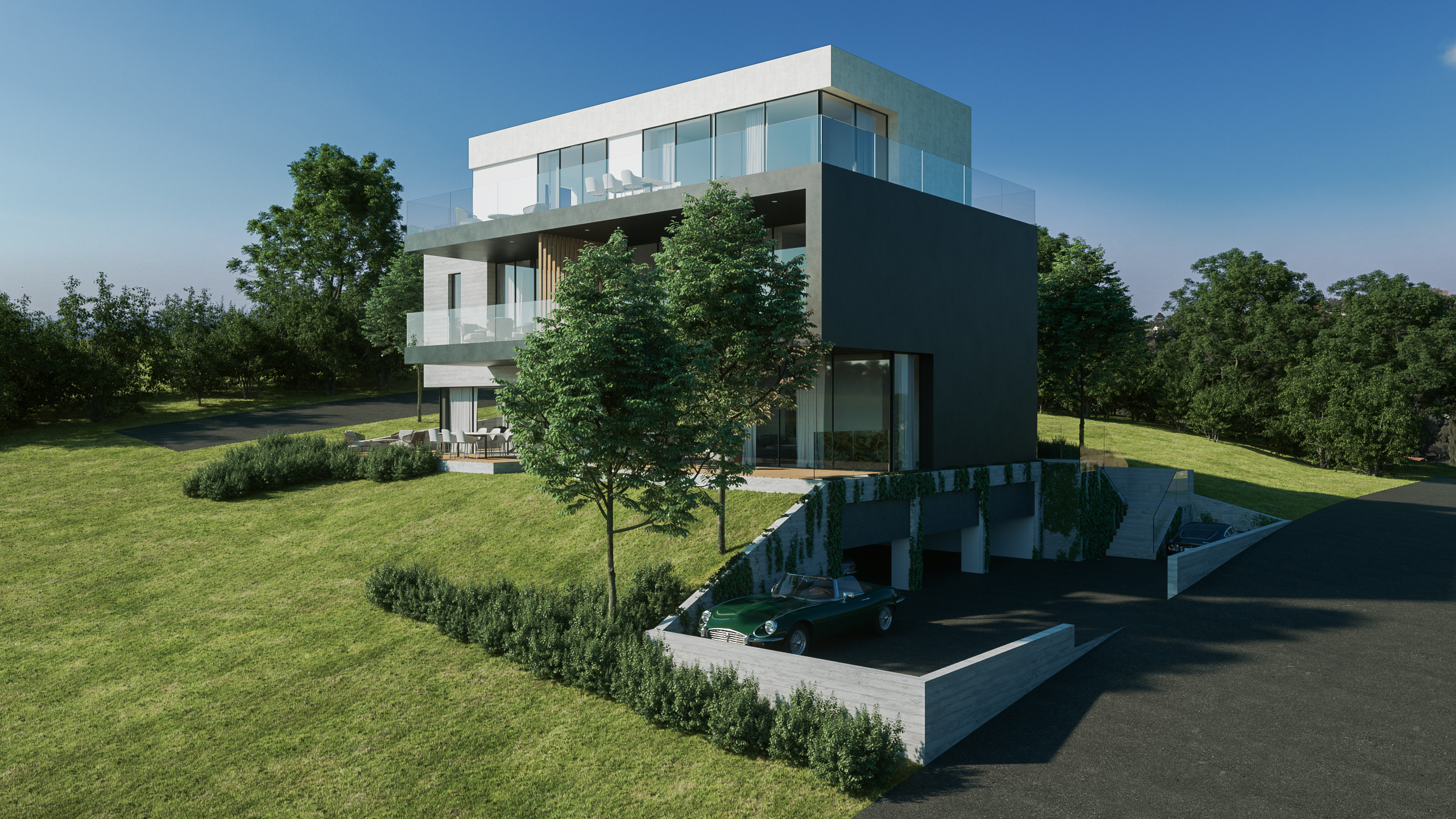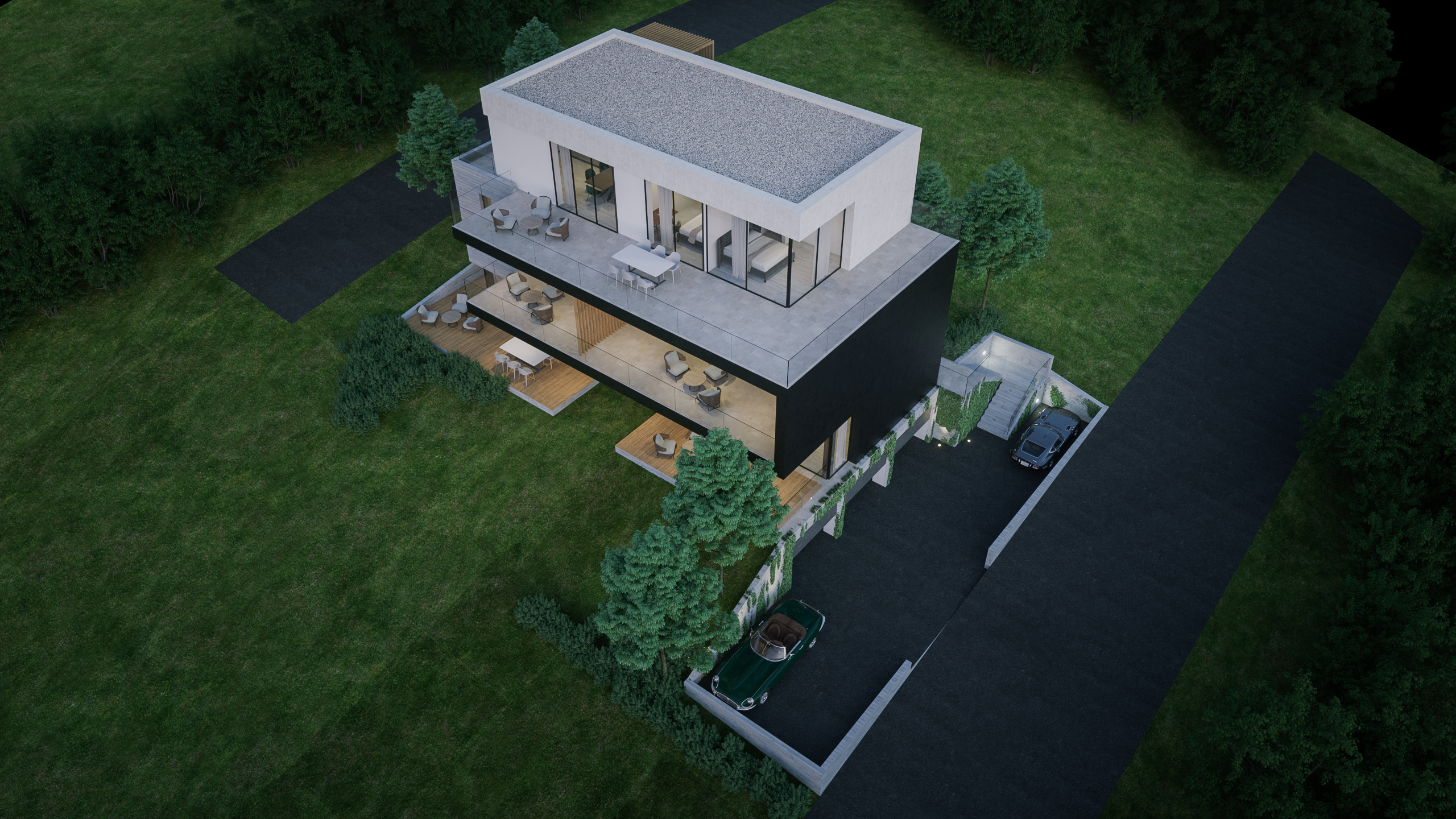 The house is adapted to the site’s gentle slope, which is used to organize the building’s levels and to form outdoor living areas on multiple terraces. Balconies and terraces naturally extend the interior spaces, while the surrounding landscape is conceived as an open green framework that enhances privacy and the tranquil character of the location. The site design follows the architectural logic of the villa – paths, access routes, and green areas are discreetly integrated into the overall composition without compromising the dominant role of the architecture. The villa is perceived as a contemporary pavilion within the landscape, clearly defined yet strongly connected to nature.