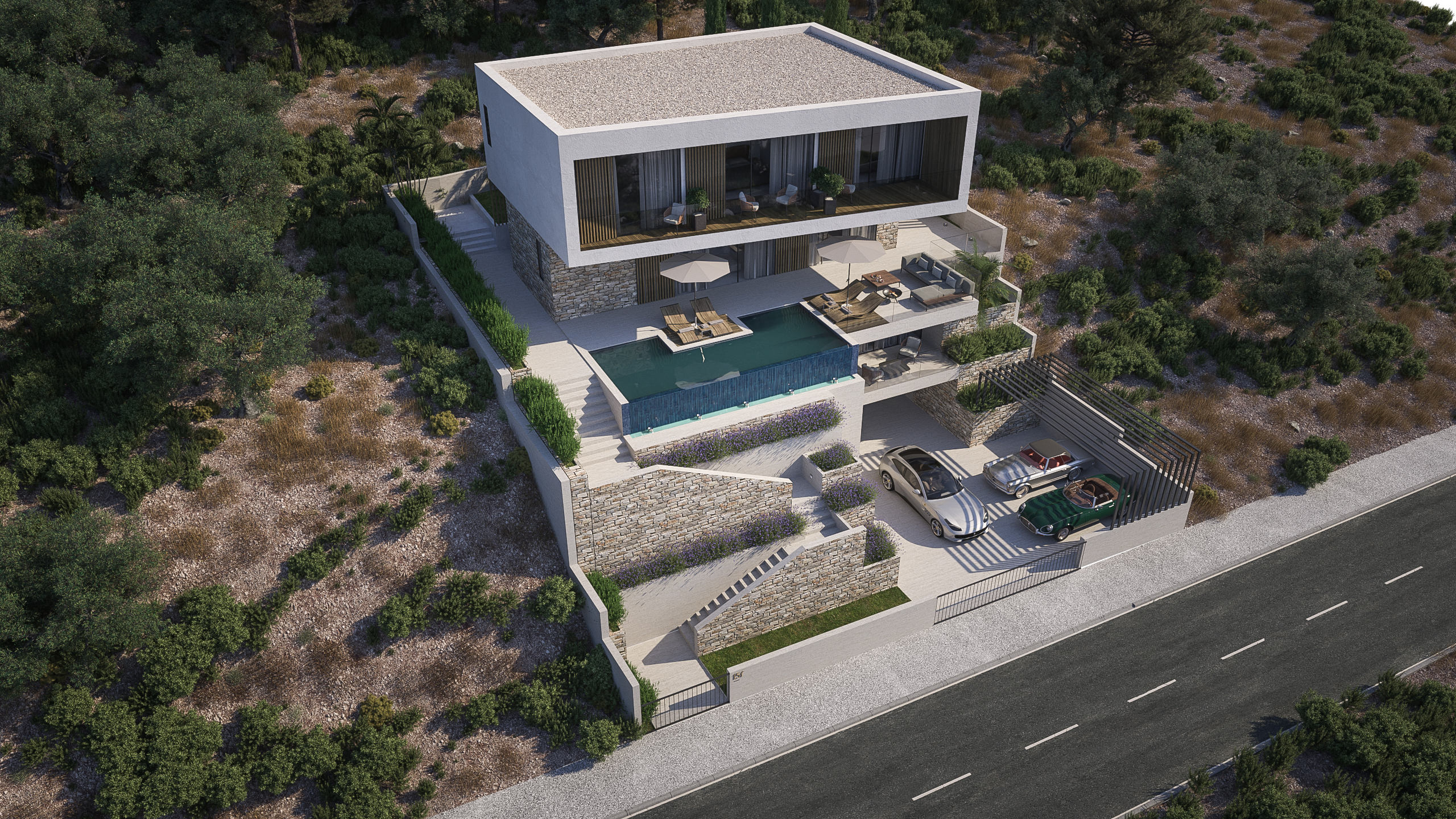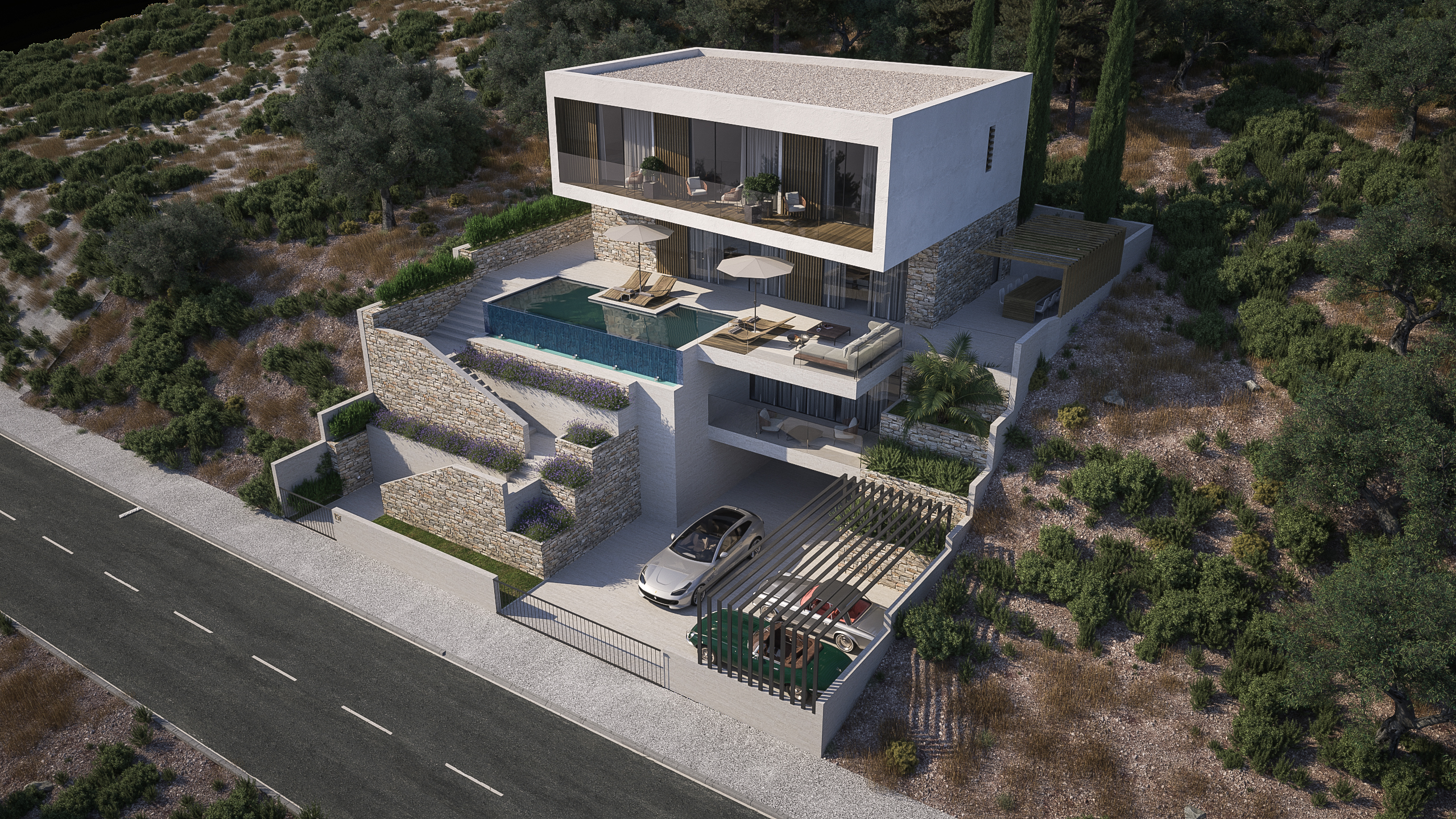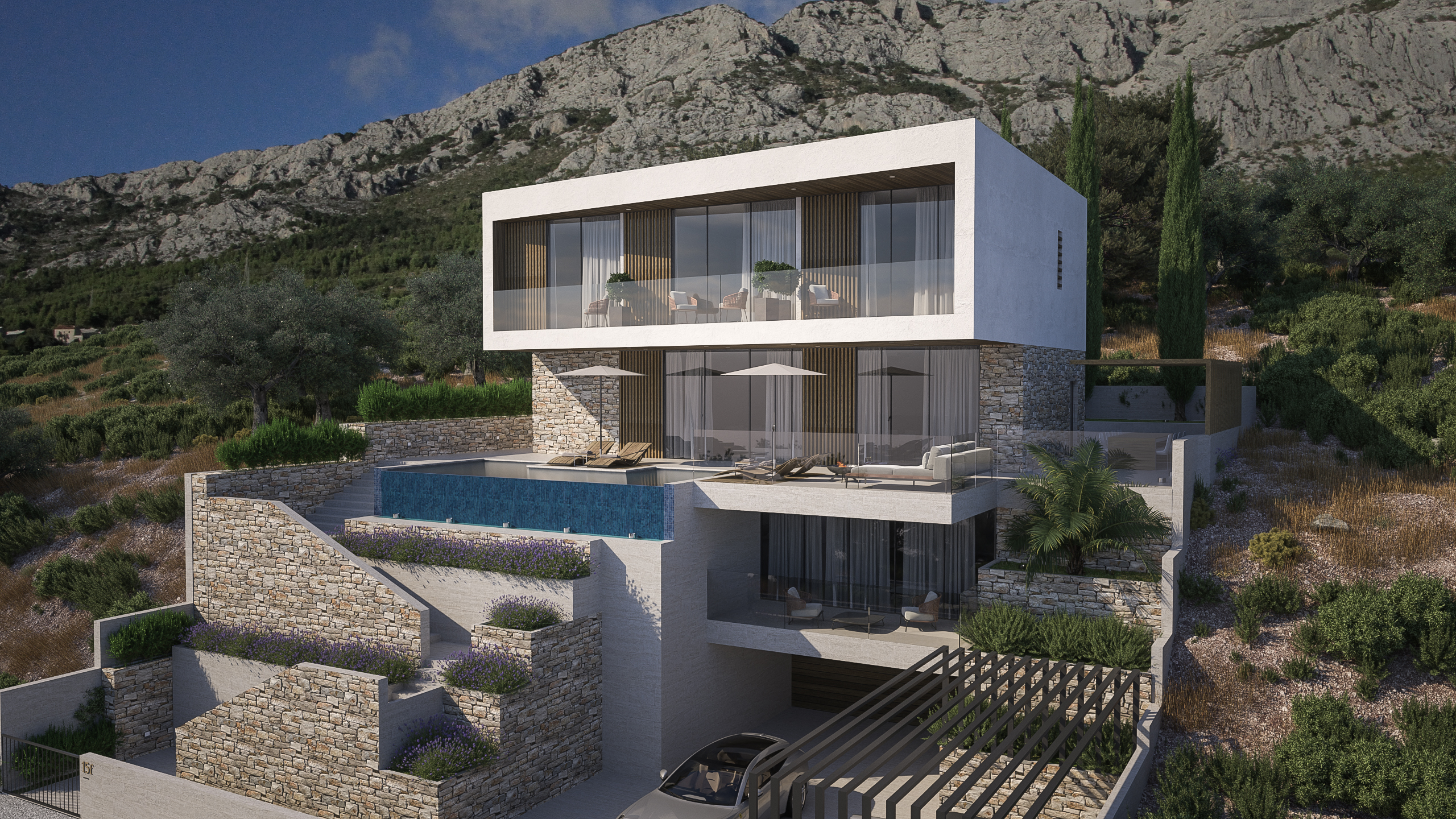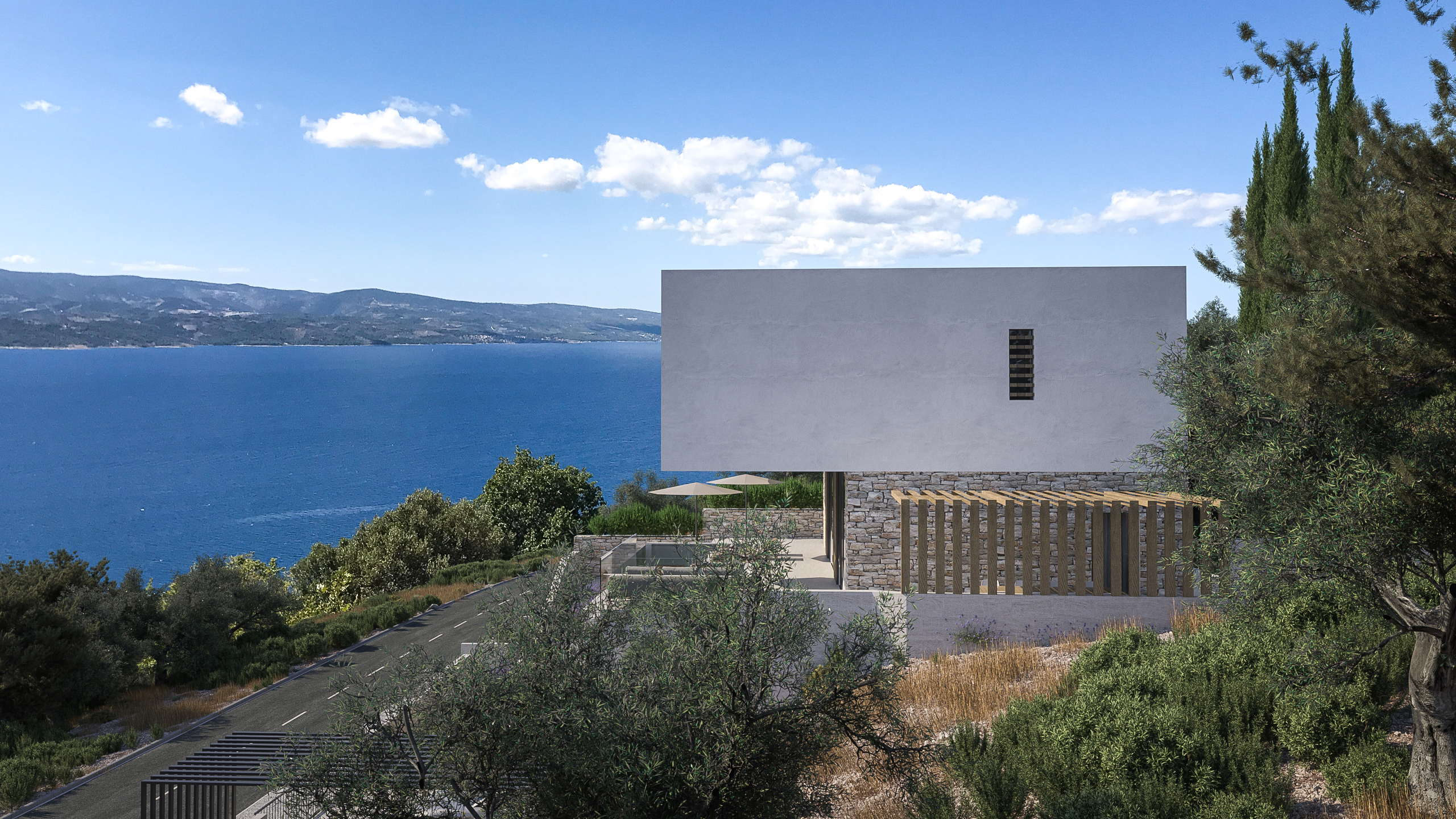 The architectural concept derives from a layered organization of volumes that follow the natural slope of the site. The building is composed as a sequence of horizontally articulated levels, creating a clear yet visually light structure. The upper volume, defined by a clean, monolithic form, appears to float above the lower levels, emphasizing the contemporary character of the villa and creating a strong architectural statement within the landscape. The facades are designed with a minimalist approach, combining smooth, light-colored surfaces with natural stone cladding. Stone walls at the lower levels establish a strong connection to the local building tradition and the terrain, while the contemporary upper volumes introduce contrast and architectural clarity. Large glazed openings provide uninterrupted sea views and allow interior spaces to open fully towards outdoor terraces.
