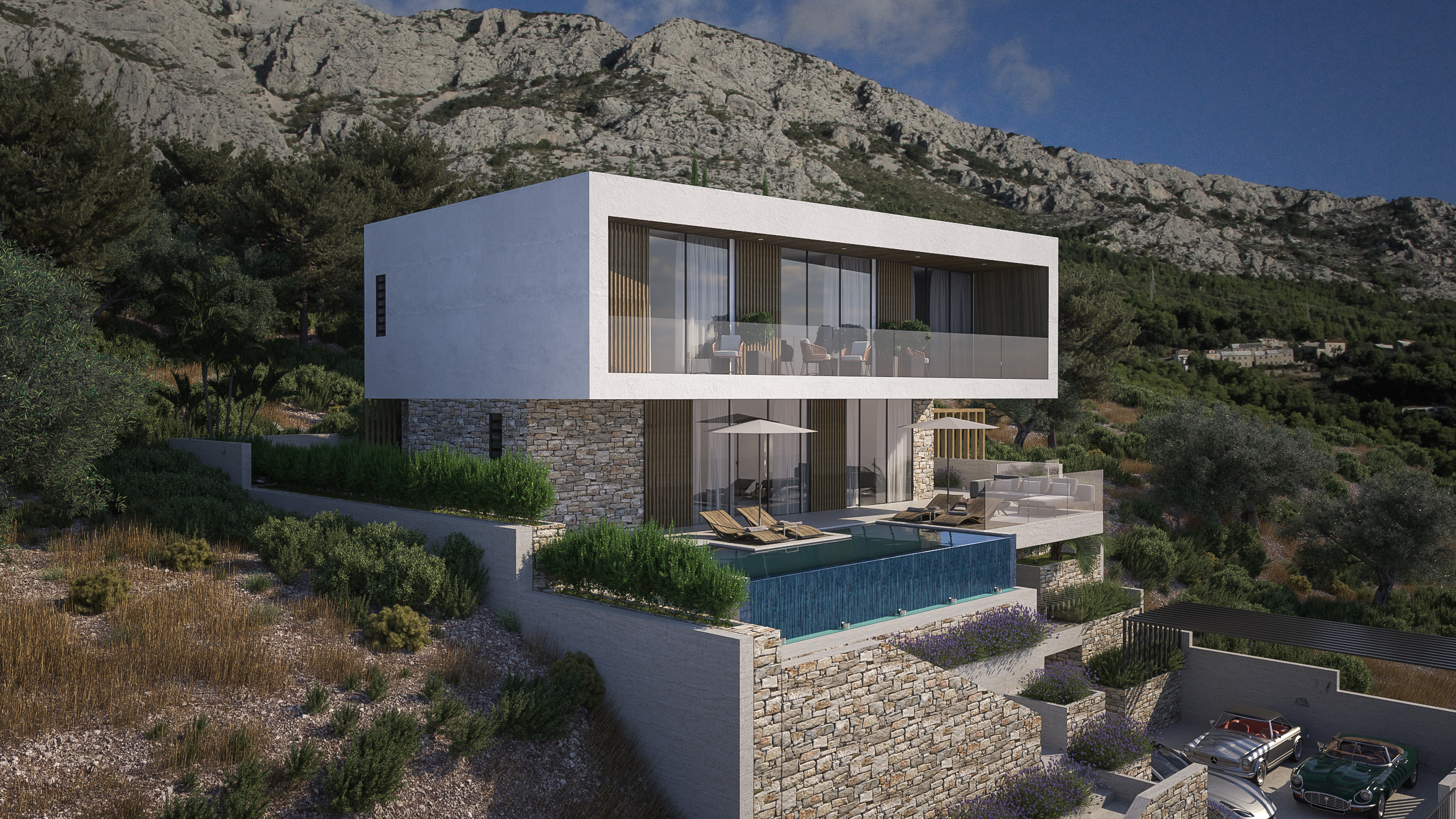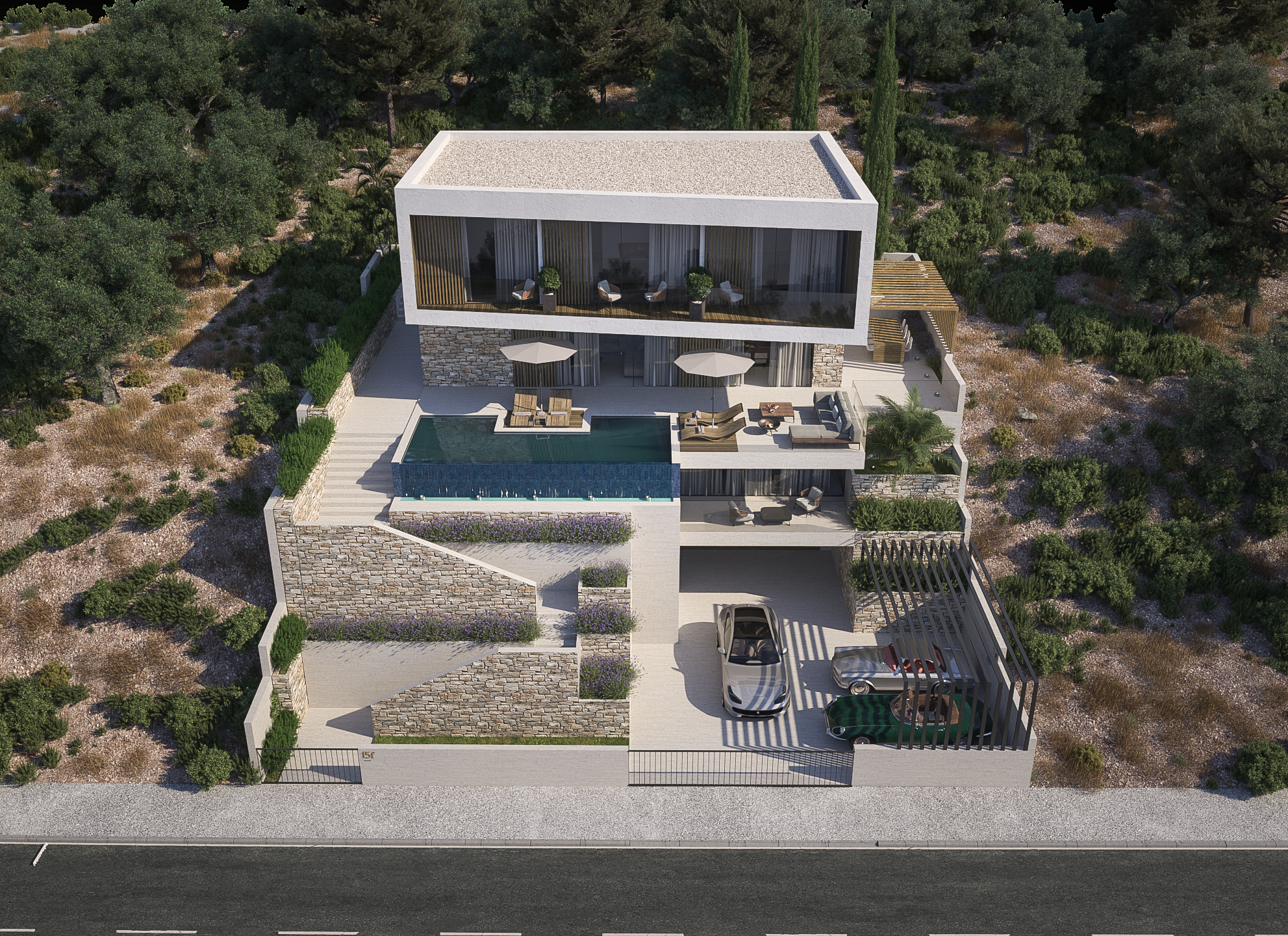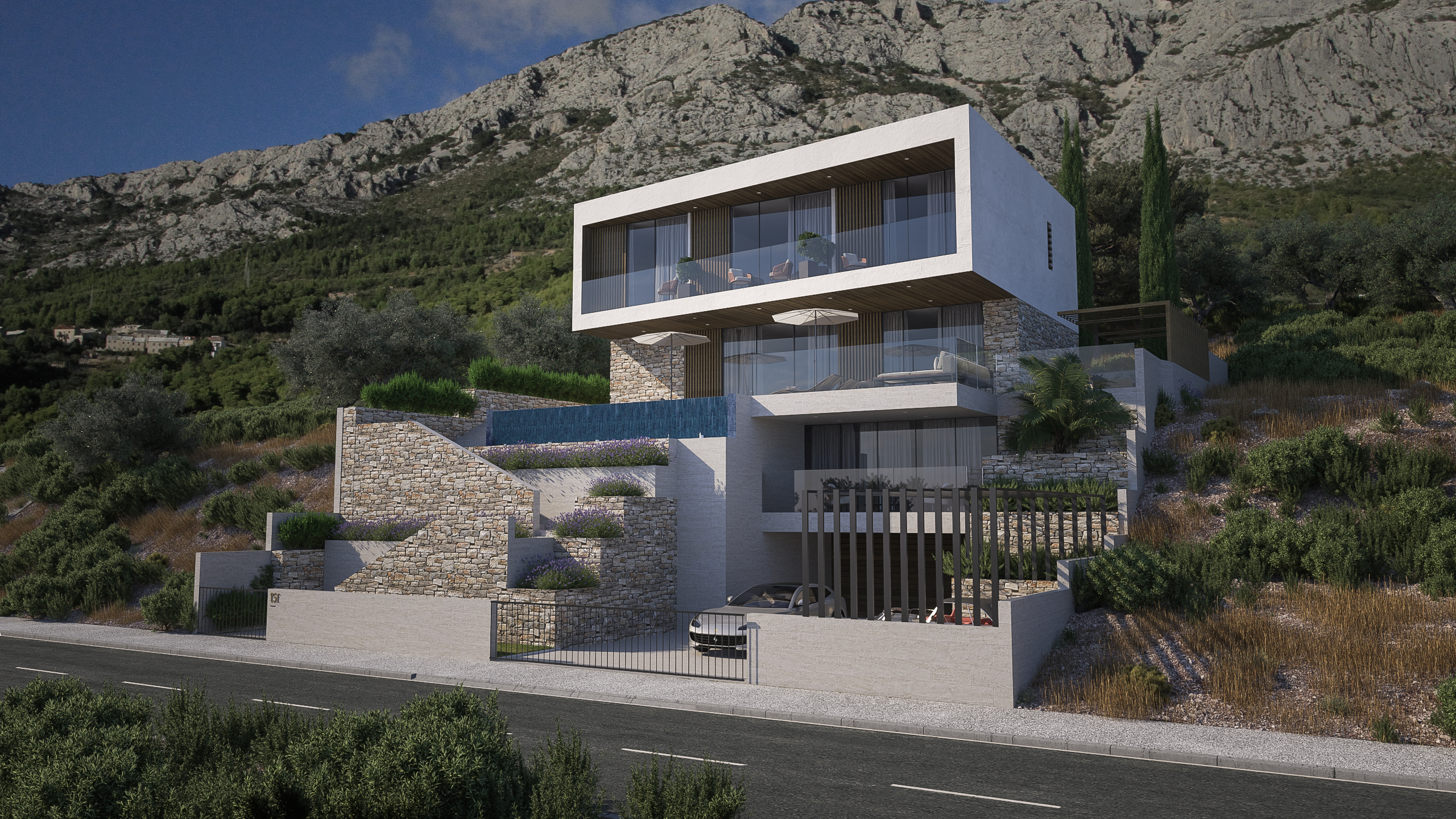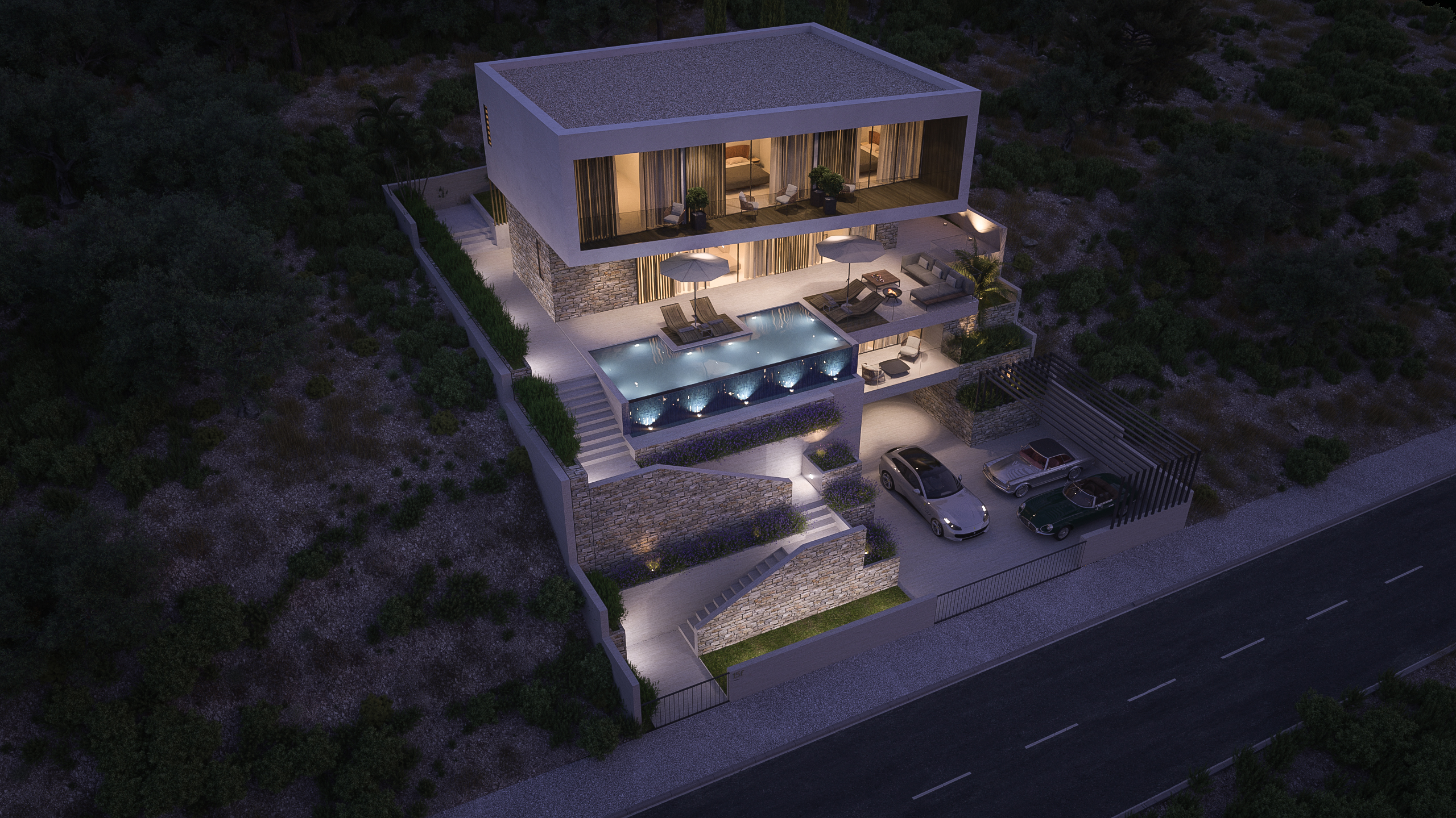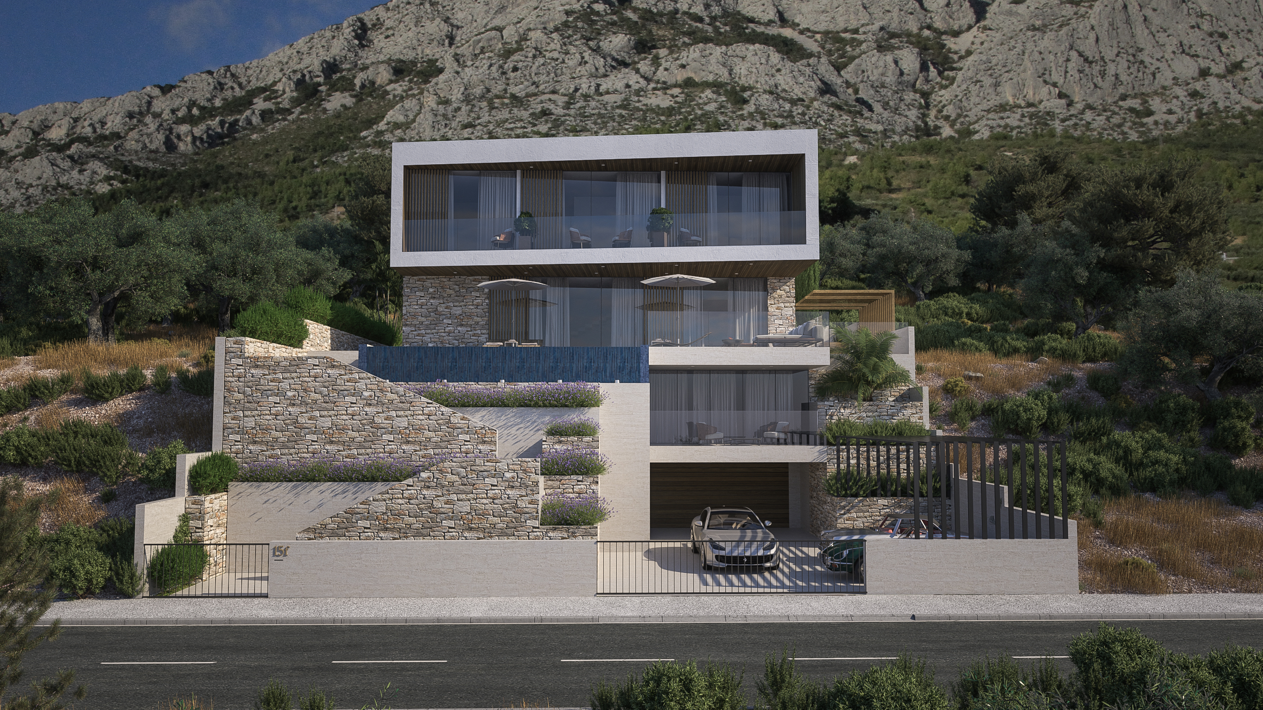 The architectural concept derives from a layered organization of volumes that follow the natural slope of the site. The building is composed as a sequence of horizontally articulated levels, creating a clear yet visually light structure. The upper volume, defined by a clean, monolithic form, appears to float above the lower levels, emphasizing the contemporary character of the villa and creating a strong architectural statement within the landscape. The facades are designed with a minimalist approach, combining smooth, light-colored surfaces with natural stone cladding. Stone walls at the lower levels establish a strong connection to the local building tradition and the terrain, while the contemporary upper volumes introduce contrast and architectural clarity. Large glazed openings provide uninterrupted sea views and allow interior spaces to open fully towards outdoor terraces.