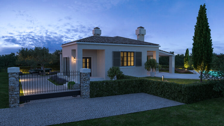 Set within the Mediterranean setting of Skrbčići, characterized by natural topography and open views, the villa responds through strategic volume positioning and precise orientation of openings. The composition directs views toward the surrounding landscape while ensuring privacy and optimal microclimatic conditions.