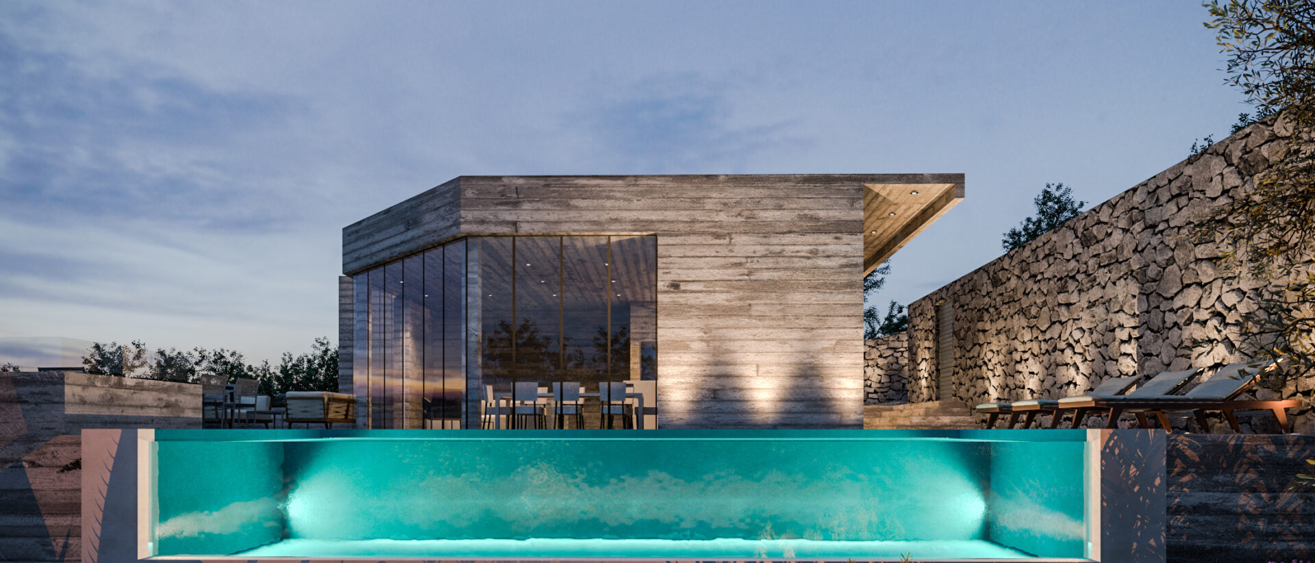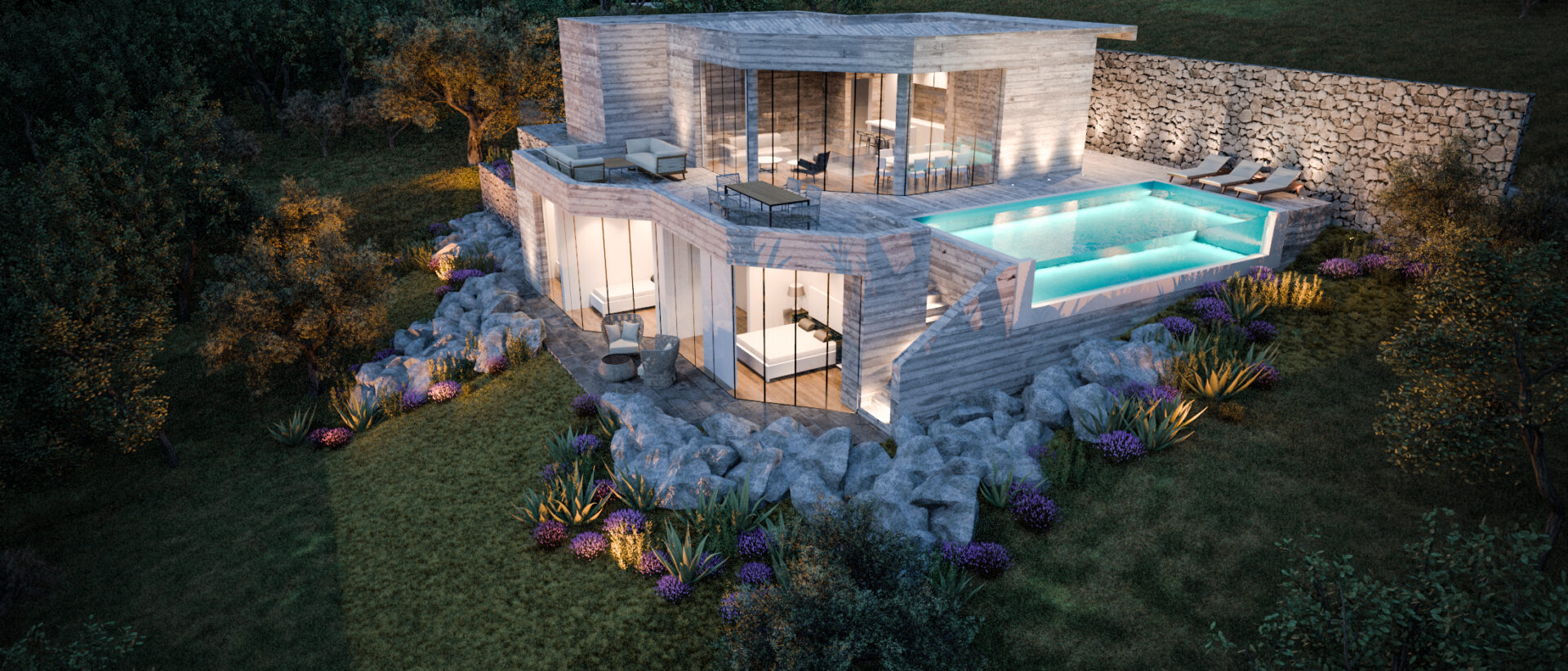 The material palette is rooted in natural and locally recognizable materials. Stone retaining walls and cladding reference the traditional architecture of the Island of Krk, while exposed concrete surfaces and large glazed openings introduce a contemporary contrast. The balance between solid and transparent elements results in a refined and timeless architectural expression.